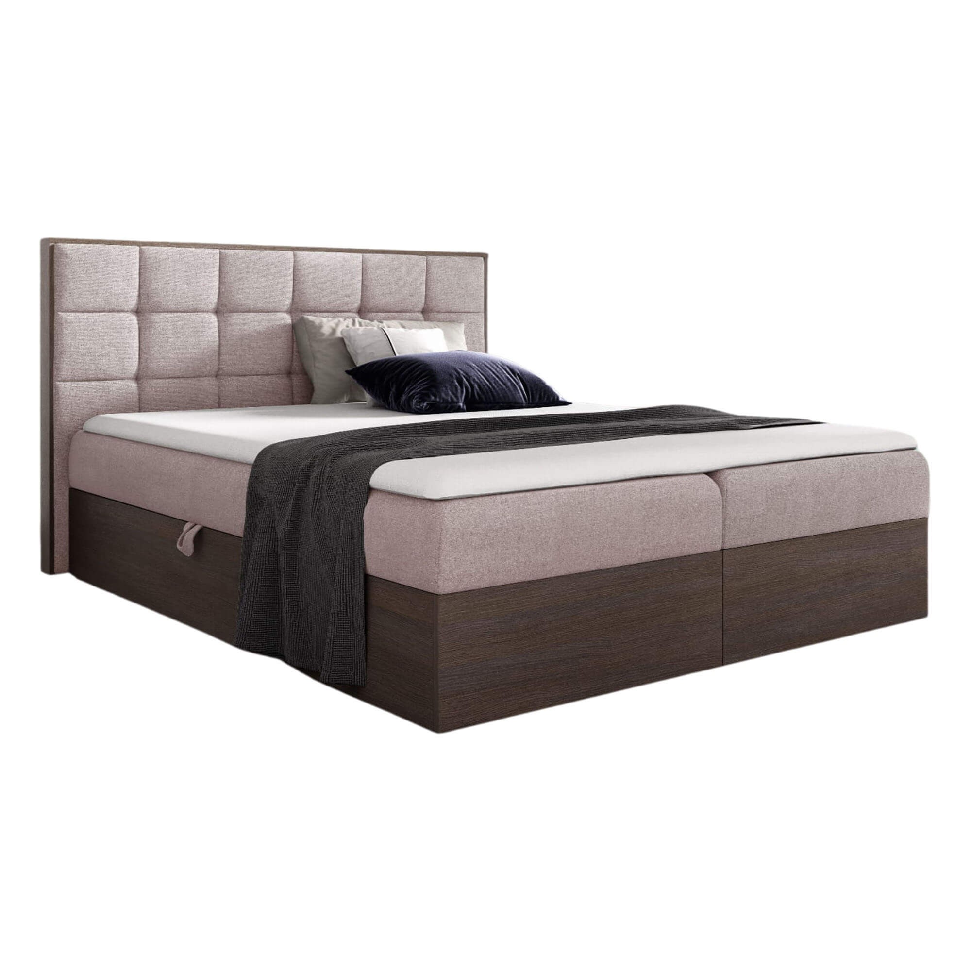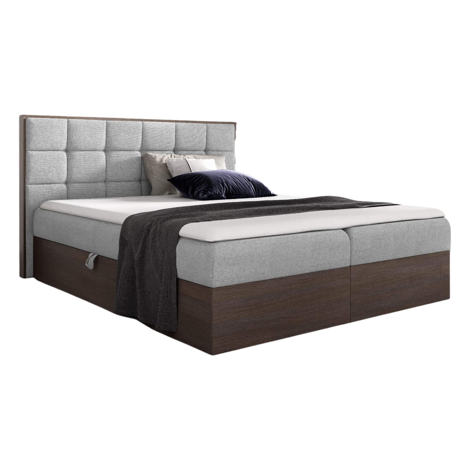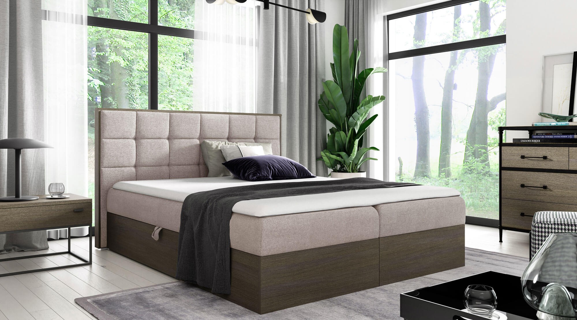 Łóżko kontynentalne WOOD 1 w kolorze dąb ciemny to połączenie wygody, elegancji i funkcjonalnych rozwiązań. Dzięki dużej powierzchni spania 160x200 cm zapewnia komfortowy sen zarówno dla jednej osoby, jak i dla pary. Dwa pojemniki na pościel pozwalają w prosty sposób utrzymać porządek w sypialni, a zastosowane automaty sprężynowe ułatwiają otwieranie, czyniąc korzystanie z nich szybkim i wygodnym. Materac bonellowy zapewnia trwałość i elastyczne podparcie ciała, a topper z pianki T25 o wysokości 4 cm dodaje miękkości, zwiększając komfort wypoczynku. Brak tradycyjnych nóżek nadaje łóżku nowoczesny charakter, a plastikowe ślizgi chronią podłogę i ułatwiają przesuwanie mebla. Zagłowie oraz skrzynie wykonane z solidnej płyty laminowanej w odcieniu dąb ciemny nadają całości elegancki i naturalny wygląd. Dzięki możliwości wyboru koloru tapicerki łóżko WOOD 1 można dopasować do każdego wnętrza – od klasycznego po nowoczesne. To mebel, który łączy estetykę z praktycznością, zapewniając komfortowy sen i stylowy wygląd sypialni.