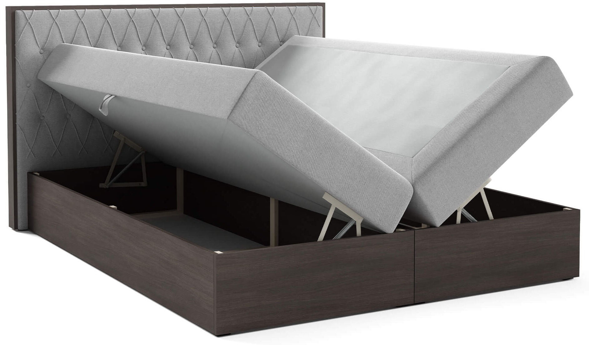 Łóżko kontynentalne WOOD 6 w kolorze dąb ciemny to elegancki i funkcjonalny mebel, który doskonale sprawdzi się w nowoczesnej sypialni. Powierzchnia spania 160x200 cm zapewnia wysoki komfort zarówno dla jednej osoby, jak i dla pary. Dwa duże pojemniki na pościel to praktyczne rozwiązanie, które pozwala zaoszczędzić miejsce i utrzymać porządek w pokoju. Dzięki automatom na sprężynach otwieranie pojemników jest łatwe i bez wysiłku. Materac bonellowy gwarantuje odpowiednie podparcie ciała i długą żywotność, a topper z pianki T25 o grubości 4 cm zwiększa wygodę snu, dopasowując się do sylwetki użytkownika. Brak tradycyjnych nóżek sprawia, że łóżko prezentuje się nowocześnie i stabilnie – zastosowane plastikowe ślizgi ułatwiają jego przestawianie. Solidne wykonanie z płyty laminowanej w kolorze dąb ciemny nadaje całości przytulny, naturalny wygląd, a możliwość wyboru tapicerki pozwala dopasować łóżko do stylu wnętrza. WOOD 6 to połączenie nowoczesnego designu, wygody i funkcjonalności, które zapewnia komfortowy sen i elegancki wygląd sypialni.