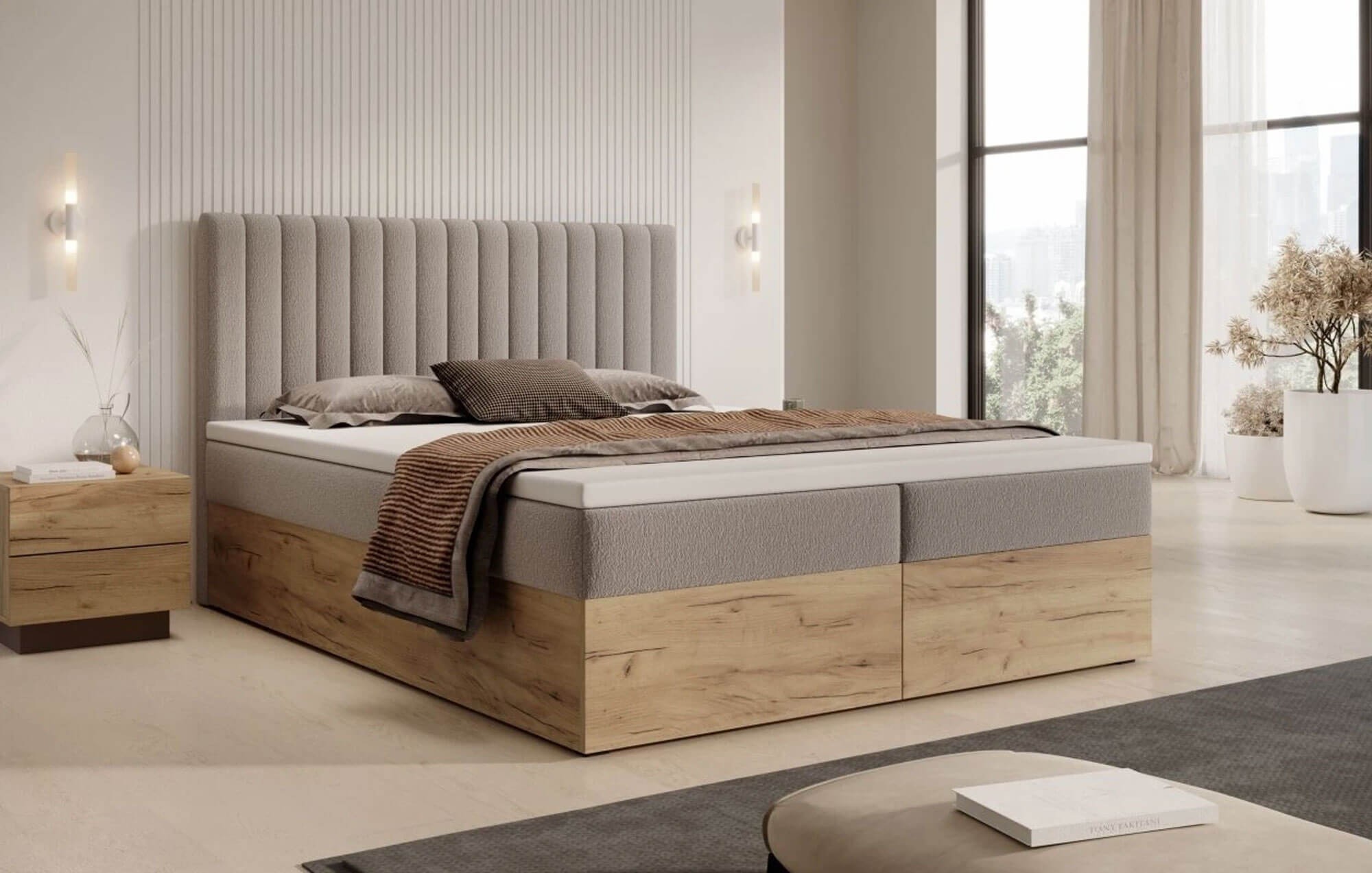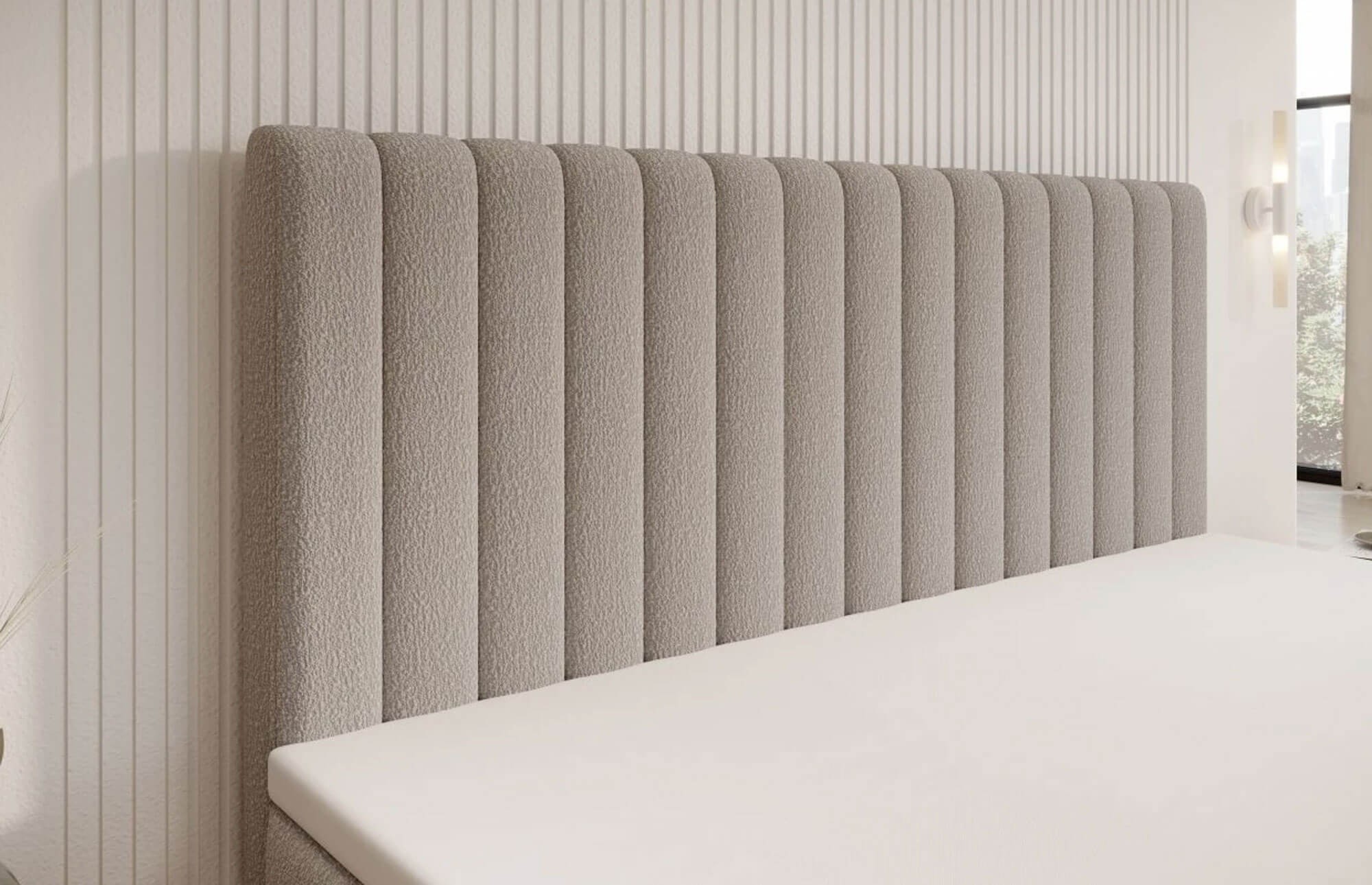 Łóżko kontynentalne z pojemnikiem CAMILA 160x200 to elegancki mebel stworzony z myślą o osobach ceniących komfort i nowoczesny wygląd. Jego ozdobny zagłówek z pionowymi przeszyciami nadaje wnętrzu stylu i charakteru, tworząc przytulną atmosferę w sypialni.