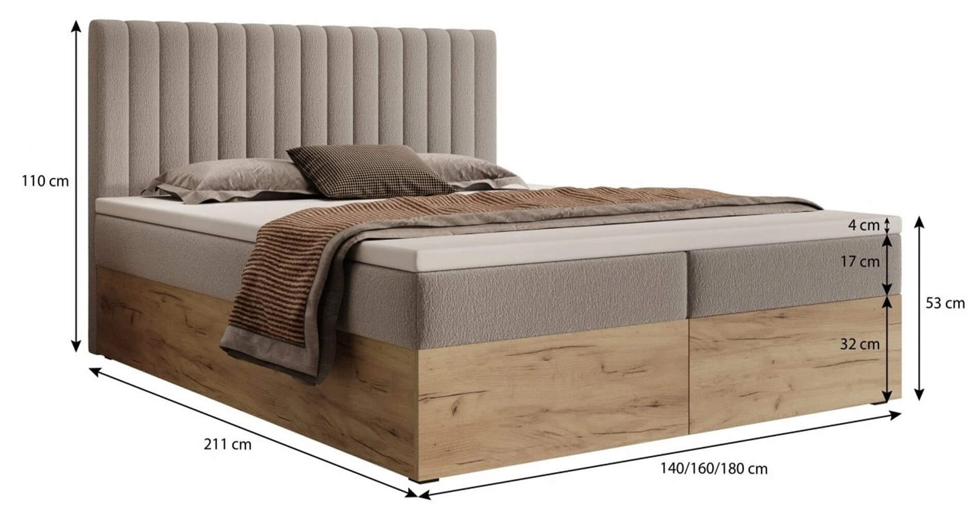 Wysoka powierzchnia spania, położona około 55 cm nad podłogą, zapewnia wygodne wstawanie i idealne warunki do odpoczynku. CAMILA 160x200 to nowoczesne łóżko kontynentalne, które łączy funkcjonalność z elegancją, stanowiąc doskonały wybór do każdej stylowej sypialni.