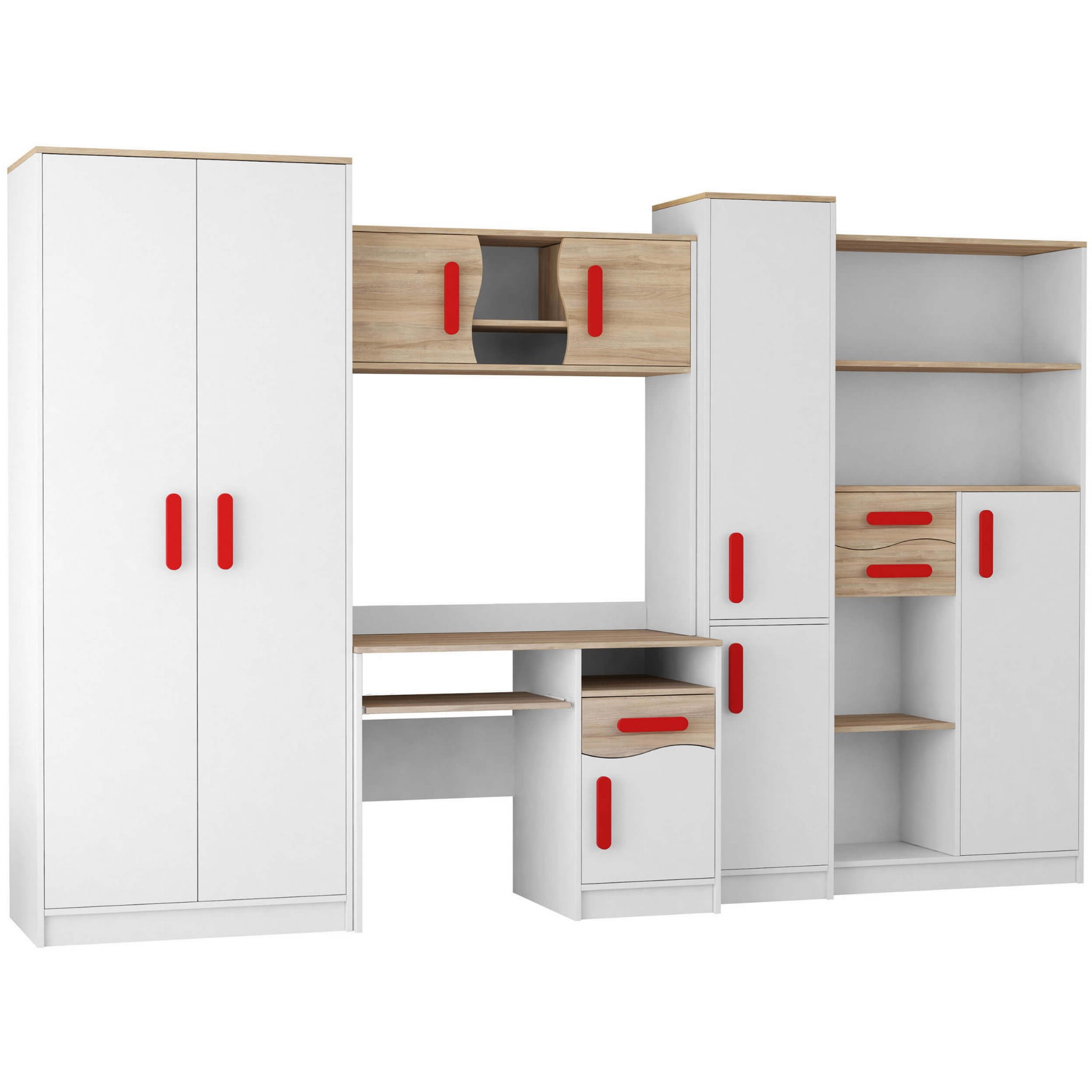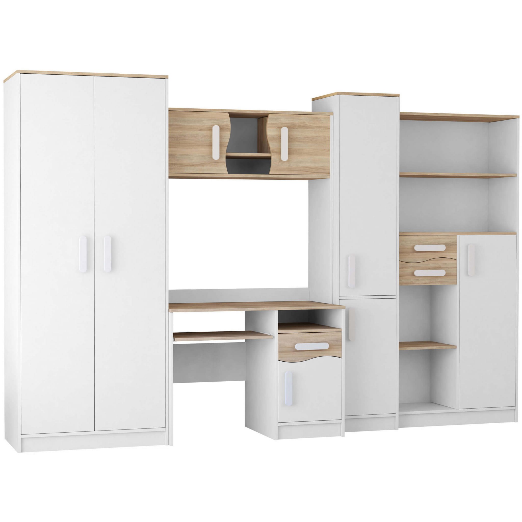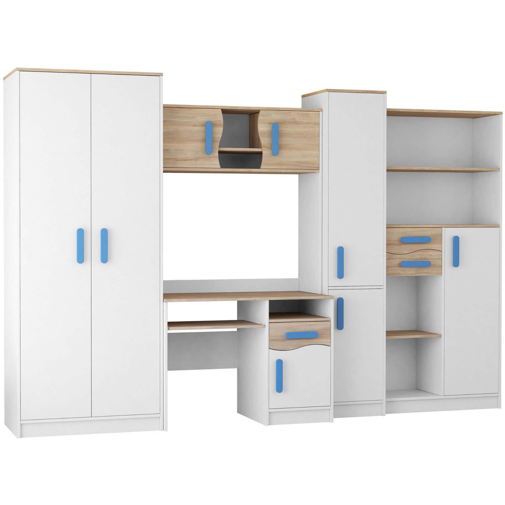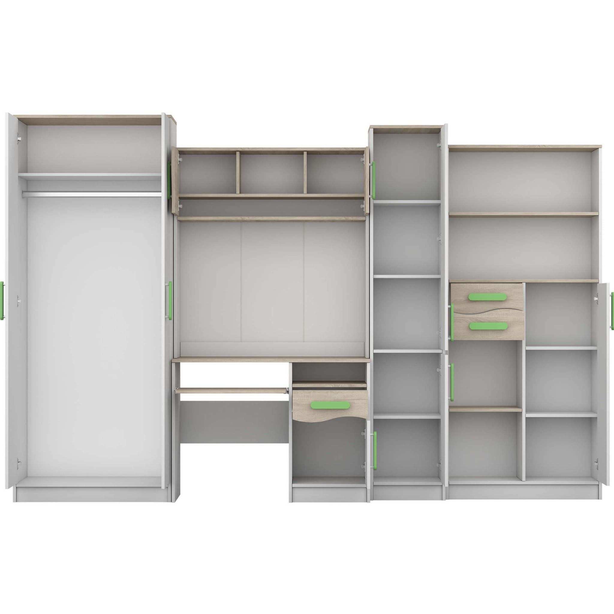 W skład zestawu wchodzi również dwudrzwiowa szafa, która wewnątrz posiada półkę oraz drążek na ubrania. Dodatkowo, zestaw obejmuje dwa regały z szufladami i szafkami z półkami.