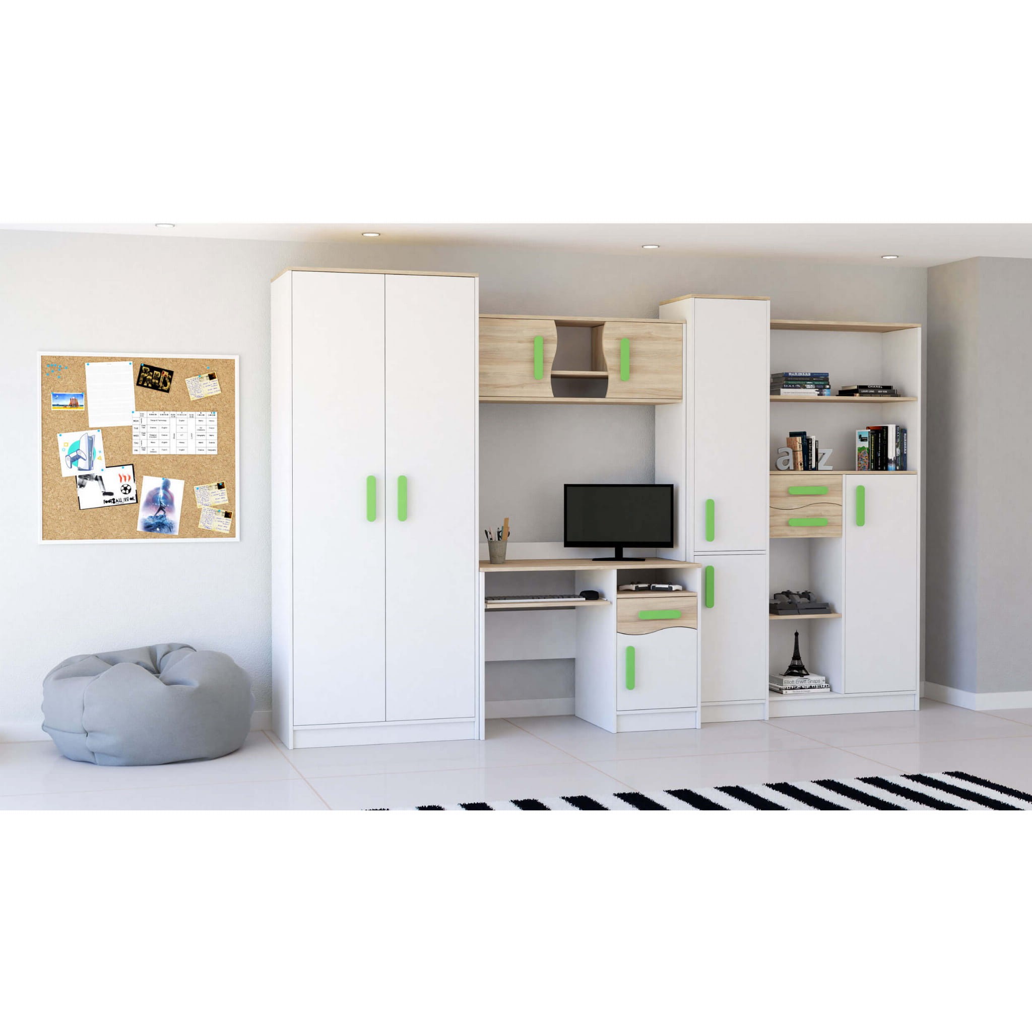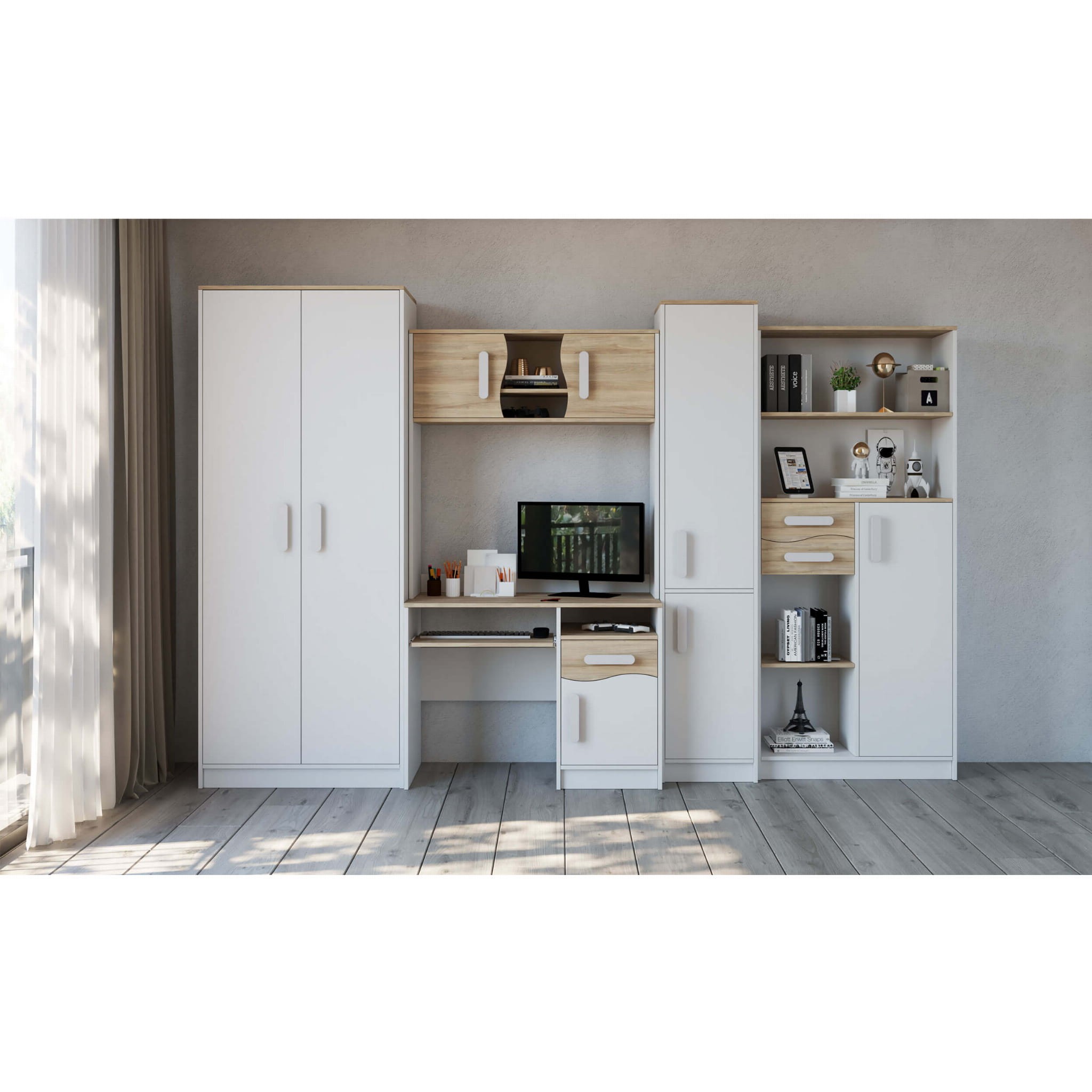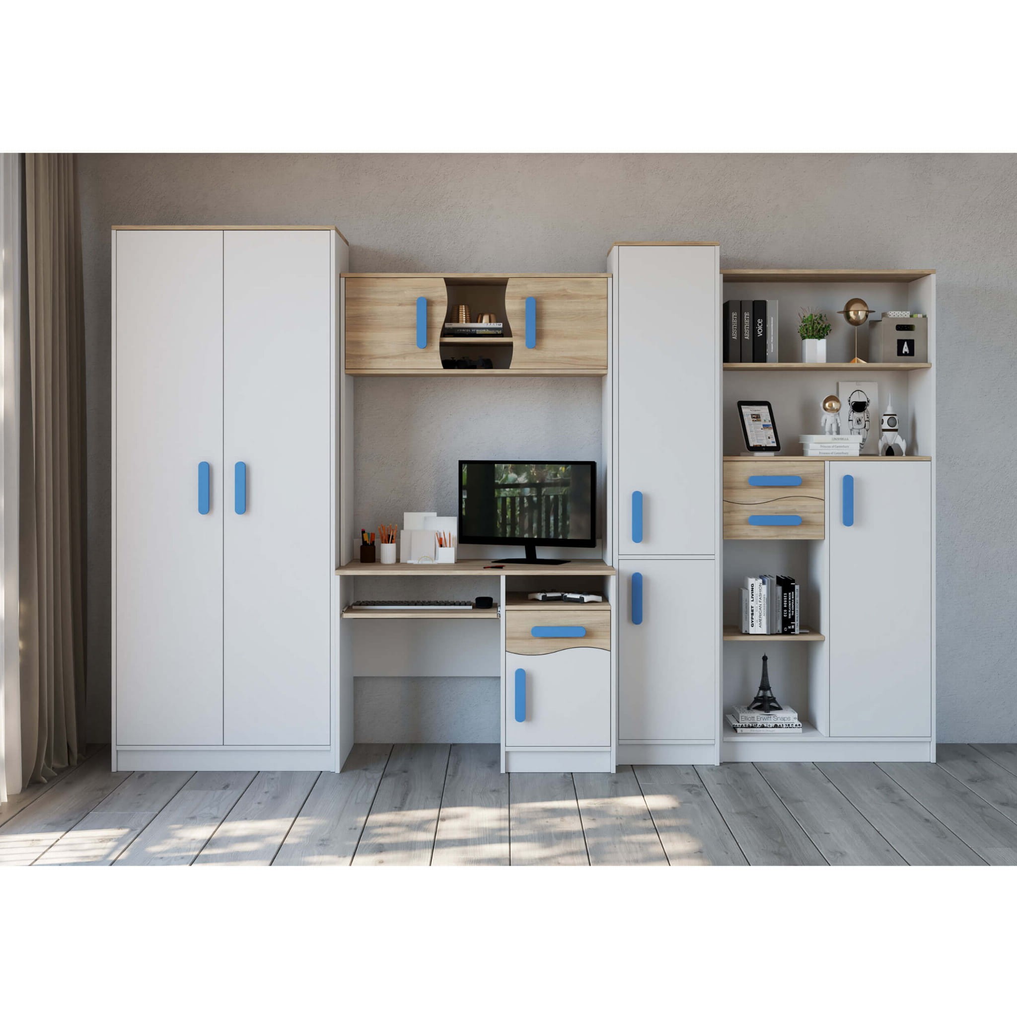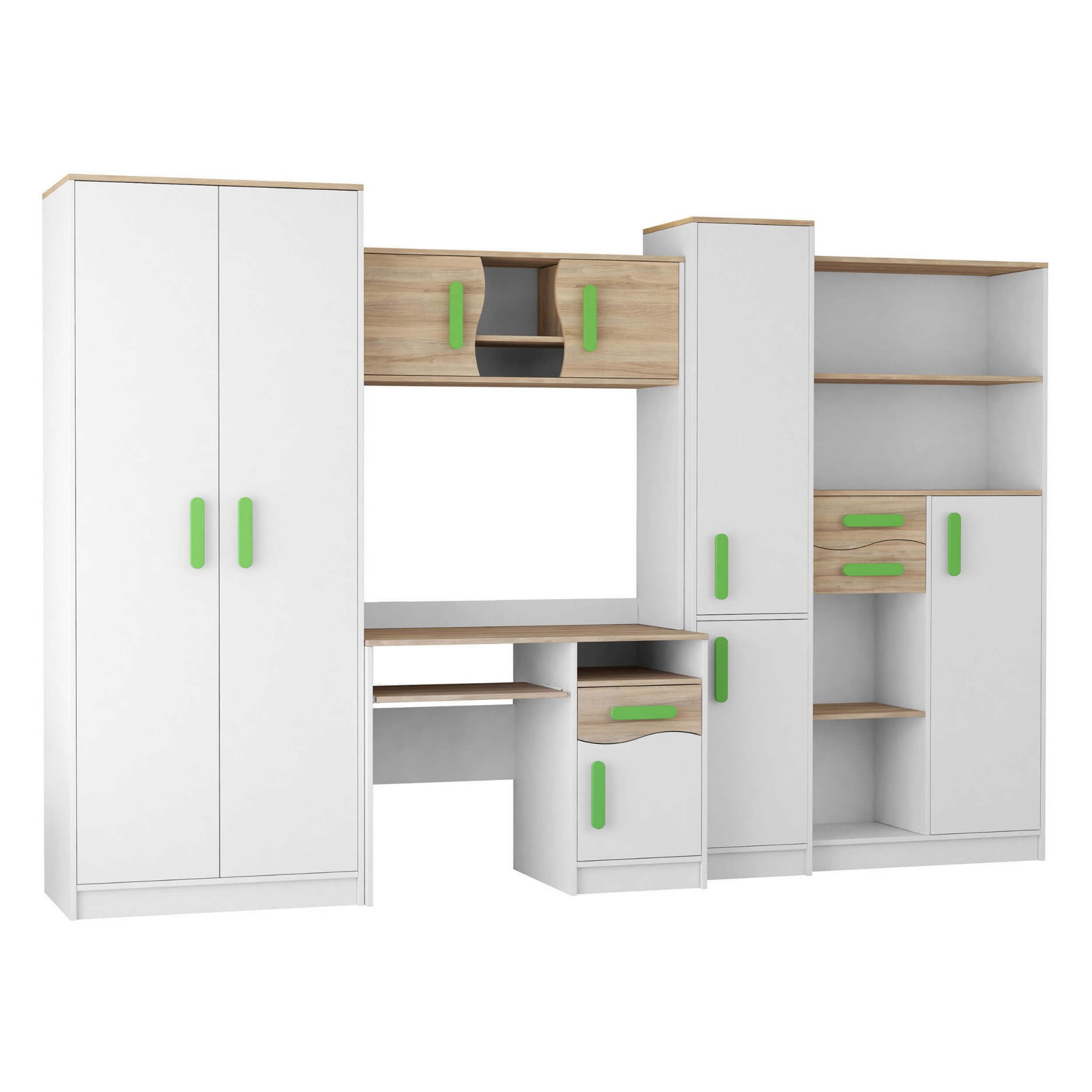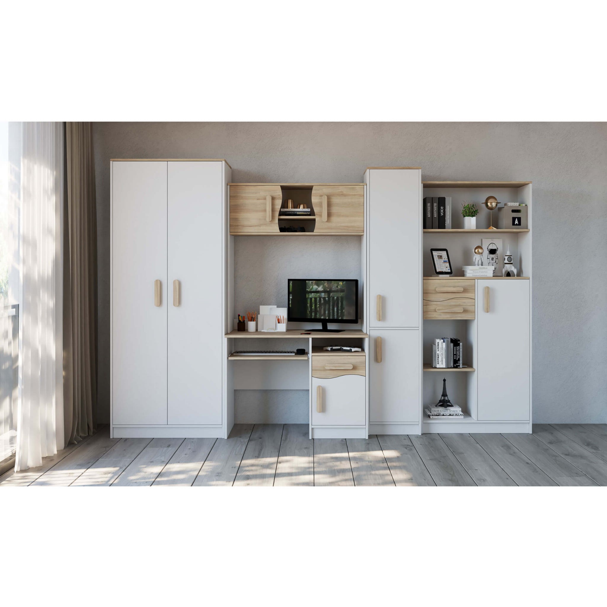 W skład zestawu wchodzi również dwudrzwiowa szafa, która wewnątrz posiada półkę oraz drążek na ubrania. Dodatkowo, zestaw obejmuje dwa regały z szufladami i szafkami z półkami.
