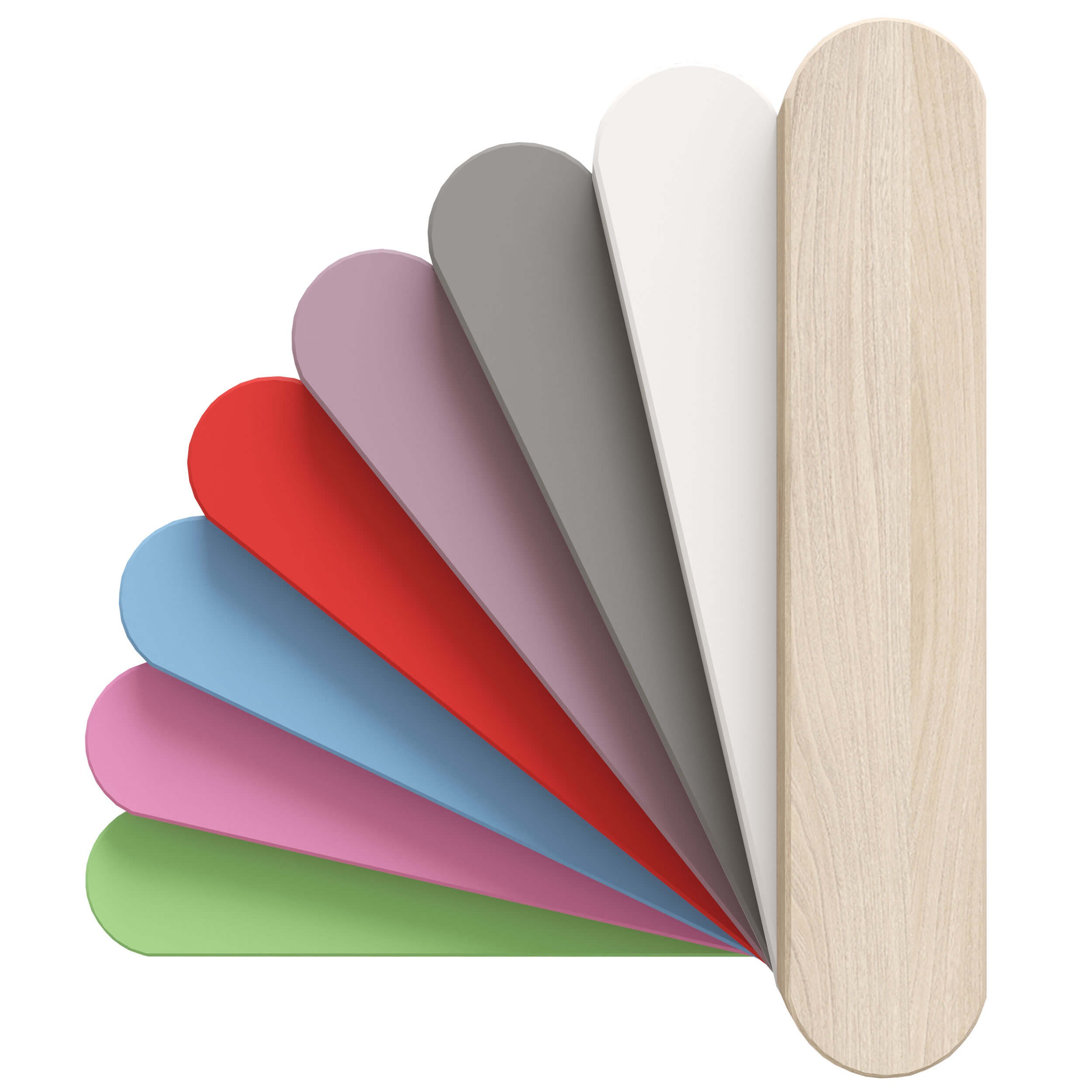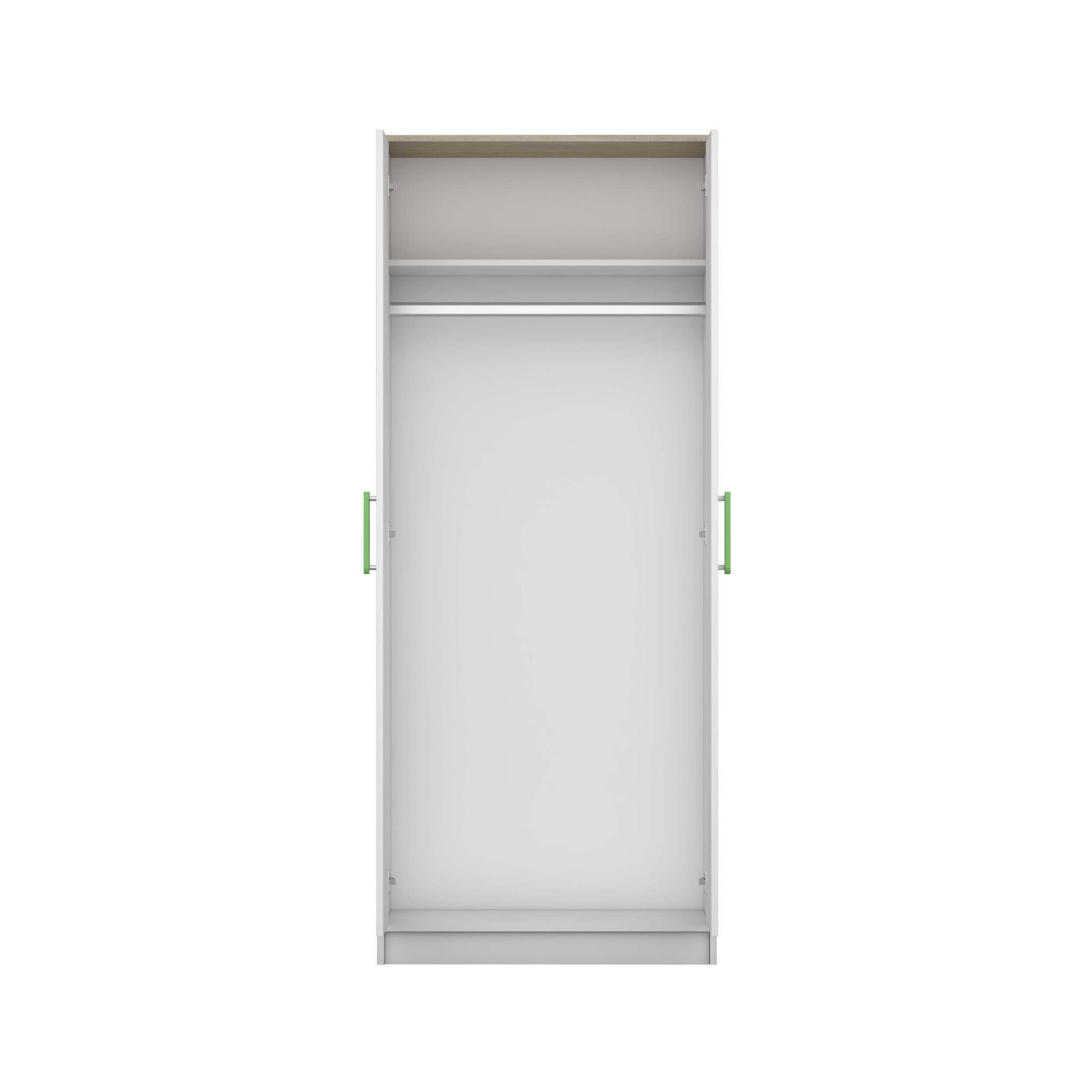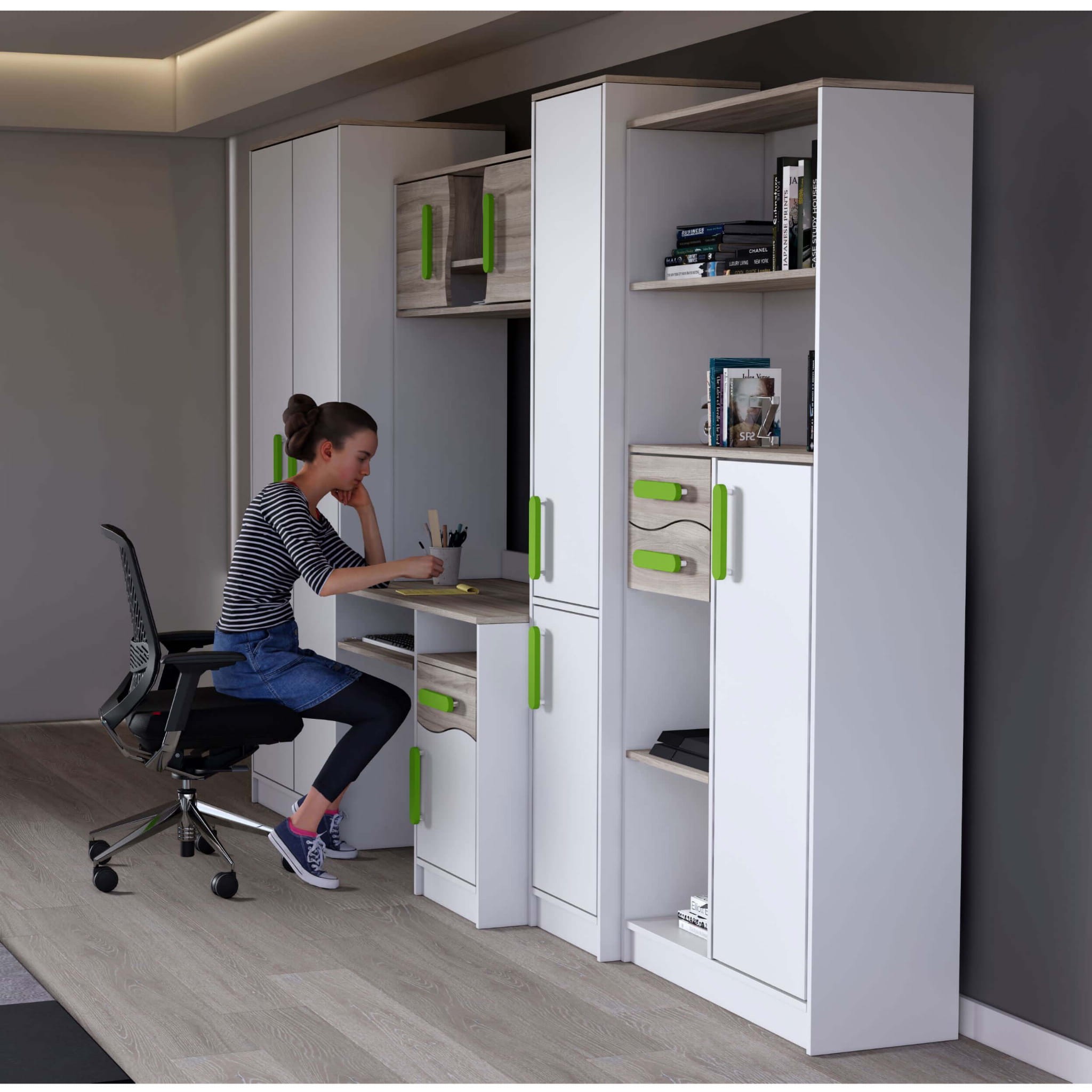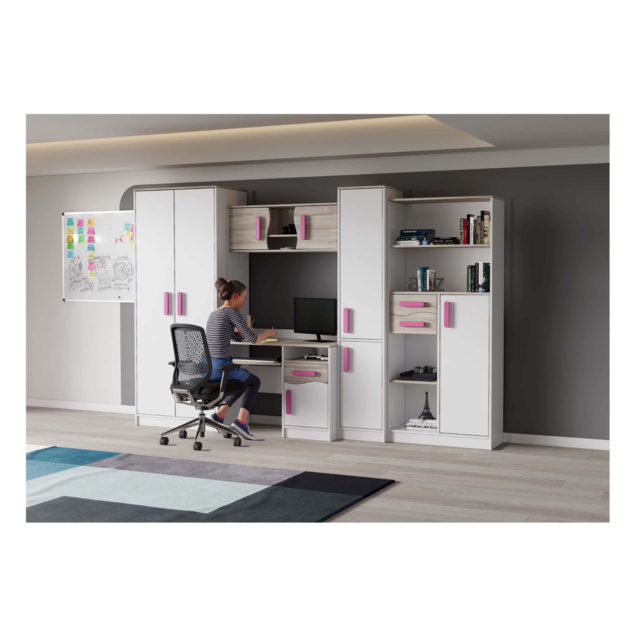 W skład zestawu wchodzi również dwudrzwiowa szafa, która wewnątrz posiada półkę oraz drążek na ubrania. Dodatkowo, zestaw obejmuje dwa regały z szufladami i szafkami z półkami.