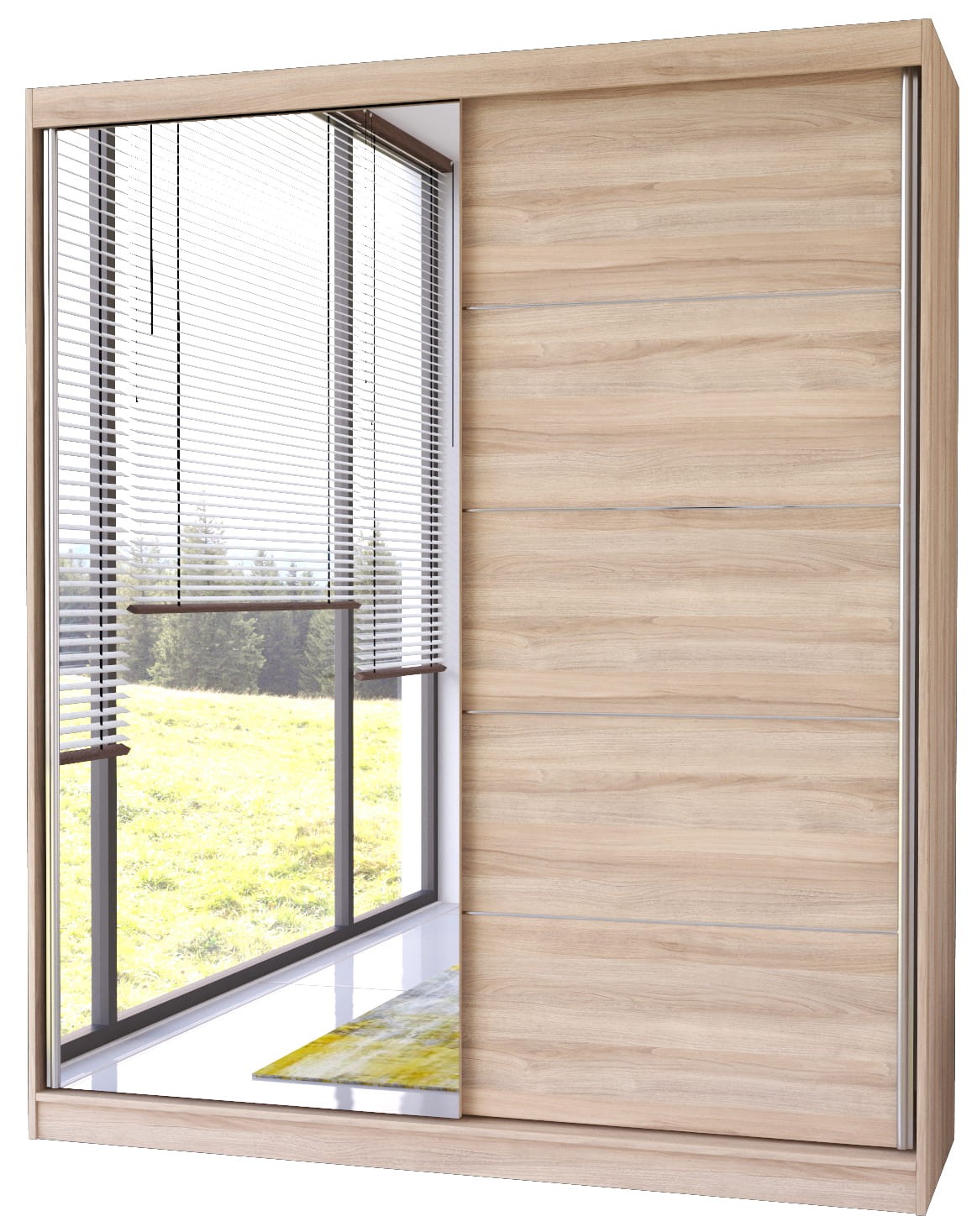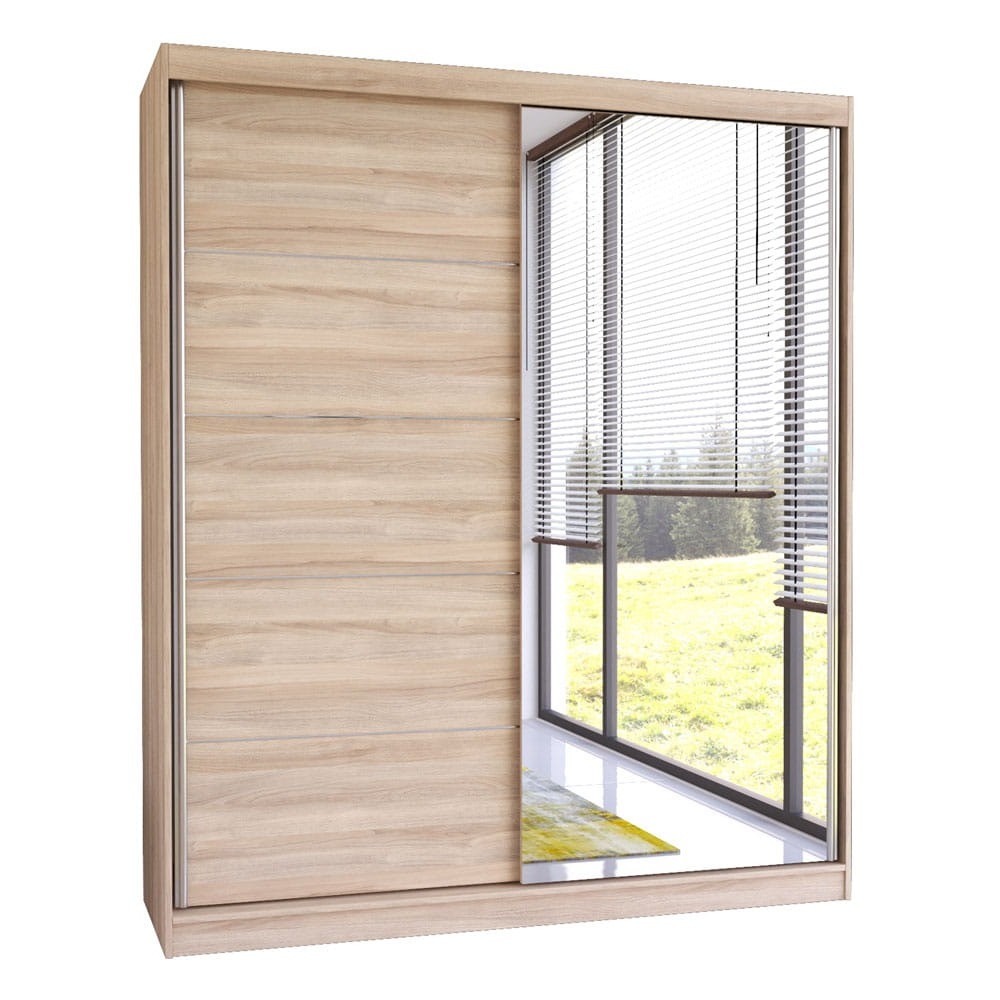 Szafa przesuwna BELLA 03 o szerokości 183 cm to nowoczesne rozwiązanie dostępne w uniwersalnych kolorach, które łatwo dopasować do każdej aranżacji wnętrza. Na jednym skrzydle znajduje się duże lustro, a aluminiowe uchwyty biegnące wzdłuż drzwi dodają szafie nowoczesnego charakteru. Idealnie sprawdzi się w salonie, sypialni, przedpokoju czy garderobie, zwiększając funkcjonalność każdego pomieszczenia. System drzwi przesuwnych ułatwia użytkowanie i oszczędza miejsce. Szafa jest podzielona na dwie części, wyposażone w przestronne półki oraz drążek na wieszaki, co zapewnia wygodne przechowywanie.