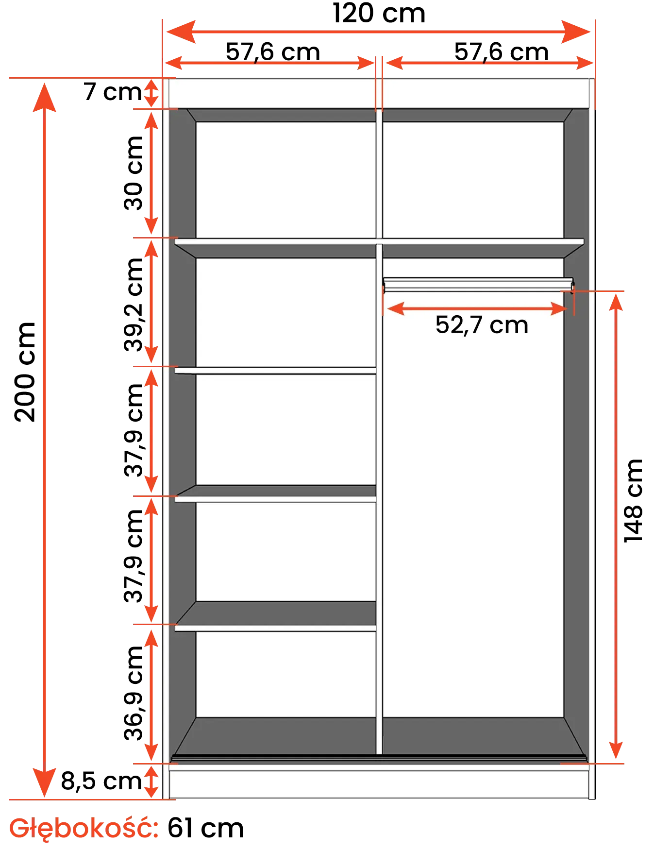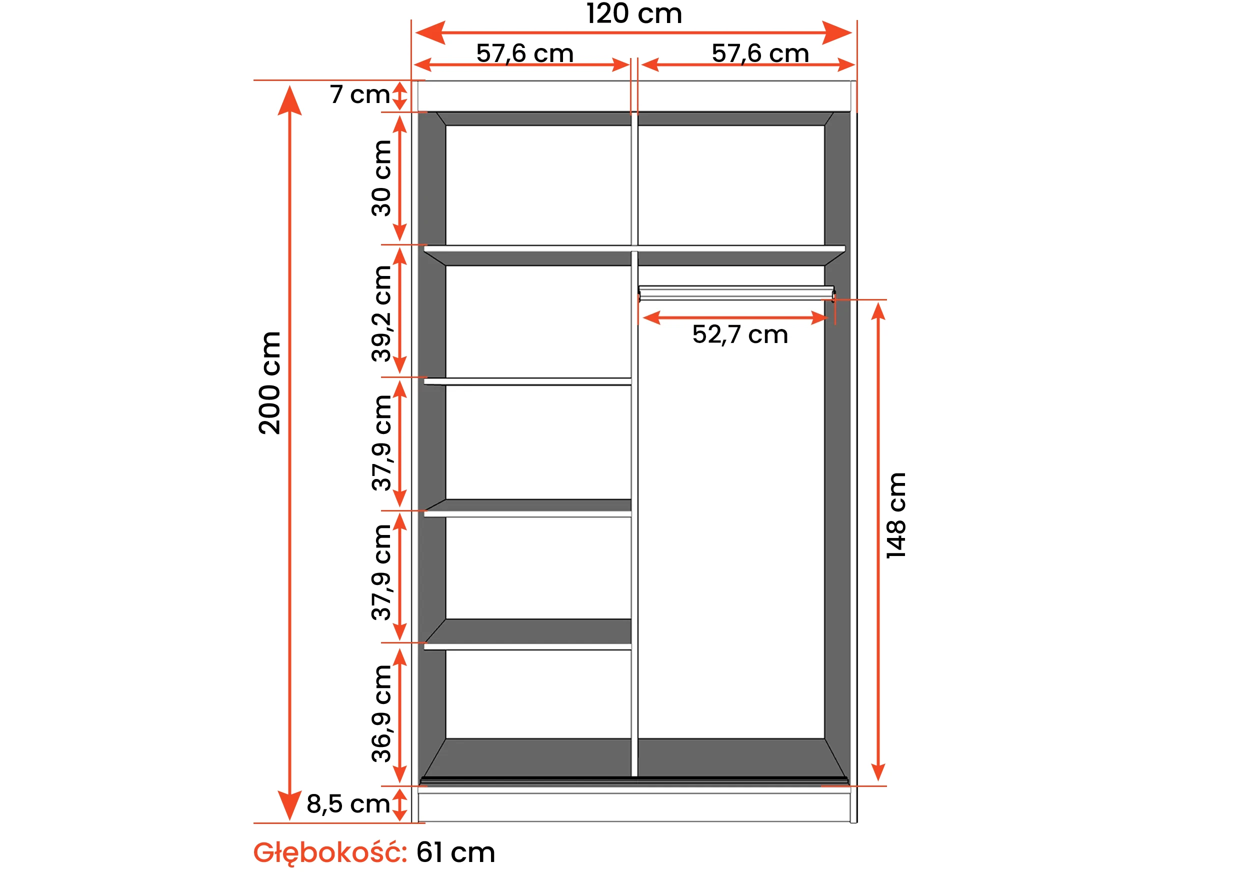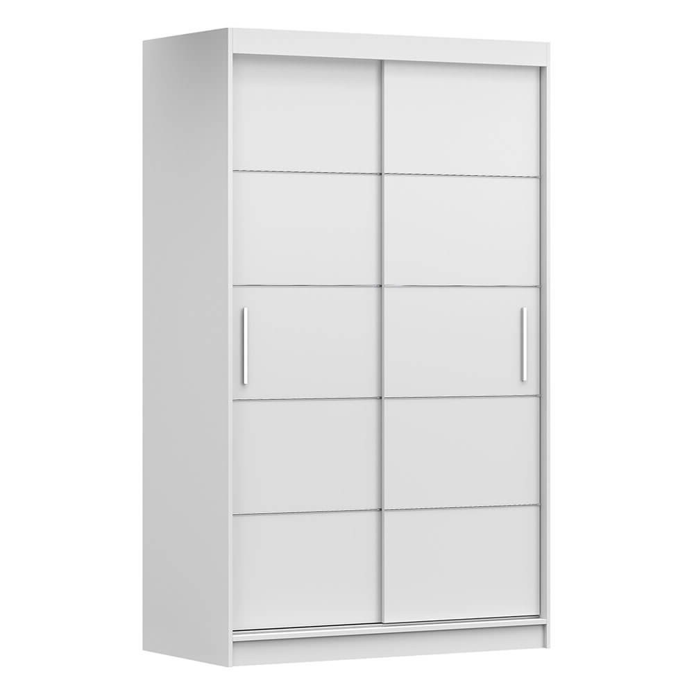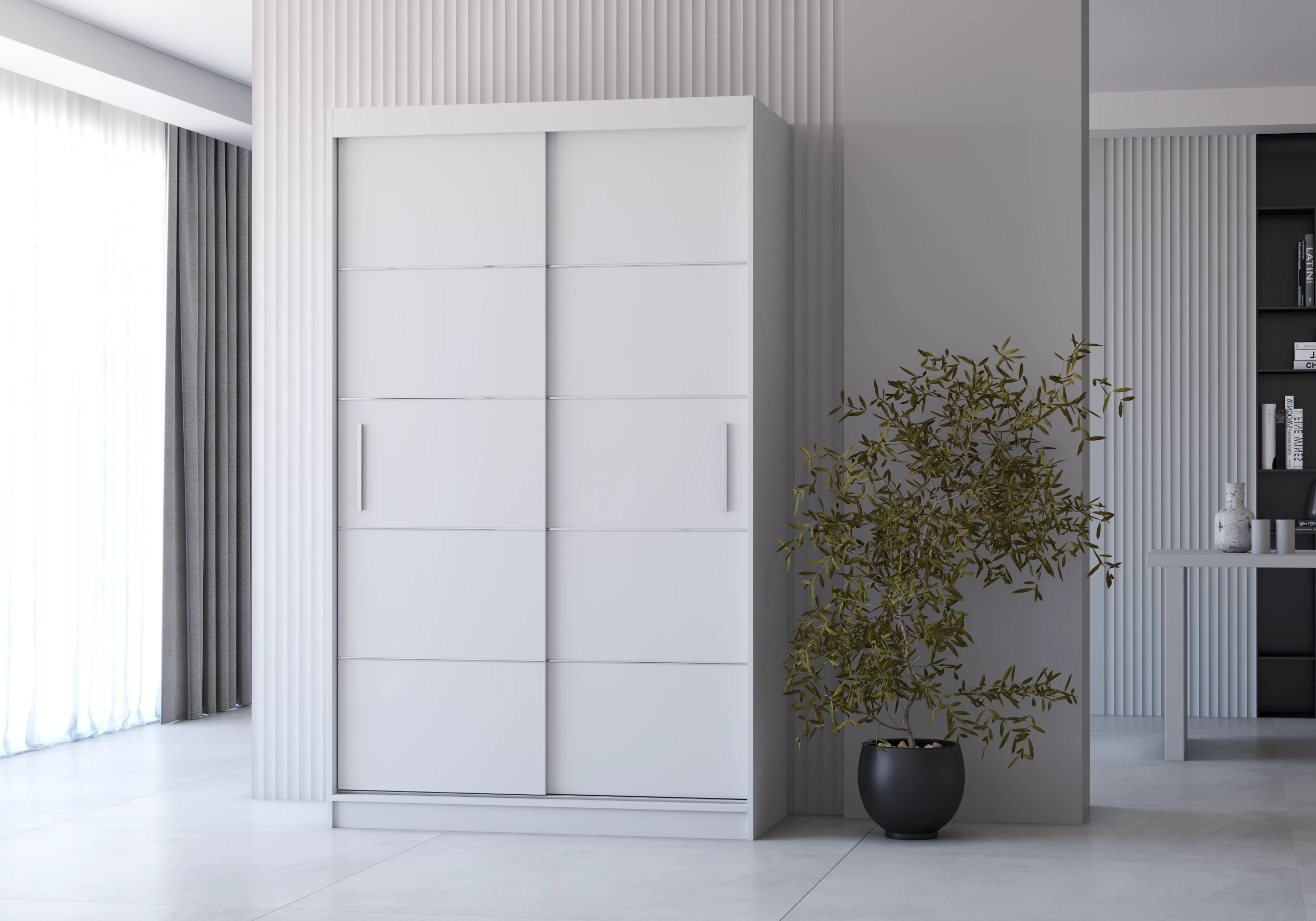 Szafa NEOMI 06 w kolorze białym to nowoczesny mebel, który doskonale łączy prostotę formy z eleganckim wykończeniem. Front z ozdobnymi szprosami dodaje jej stylu i lekkości, a system drzwi przesuwnych sprawia, że szafa jest wygodna w codziennym użytkowaniu i idealna do pomieszczeń o ograniczonej przestrzeni. Wnętrze zostało zaprojektowane tak, aby zapewnić maksymalną funkcjonalność – znajduje się tu pięć pojemnych półek oraz praktyczny drążek na wieszaki. Szafa wykonana jest z solidnej płyty laminowanej o grubości 16 mm, a obrzeża zabezpieczone okleiną ABS gwarantują odporność na uszkodzenia. Metalowe prowadnice z rolkami na łożyskach umożliwiają płynne i ciche przesuwanie drzwi. Szafa NEOMI 06 to doskonały wybór do sypialni, garderoby lub przedpokoju, wprowadzając do wnętrza nowoczesność, elegancję i porządek.