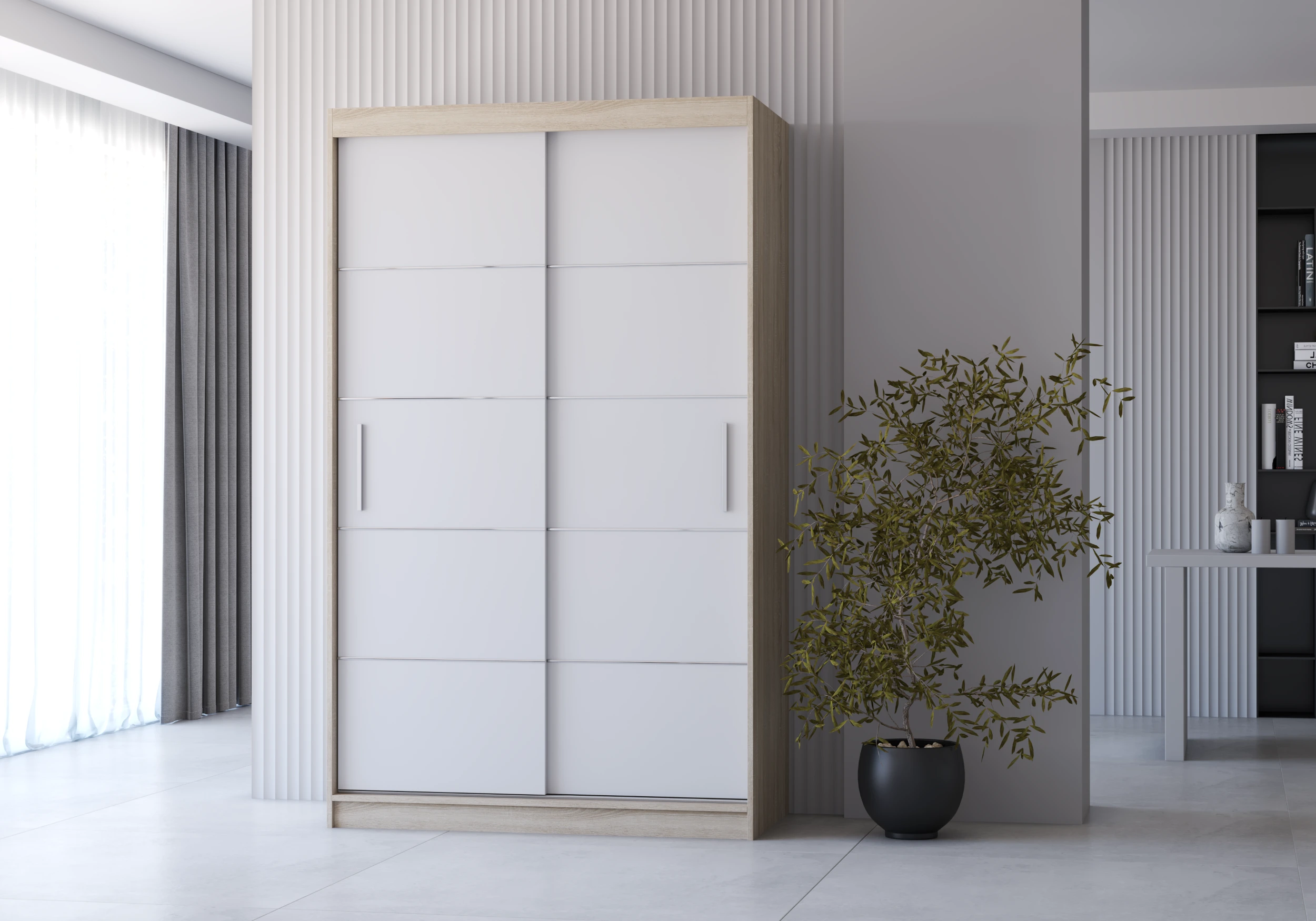 Szafa NEOMI 06 to nowoczesny i funkcjonalny mebel, który łączy elegancki wygląd z praktycznym wnętrzem. Ozdobne szprosy na froncie nadają jej wyjątkowego charakteru, a system drzwi przesuwnych sprawia, że korzystanie z niej jest wygodne i nie wymaga dodatkowej przestrzeni. Wnętrze zostało podzielone na dwie części — po jednej stronie znajdują się pojemne półki, a po drugiej drążek do zawieszania ubrań. Szafa wykonana jest z trwałej płyty laminowanej o grubości 16 mm, z obrzeżami wykończonymi okleiną ABS, co gwarantuje odporność na uszkodzenia i długą żywotność mebla. Stabilne metalowe prowadnice z rolkami na łożyskach zapewniają ciche i płynne przesuwanie drzwi. Szafa NEOMI 06 w kolorze dąb sonoma i bieli doskonale pasuje zarówno do nowoczesnych, jak i klasycznych wnętrz, wprowadzając do nich porządek i elegancję.