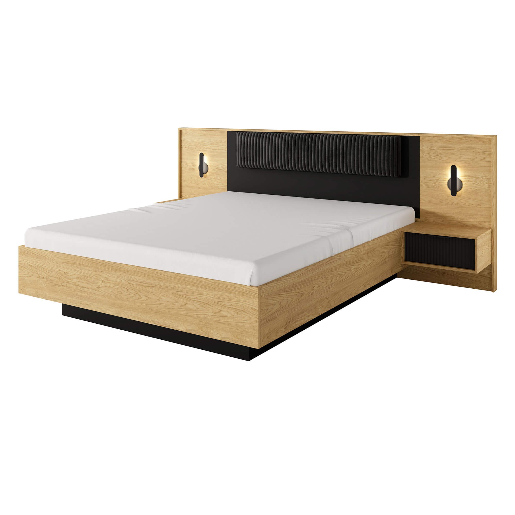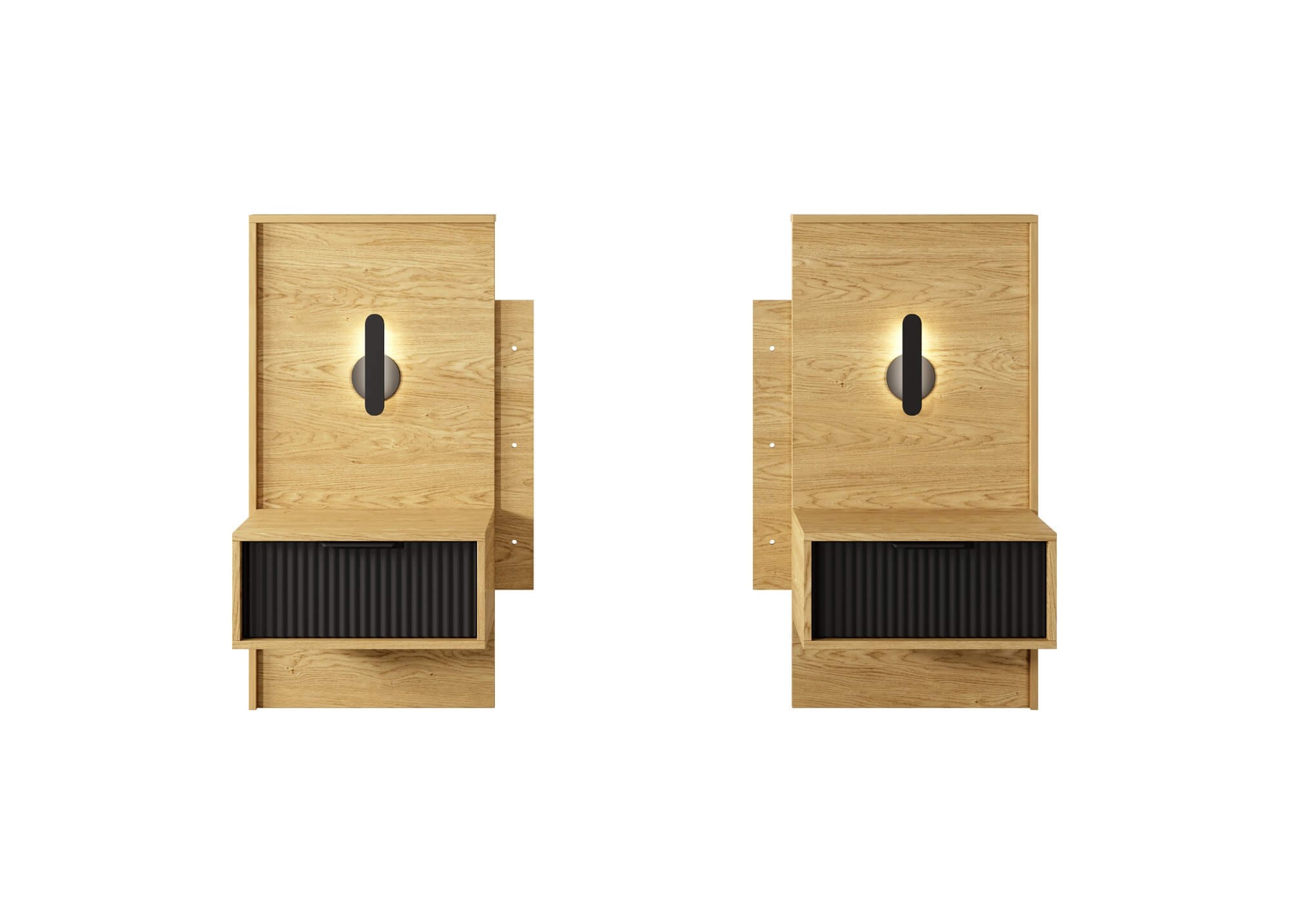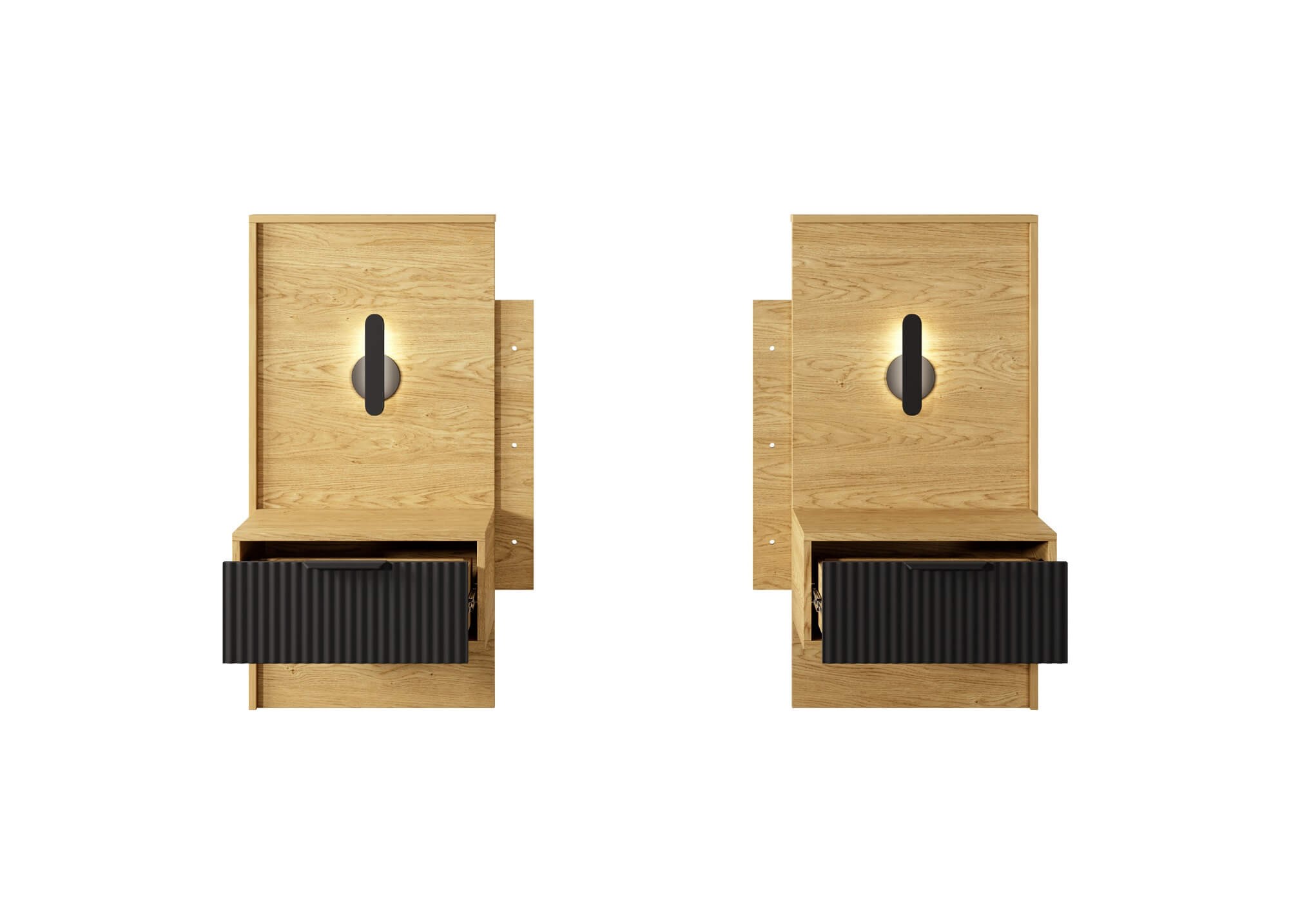 Harmonijne połączenie ciepłego drewna z dodatkami w klasycznej czerni to idealny przepis na wprowadzenie dobrego designu do wnętrz. Tak właśnie powstała unikatowa kolekcja mebli sypialnianych BALTIC na bazie dębu baltic oraz czarnych detali. Jedną z atrakcyjnych propozycji jest zestaw szafek nocnych z wbudowanym oświetleniem LED na panelu. Taki komplet to idealny sposób, by uzupełnić łóżko z tej samej kolekcji i nadać sypialni pazura. Stoliki zachwycają ciekawą formą, wykonaniem i pojemnością. Pozwalają na ustawienie ulubionych dekoracji, zdjęć czy przechowanie książki lub telefonu. Minimalistyczne, metalowe uchwyty ułatwiają otwieranie szuflad i zapobiegają pozostawianiu zabrudzeń, a do tego podkreślają nowoczesny styl kolekcji. Motywem dekoracyjnym jest również estetyczne ryflowanie szuflad. Mebel powstał w oparciu o wytrzymałą i odporną płytę laminowaną, która jest bardzo łatwa w czyszczeniu oraz utrzymaniu, krawędzie zostały wzmocnione obrzeżami ABS, a tył mebla wykonany z płyty HDF, co gwarantuje niezwykłą wytrzymałość.