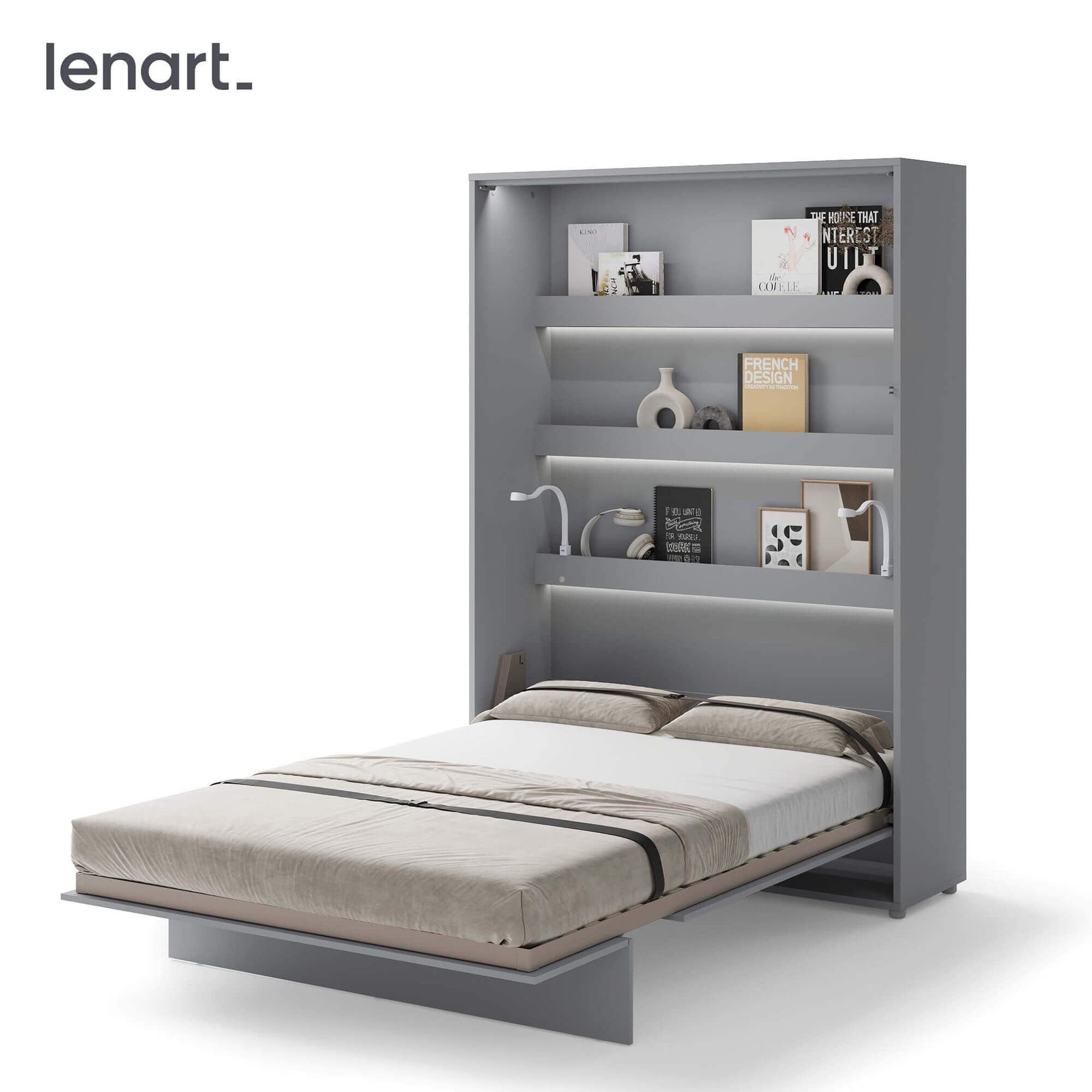 Lenart BED CONCEPT BC-01 Półkotapczan pionowy 140 w kolorze szarym to praktyczne i nowoczesne rozwiązanie do wnętrz, w których ważne jest sprytne wykorzystanie przestrzeni. Dzięki temu modelowi możesz w prosty sposób zamienić salon, pokój młodzieżowy czy kawalerkę w wygodną sypialnię. Marka Lenart stworzyła łóżko BC-01 tak, by łączyło komfort codziennego snu z funkcjonalnością i estetyką. Mebel wyposażono w praktyczne półki wewnętrzne, które doskonale sprawdzają się do przechowywania książek, dekoracji czy drobiazgów codziennego użytku. Solidna konstrukcja – metalowa rama, drewniany stelaż szczebelkowy i stabilizator materaca – gwarantuje trwałość i wygodę. Pneumatyczne podnośniki sprawiają, że otwieranie i zamykanie łóżka jest lekkie i bezpieczne, a system soft close niemal całkowicie eliminuje hałas.