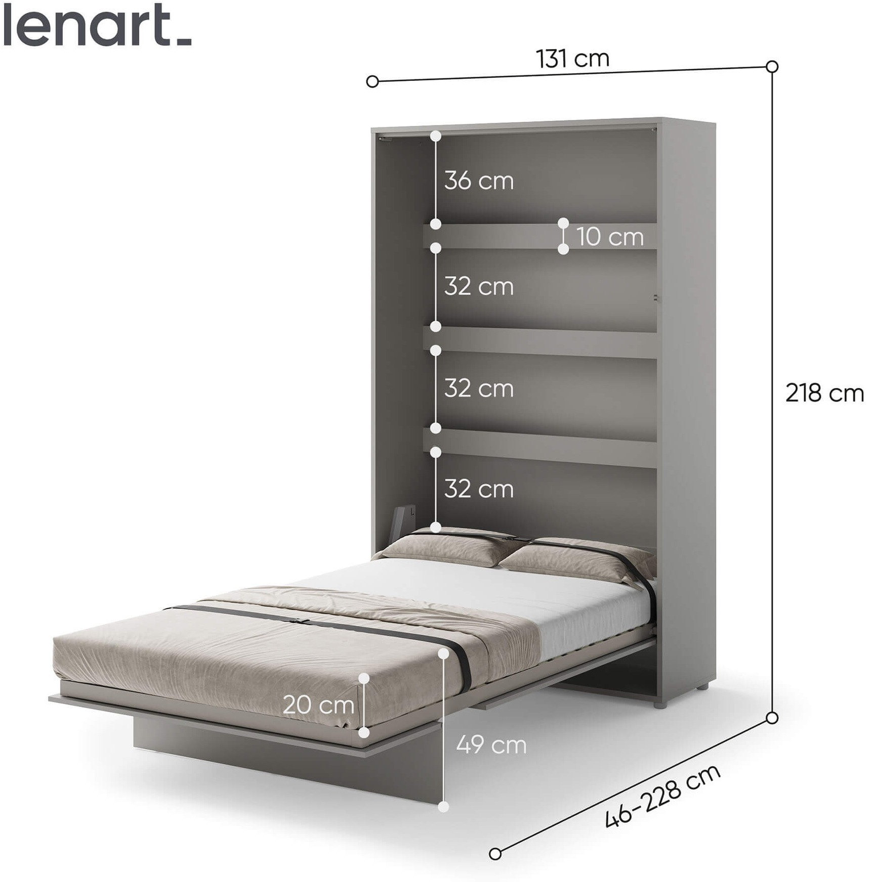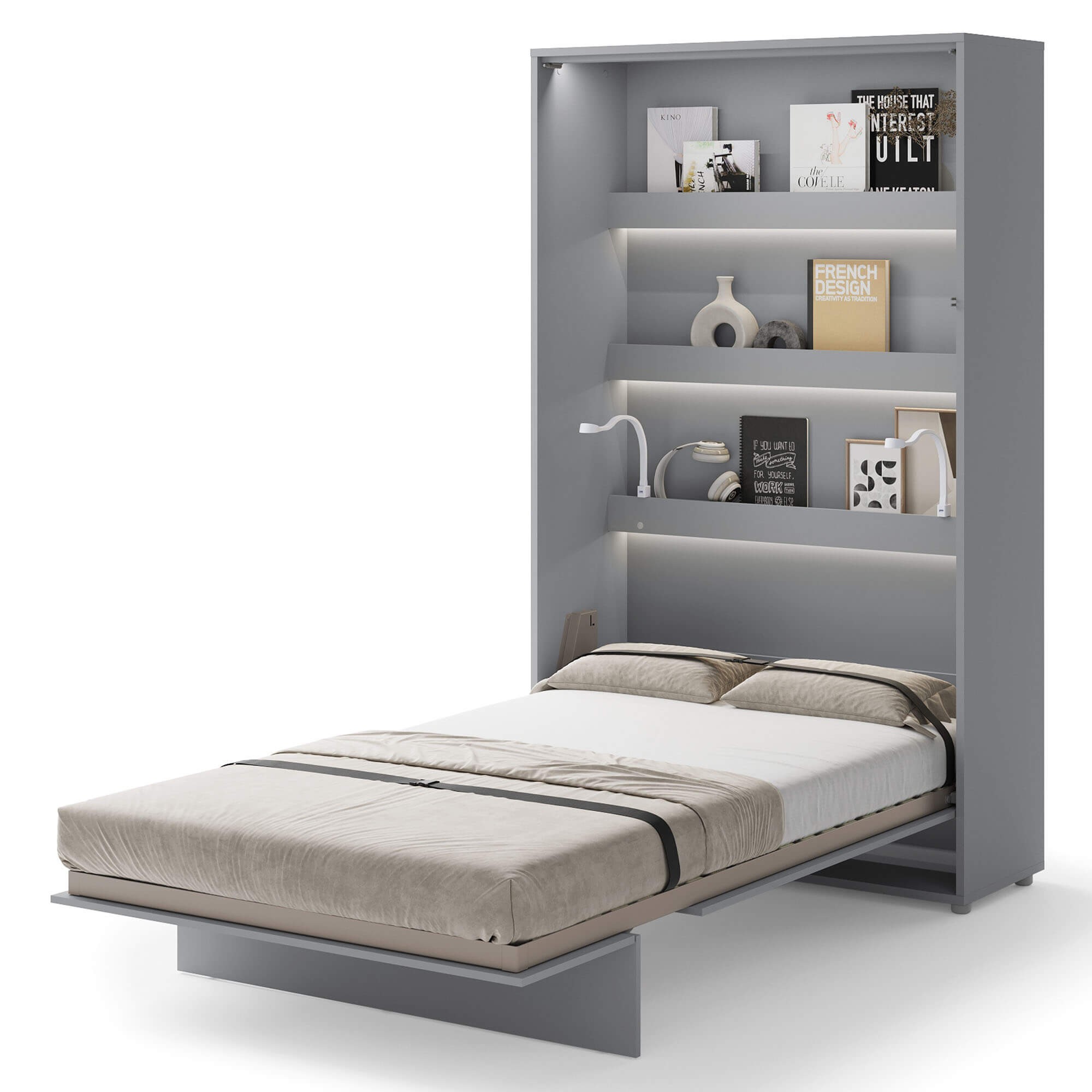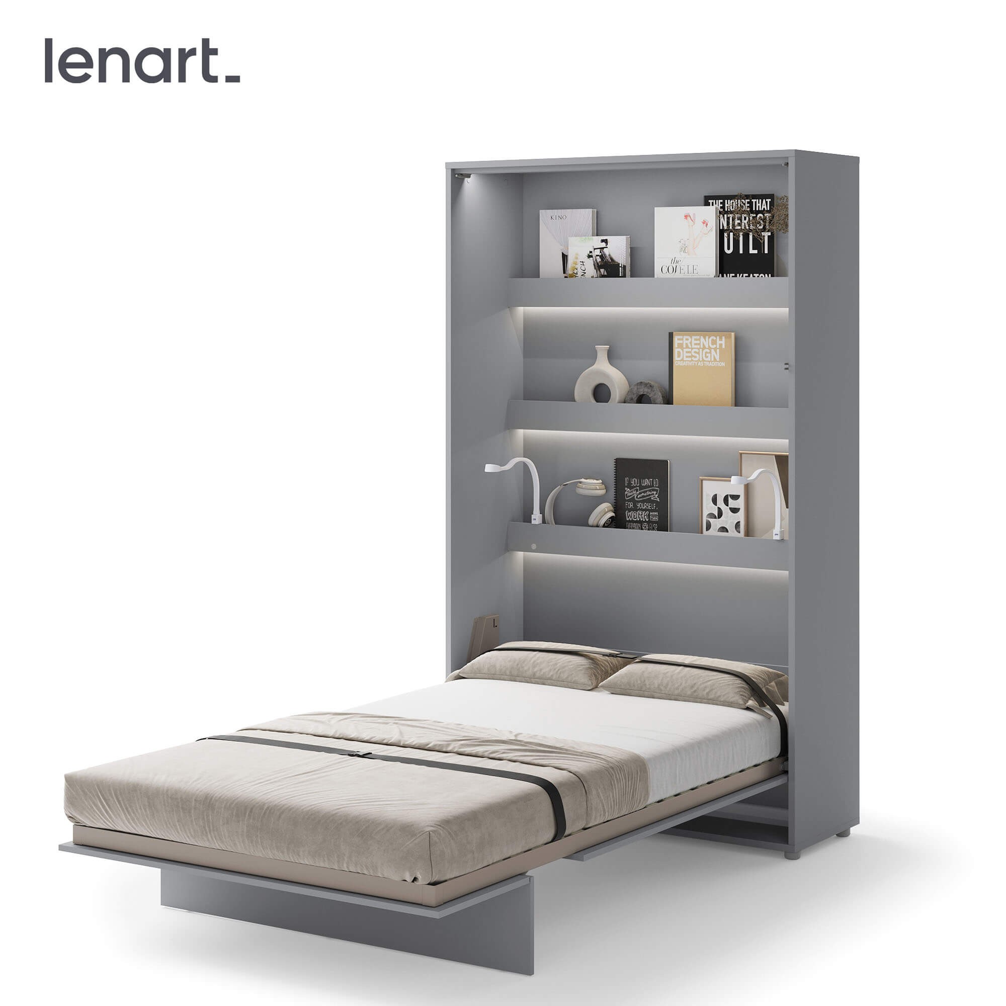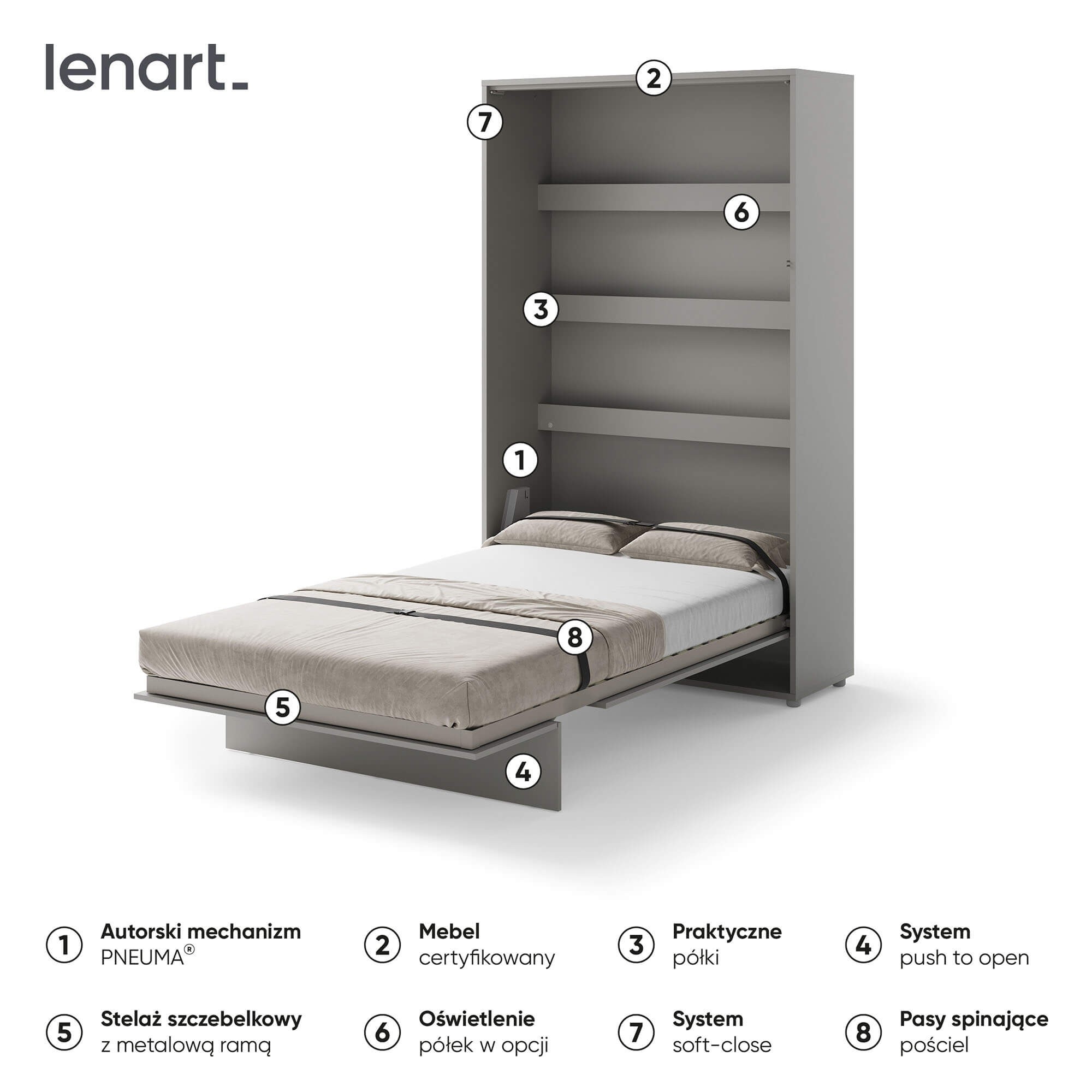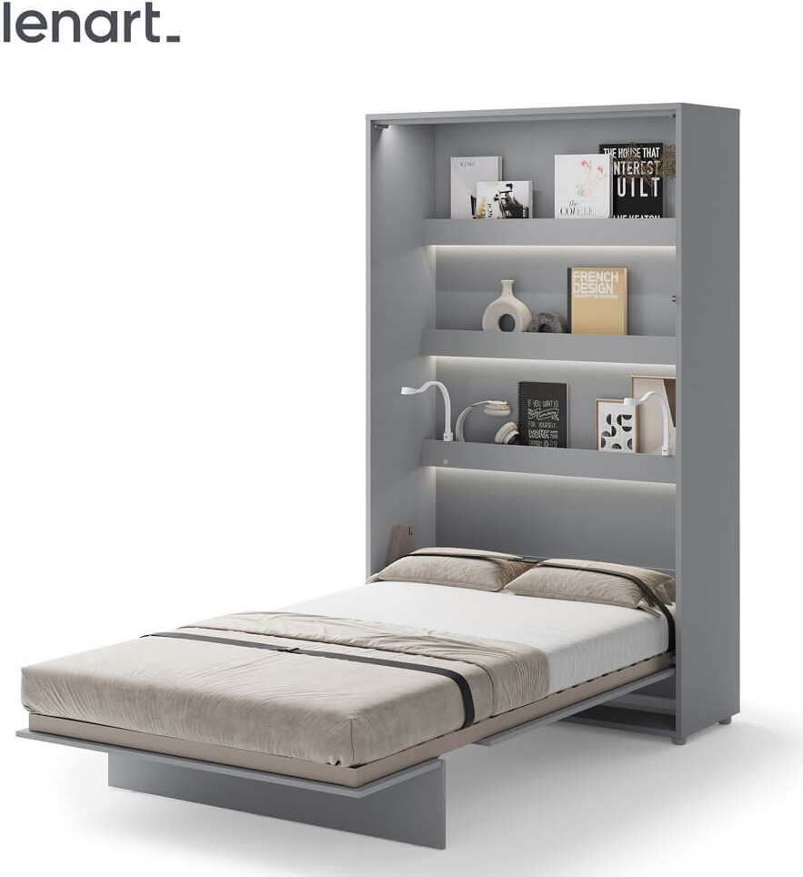 Lenart BED CONCEPT BC-02 Półkotapczan pionowy 120 w kolorze szarym to funkcjonalne i stylowe rozwiązanie, które świetnie sprawdza się w nowoczesnych mieszkaniach. Ten model pozwala w kilka chwil zmienić pokój dzienny, młodzieżowy czy kawalerkę w wygodną sypialnię. Marka Lenart stworzyła półkotapczan BC-02 tak, aby łączył oszczędność miejsca, komfort snu i bezpieczeństwo użytkowania z estetycznym, minimalistycznym wyglądem. Łóżko zostało wyposażone w praktyczne półki wewnętrzne, które doskonale nadają się do przechowywania książek, dekoracji lub przedmiotów codziennego użytku. Solidna metalowa rama, drewniany stelaż szczebelkowy oraz stabilizator materaca gwarantują wygodę i trwałość porównywalną z tradycyjnym łóżkiem. Pneumatyczne podnośniki ułatwiają otwieranie i zamykanie, a system soft close sprawia, że mechanizm działa niemal bezgłośnie. To nowoczesne rozwiązanie, które zdobyło Złoty Medal Międzynarodowych Targów Poznańskich 2019, co potwierdza jego wysoką jakość i innowacyjny charakter.