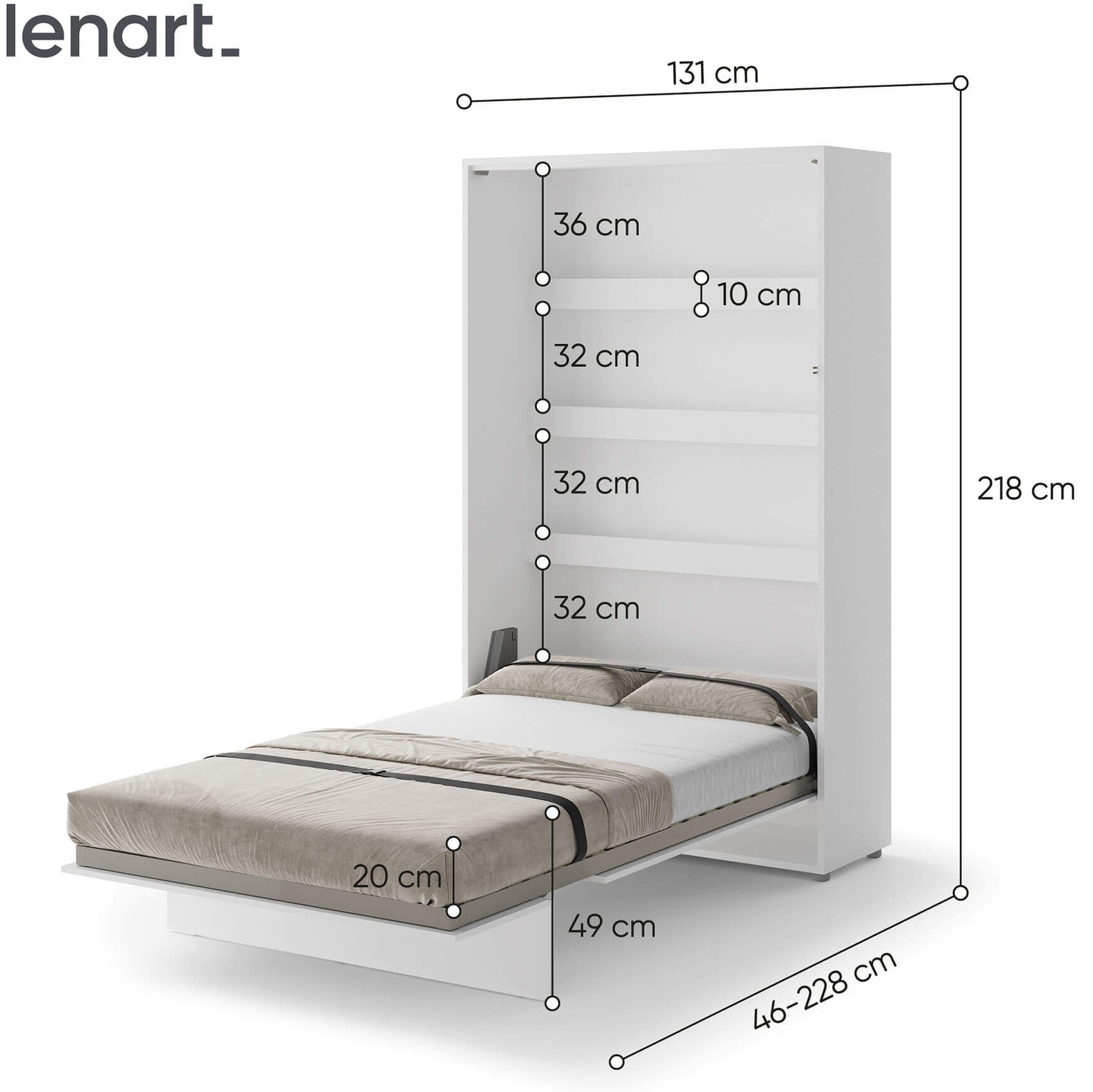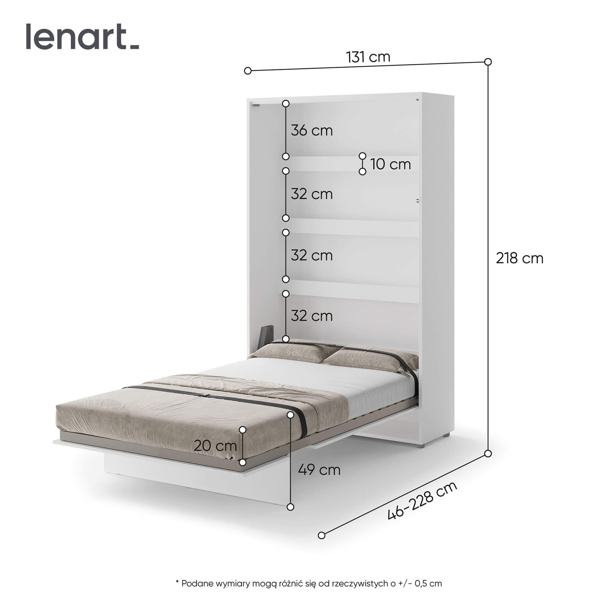 Lenart BED CONCEPT BC-02p Półkotapczan pionowy 120 w kolorze biały/biały połysk to mebel, który pozwala wygodnie połączyć funkcję salonu i sypialni w jednym pomieszczeniu. Dzięki temu modelowi z łatwością zyskasz dodatkową przestrzeń w małym mieszkaniu, pokoju młodzieżowym czy studenckim. Marka Lenart zaprojektowała łóżko tak, aby było wygodne, bezpieczne i jednocześnie nowoczesne w wyglądzie. Półkotapczan BC-02p to idealne rozwiązanie jako szerokie łóżko dla singla, starszego dziecka lub nastolatka. Wyposażono go w praktyczne półki wewnętrzne, które sprawdzają się do przechowywania książek i drobiazgów codziennego użytku. Solidna metalowa rama, drewniany stelaż szczebelkowy i stabilizator materaca gwarantują komfort snu, a pneumatyczne podnośniki ułatwiają bezpieczne otwieranie i zamykanie łóżka. System soft close sprawia, że mechanizm działa niemal bezszelestnie, a pasy spinające pościel eliminują konieczność posiadania dodatkowej skrzyni na kołdrę i poduszki.