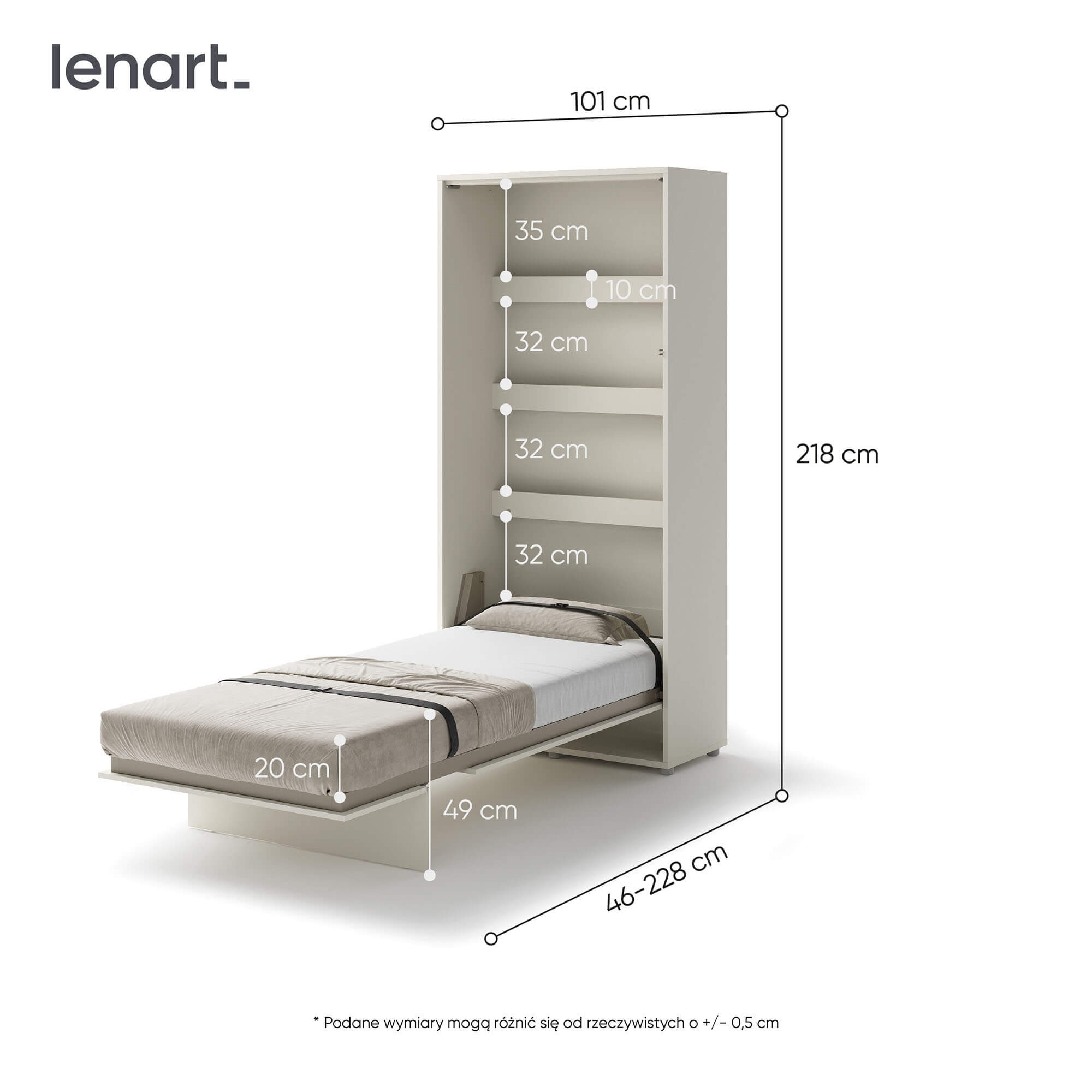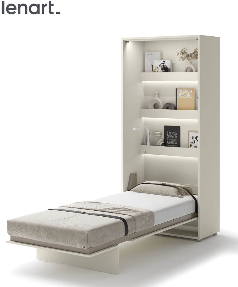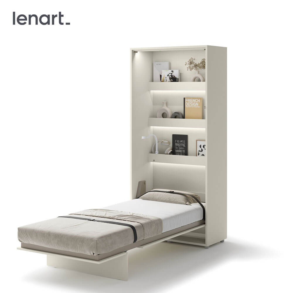 Lenart BED CONCEPT BC-03 półkotapczan pionowy 90 to praktyczne łóżko chowane w szafie, które pozwala wygodnie urządzić nawet najmniejsze wnętrze. Marka Lenart stworzyła rozwiązanie, które w kilka chwil zmienia pokój dzienny w komfortową sypialnię. Wersja w kolorze kaszmir prezentuje się elegancko i nowocześnie, a jednocześnie pasuje do wielu aranżacji. Model BED CONCEPT BC-03 został zaprojektowany pod materac o szerokości 90 cm, co sprawia, że świetnie nadaje się jako łóżko dla singla, starszego dziecka lub nastolatka. Wewnątrz mebla znajdują się dodatkowe półki, które idealnie sprawdzają się do przechowywania książek, dekoracji czy drobiazgów codziennego użytku. Solidna konstrukcja, metalowa rama oraz pneumatyczne podnośniki gwarantują stabilność i bezpieczeństwo użytkowania. Za innowacyjność i jakość wykonania półkotapczan został nagrodzony Złotym Medalem 2019 Międzynarodowych Targów Poznańskich. Dzięki swojej uniwersalnej formie i ciepłemu wybarwieniu kaszmir, półkotapczan pasuje zarówno do nowoczesnych, jak i klasycznych aranżacji wnętrz. To mebel, który pozwala maksymalnie wykorzystać przestrzeń i zapewnia komfortowy sen na co dzień.