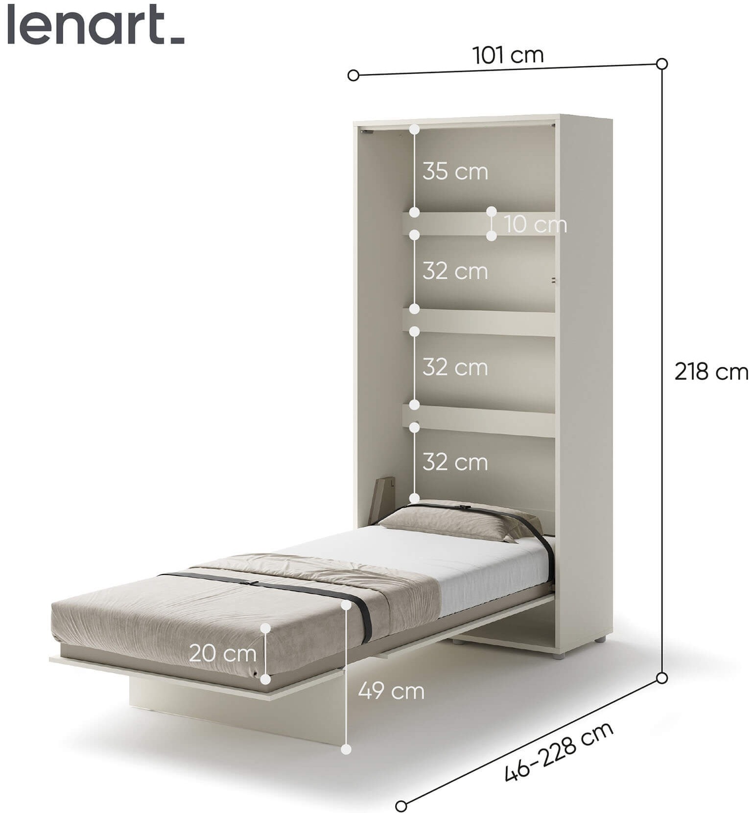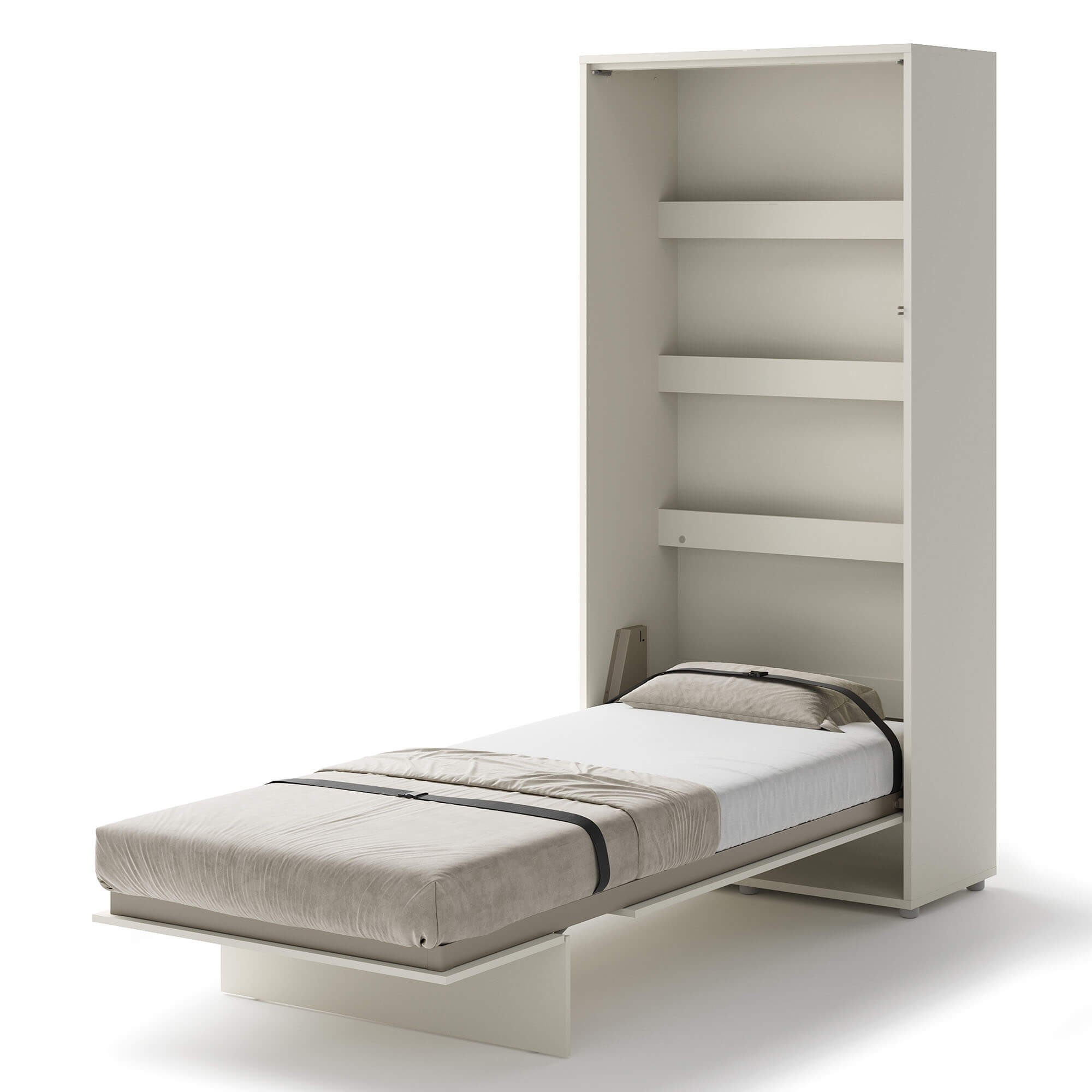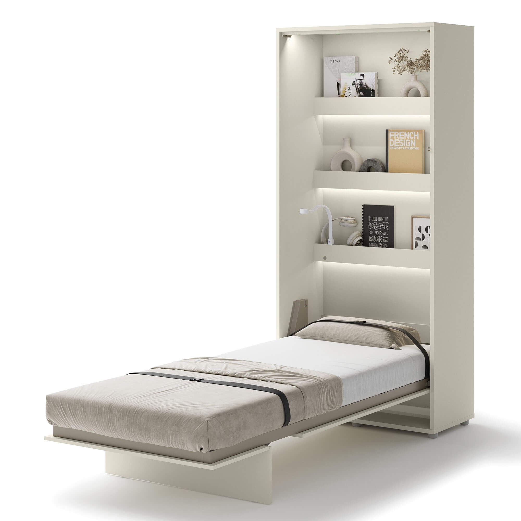 Lenart BED CONCEPT BC-03 półkotapczan pionowy 90 to praktyczne łóżko chowane w szafie, które pozwala wygodnie urządzić nawet najmniejsze wnętrze. Marka Lenart stworzyła rozwiązanie, które w kilka chwil zmienia pokój dzienny w komfortową sypialnię. Wersja w kolorze kaszmir prezentuje się elegancko i nowocześnie, a jednocześnie pasuje do wielu aranżacji. Model BED CONCEPT BC-03 został zaprojektowany pod materac o szerokości 90 cm, co sprawia, że świetnie nadaje się jako łóżko dla singla, starszego dziecka lub nastolatka. Wewnątrz mebla znajdują się dodatkowe półki, które idealnie sprawdzają się do przechowywania książek, dekoracji czy drobiazgów codziennego użytku. Solidna konstrukcja, metalowa rama oraz pneumatyczne podnośniki gwarantują stabilność i bezpieczeństwo użytkowania. Za innowacyjność i jakość wykonania półkotapczan został nagrodzony Złotym Medalem 2019 Międzynarodowych Targów Poznańskich. Dzięki swojej uniwersalnej formie i ciepłemu wybarwieniu kaszmir, półkotapczan pasuje zarówno do nowoczesnych, jak i klasycznych aranżacji wnętrz. To mebel, który pozwala maksymalnie wykorzystać przestrzeń i zapewnia komfortowy sen na co dzień.