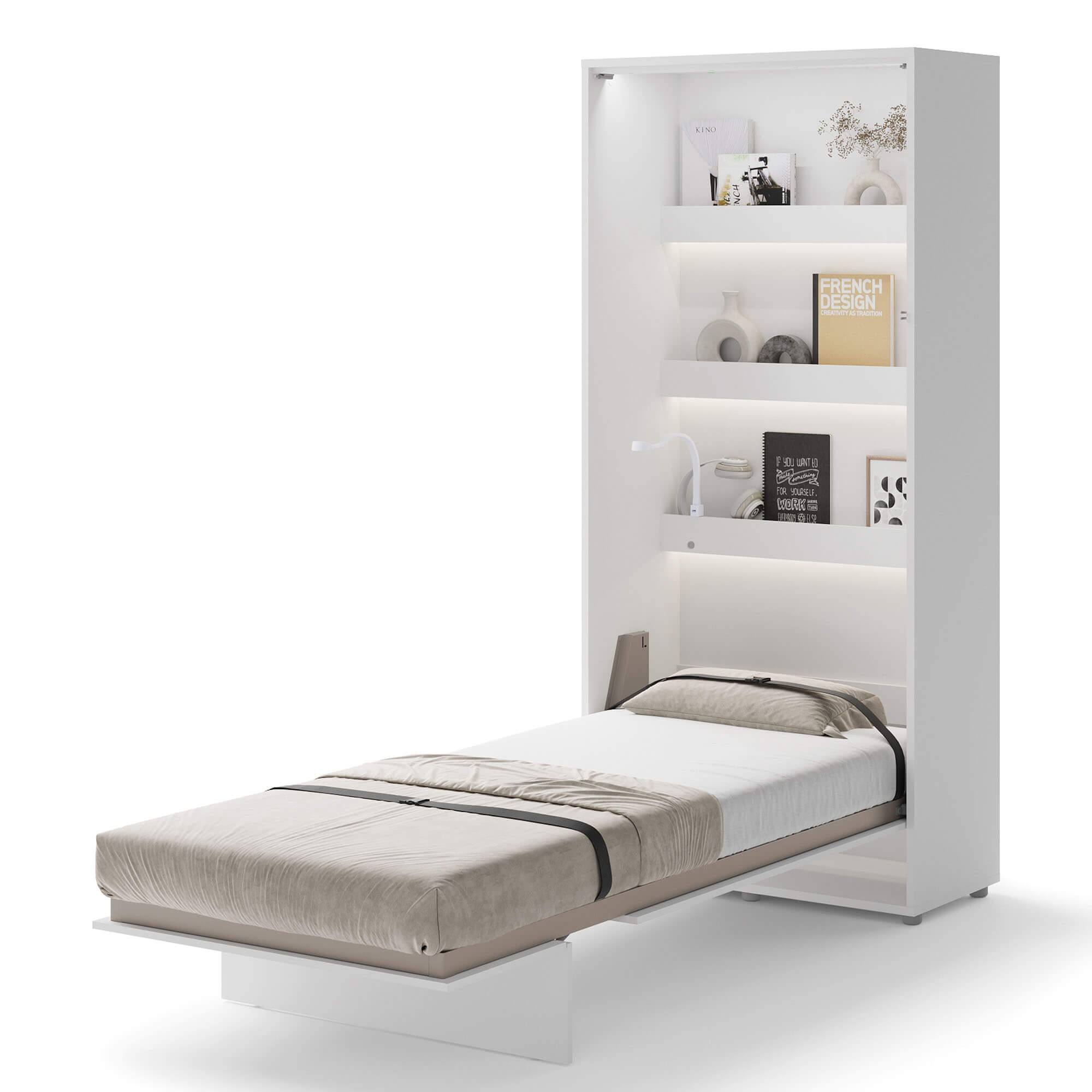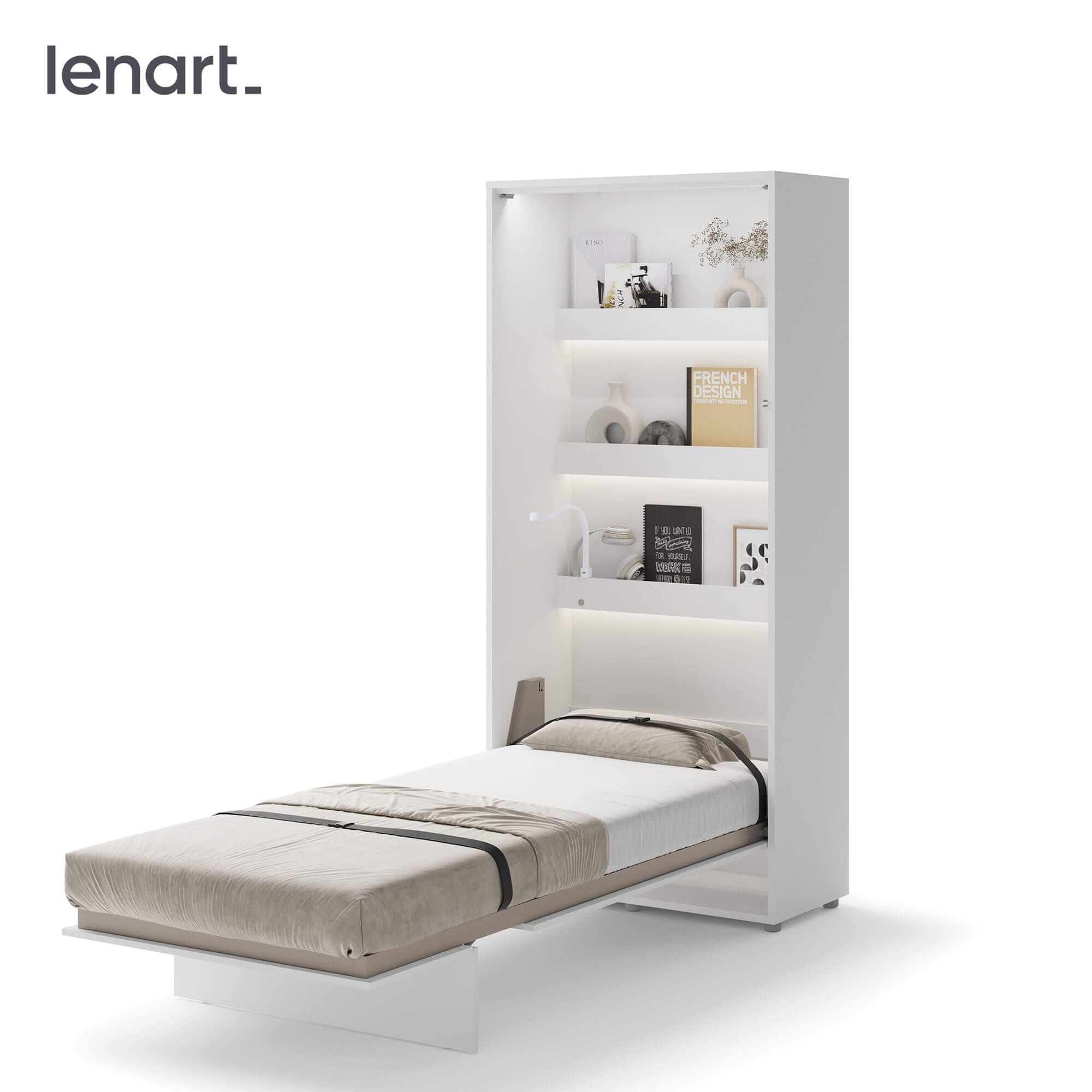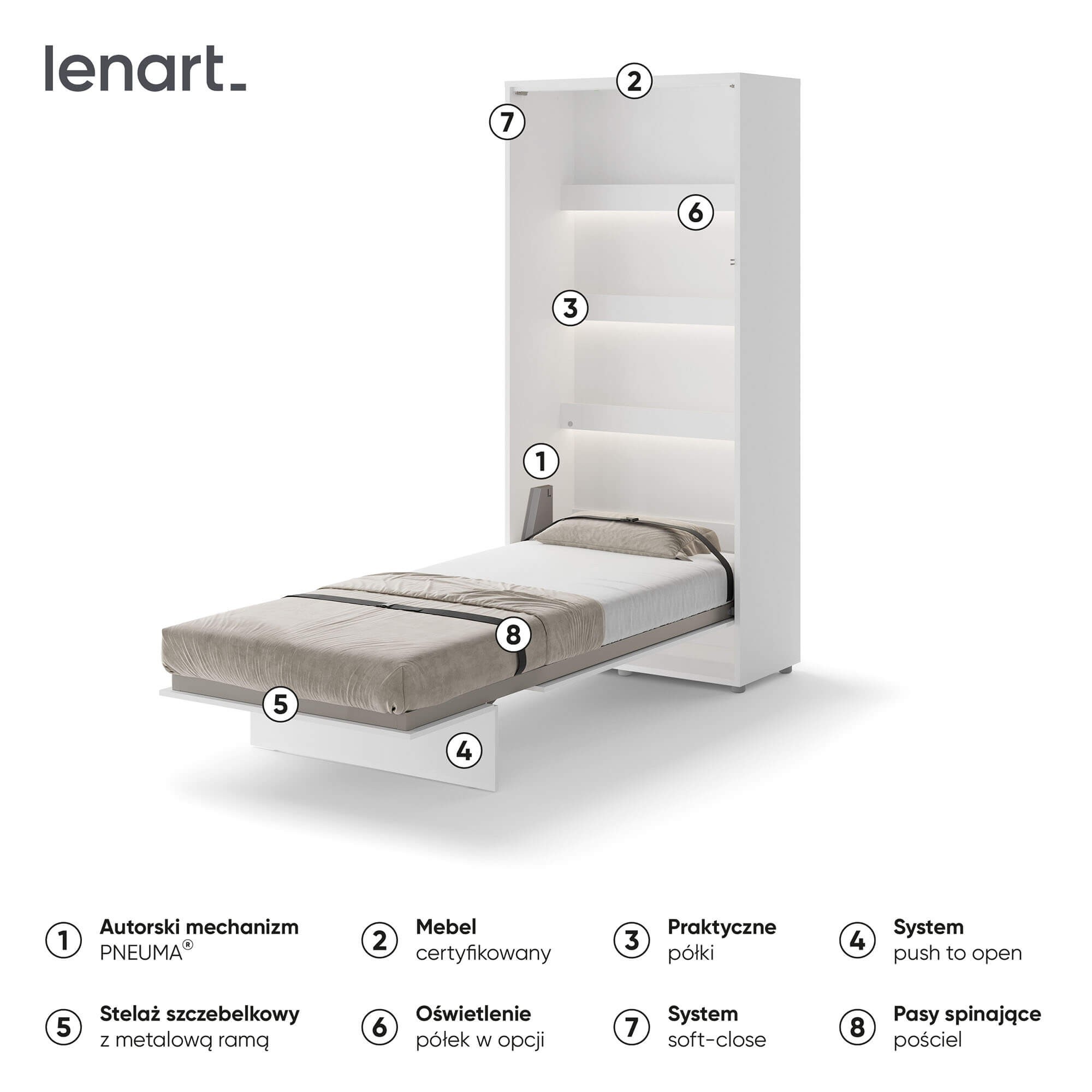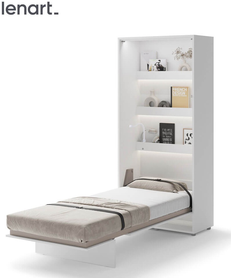 Lenart BED CONCEPT BC-03p półkotapczan pionowy 90 to nowoczesne łóżko chowane w szafie, które pozwala zaoszczędzić miejsce i jednocześnie zachować pełen komfort snu. Marka Lenart zaprojektowała funkcjonalny mebel w kolorze biały/biały połysk, który idealnie sprawdzi się w małych mieszkaniach, kawalerkach czy pokojach młodzieżowych. Dzięki niemu w kilka chwil przekształcisz dowolne pomieszczenie w wygodną sypialnię. Model BED CONCEPT BC-03p przeznaczony jest pod materac o szerokości 90 cm, co czyni go doskonałym wyborem dla singla, nastolatka lub starszego dziecka. Wewnątrz umieszczono dodatkowe półki, które świetnie sprawdzą się do przechowywania książek, dekoracji czy drobiazgów codziennego użytku. Półkotapczan wyróżnia się także bezpieczeństwem użytkowania – wyposażono go w pneumatyczne podnośniki, metalową ramę oraz solidny korpus montowany do ściany, co zapewnia stabilność i wygodę. Za nowoczesne rozwiązania i wysoką jakość wykonania model otrzymał prestiżową nagrodę Złoty Medal 2019 Międzynarodowych Targów Poznańskich. Dzięki eleganckiemu frontowi w połysku i minimalistycznemu wzornictwu, półkotapczan BC-03p pasuje do wielu stylów aranżacyjnych i pozwala łatwo dopasować się do innych mebli. To praktyczny mebel, który sprawdzi się w codziennym użytkowaniu, a także w pokoju gościnnym.