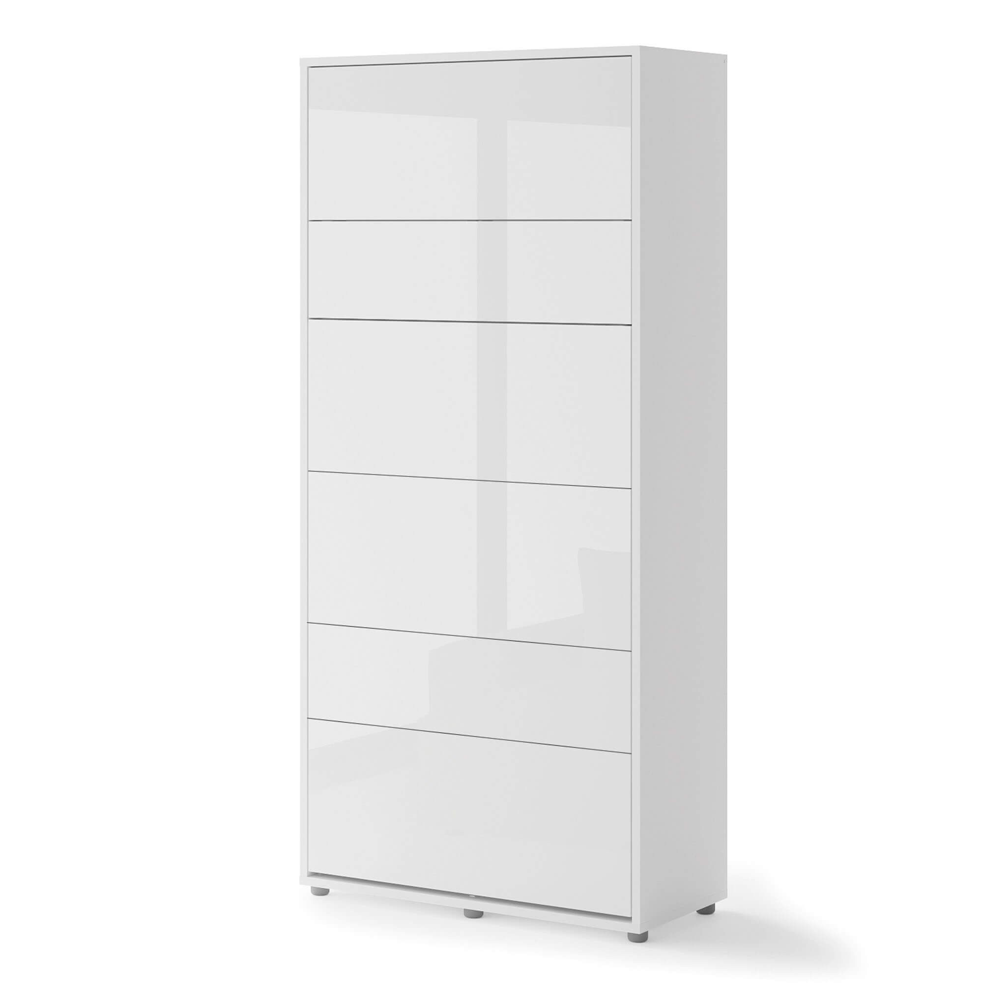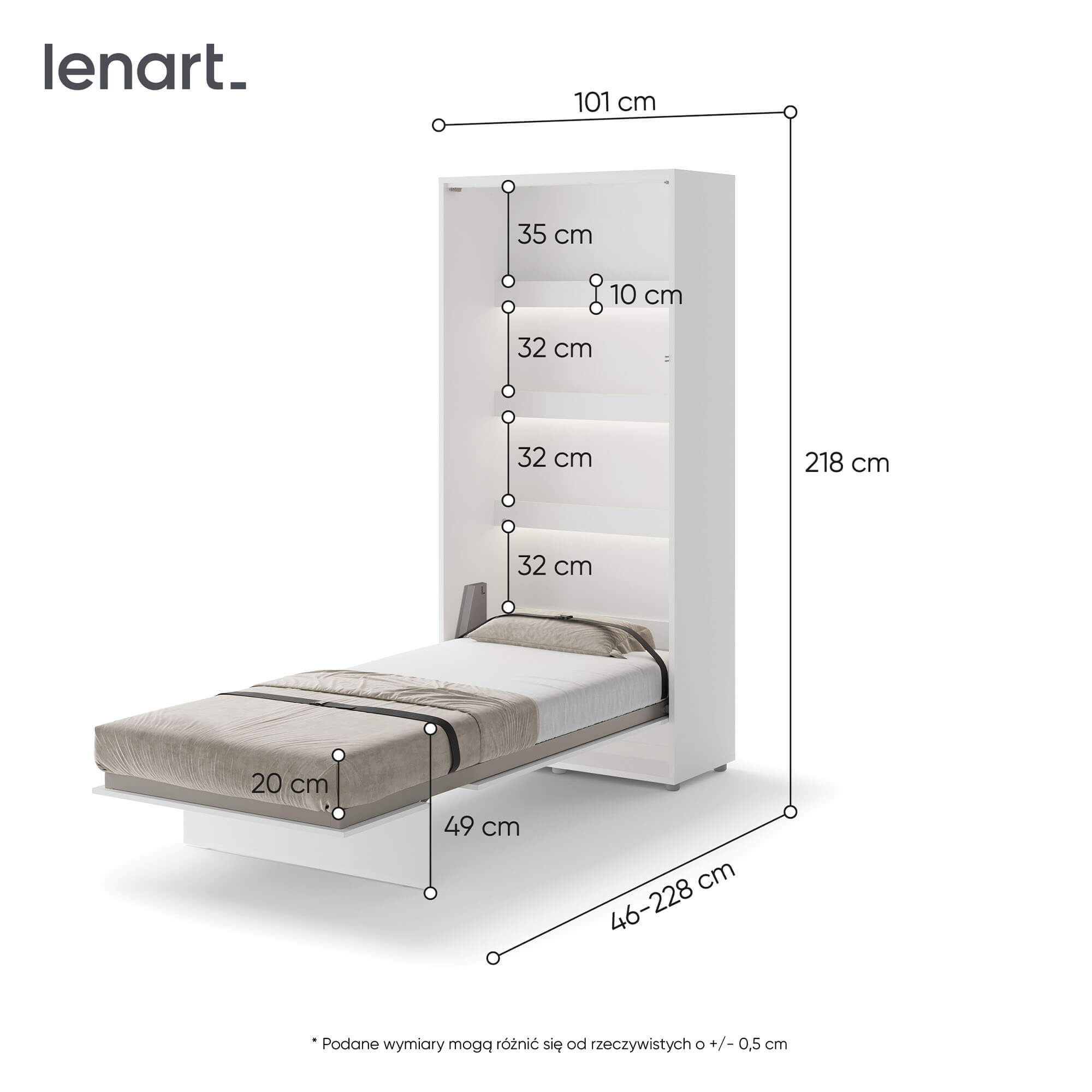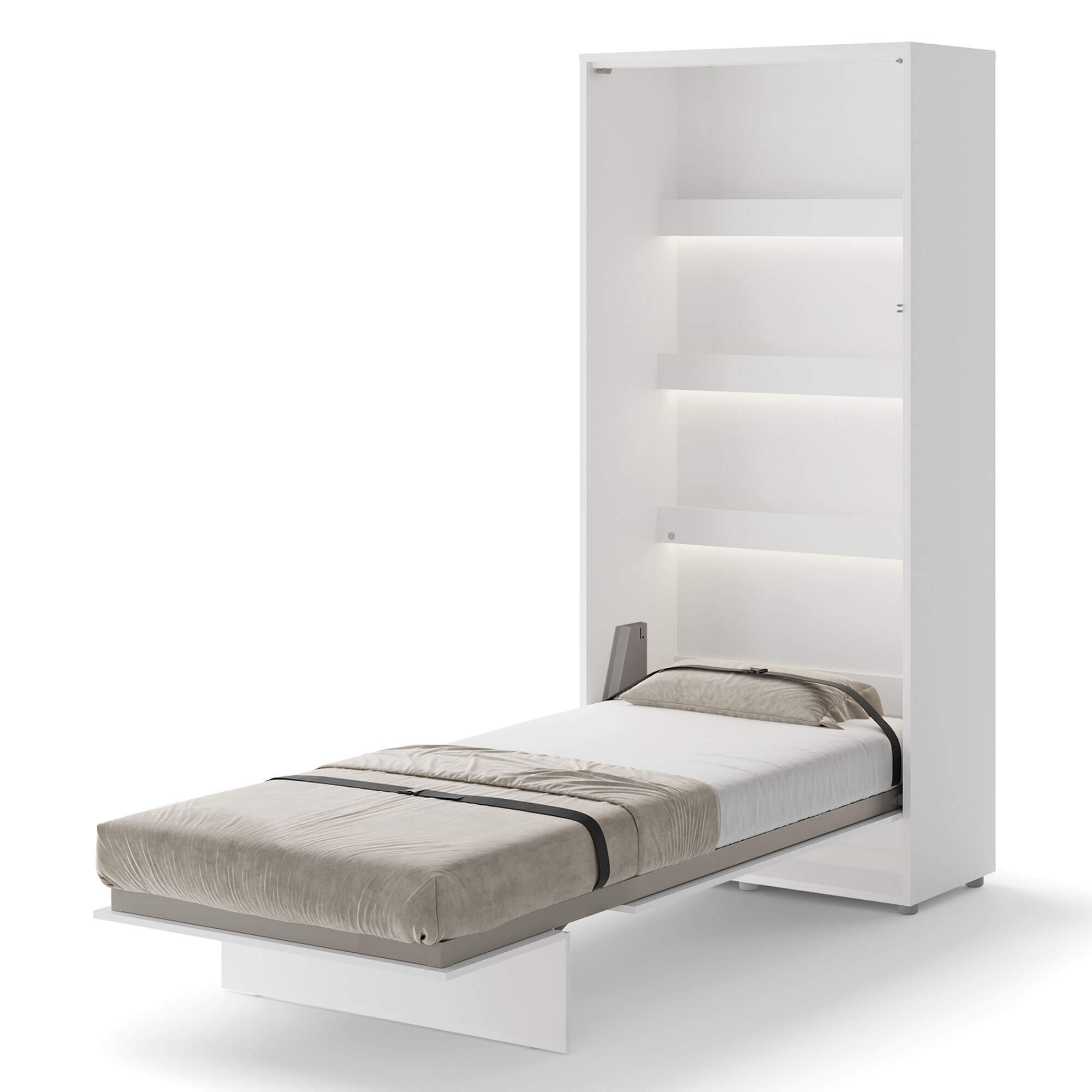 Lenart BED CONCEPT BC-03p półkotapczan pionowy 90 to nowoczesne łóżko chowane w szafie, które pozwala zaoszczędzić miejsce i jednocześnie zachować pełen komfort snu. Marka Lenart zaprojektowała funkcjonalny mebel w kolorze biały/biały połysk, który idealnie sprawdzi się w małych mieszkaniach, kawalerkach czy pokojach młodzieżowych. Dzięki niemu w kilka chwil przekształcisz dowolne pomieszczenie w wygodną sypialnię. Model BED CONCEPT BC-03p przeznaczony jest pod materac o szerokości 90 cm, co czyni go doskonałym wyborem dla singla, nastolatka lub starszego dziecka. Wewnątrz umieszczono dodatkowe półki, które świetnie sprawdzą się do przechowywania książek, dekoracji czy drobiazgów codziennego użytku. Półkotapczan wyróżnia się także bezpieczeństwem użytkowania – wyposażono go w pneumatyczne podnośniki, metalową ramę oraz solidny korpus montowany do ściany, co zapewnia stabilność i wygodę. Za nowoczesne rozwiązania i wysoką jakość wykonania model otrzymał prestiżową nagrodę Złoty Medal 2019 Międzynarodowych Targów Poznańskich. Dzięki eleganckiemu frontowi w połysku i minimalistycznemu wzornictwu, półkotapczan BC-03p pasuje do wielu stylów aranżacyjnych i pozwala łatwo dopasować się do innych mebli. To praktyczny mebel, który sprawdzi się w codziennym użytkowaniu, a także w pokoju gościnnym.