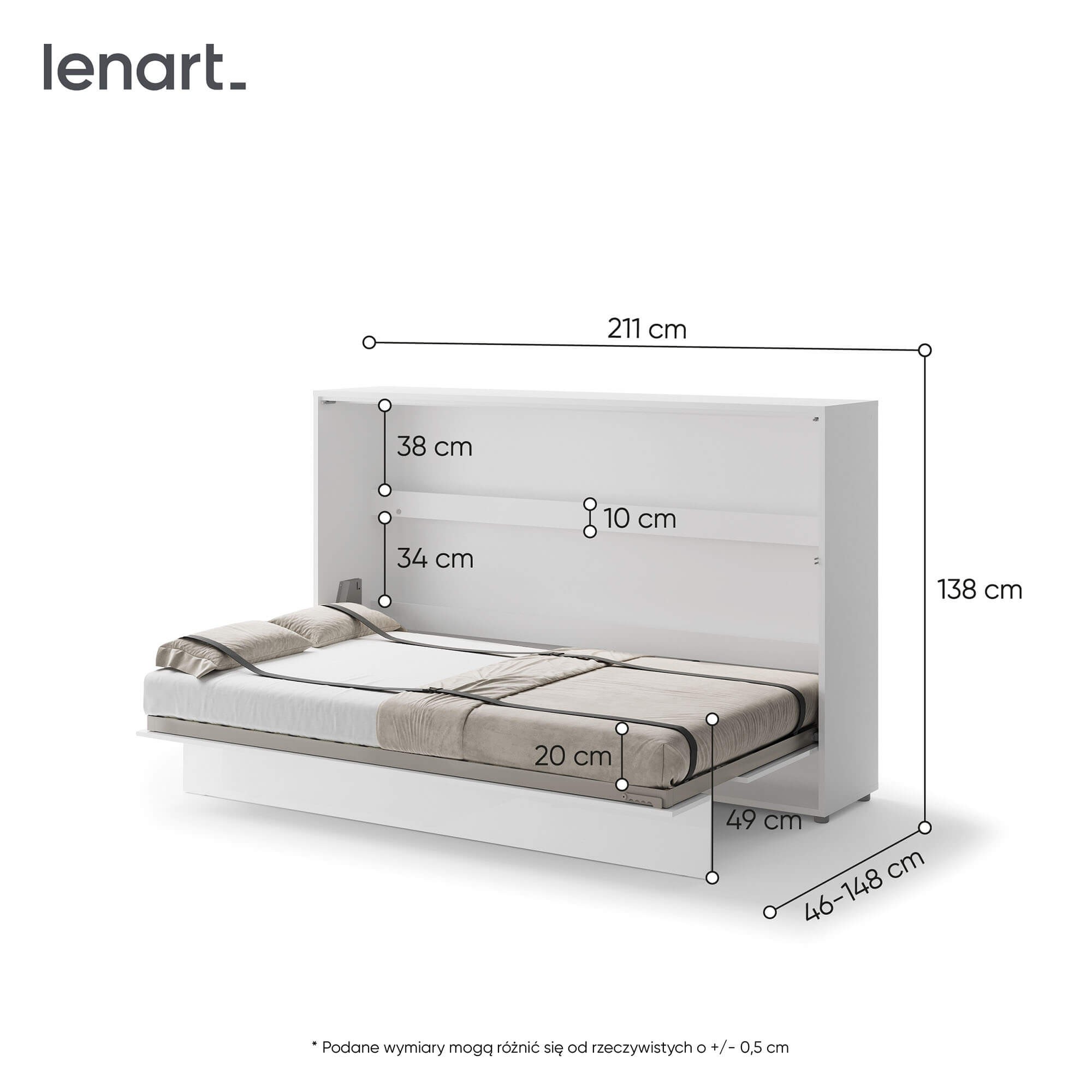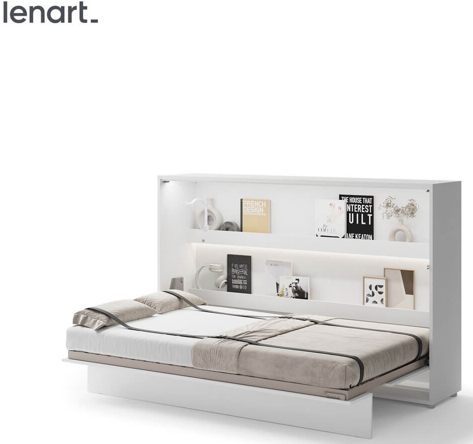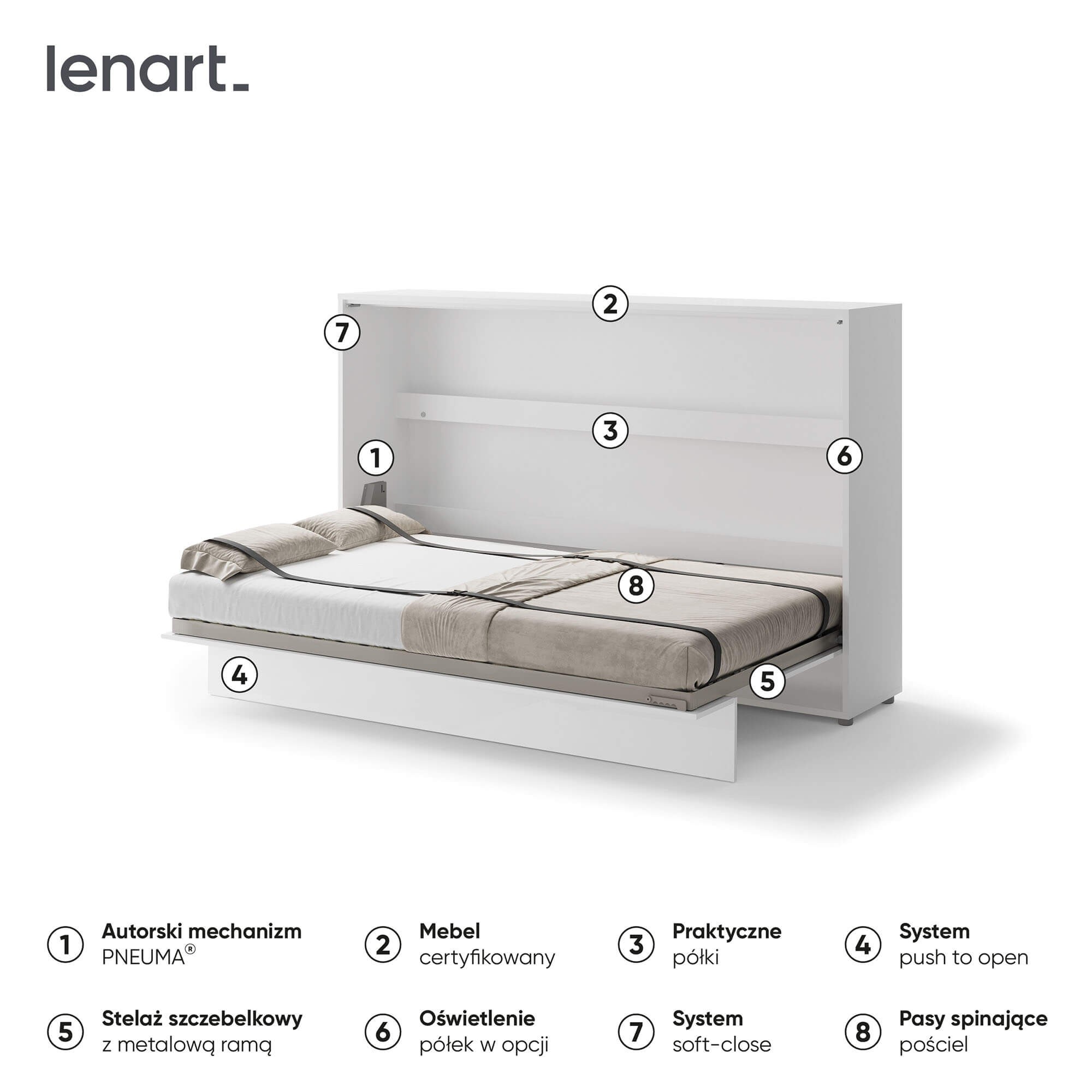 Lenart BED CONCEPT BC-05 półkotapczan poziomy 120 to funkcjonalne łóżko chowane w szafie, które świetnie sprawdzi się w mniejszych mieszkaniach i pokojach wielofunkcyjnych. Marka Lenart stworzyła rozwiązanie, które pozwala w kilka chwil zamienić salon czy pokój młodzieżowy w komfortową sypialnię. Wersja w kolorze białym jest uniwersalna i ponadczasowa, dzięki czemu z łatwością dopasujesz ją do różnych aranżacji wnętrz. Model BED CONCEPT BC-05 został zaprojektowany pod materac o szerokości 120 cm, co sprawia, że idealnie nadaje się jako przestronne łóżko dla singla, starszego dziecka lub nastolatka. We wnętrzu mebla umieszczono dodatkowe półki, które świetnie sprawdzą się do przechowywania książek, dekoracji lub drobiazgów codziennego użytku. Solidny korpus mocowany do ściany, metalowa rama i pneumatyczne podnośniki gwarantują bezpieczeństwo, trwałość i wygodę użytkowania. Za swoją innowacyjność i wysoką jakość wykonania mebel został uhonorowany Złotym Medalem 2019 Międzynarodowych Targów Poznańskich. To nowoczesny i praktyczny półkotapczan, który łączy w sobie funkcjonalność, wygodę oraz minimalistyczny design, sprawiając, że świetnie wpisuje się w potrzeby współczesnych wnętrz.