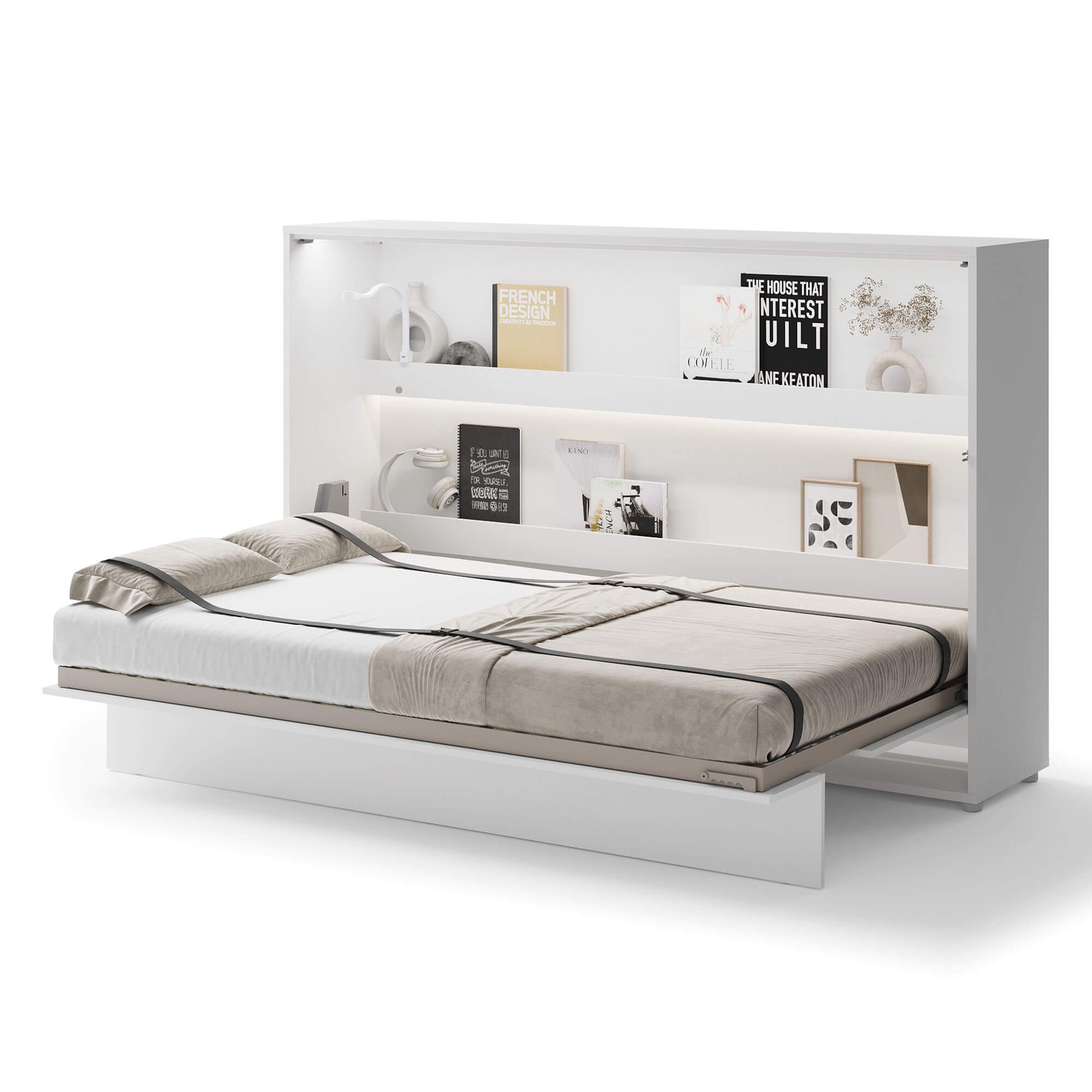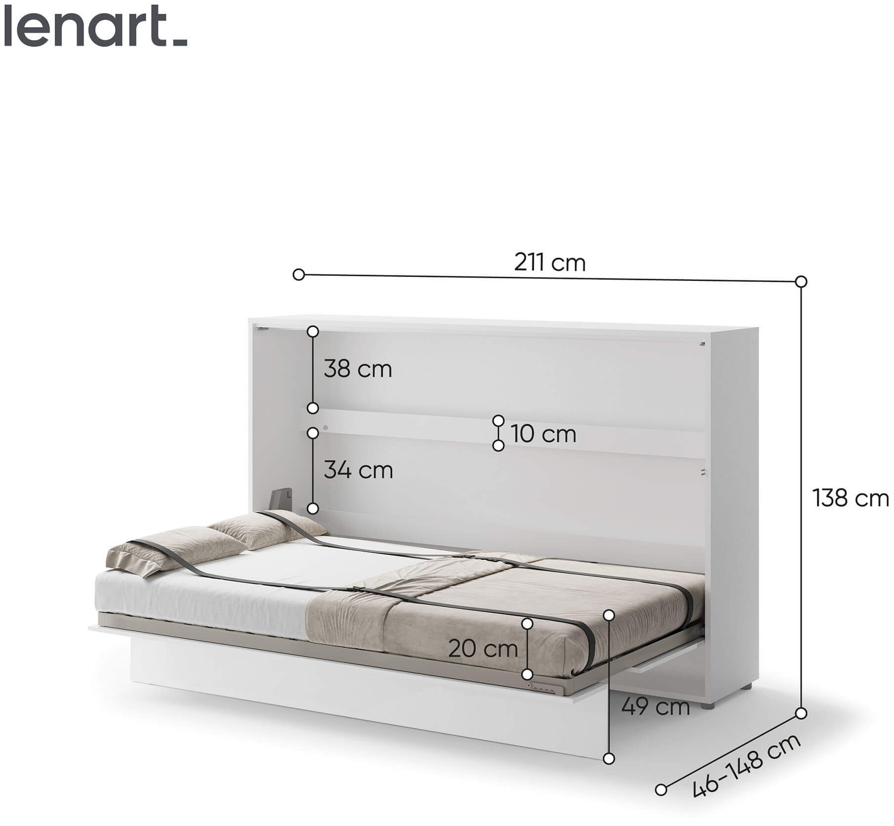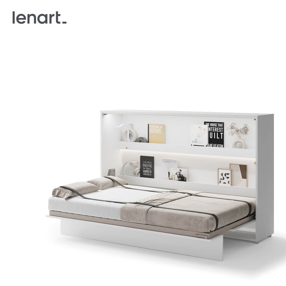 Lenart BED CONCEPT BC-05 półkotapczan poziomy 120 to funkcjonalne łóżko chowane w szafie, które świetnie sprawdzi się w mniejszych mieszkaniach i pokojach wielofunkcyjnych. Marka Lenart stworzyła rozwiązanie, które pozwala w kilka chwil zamienić salon czy pokój młodzieżowy w komfortową sypialnię. Wersja w kolorze białym jest uniwersalna i ponadczasowa, dzięki czemu z łatwością dopasujesz ją do różnych aranżacji wnętrz. Model BED CONCEPT BC-05 został zaprojektowany pod materac o szerokości 120 cm, co sprawia, że idealnie nadaje się jako przestronne łóżko dla singla, starszego dziecka lub nastolatka. We wnętrzu mebla umieszczono dodatkowe półki, które świetnie sprawdzą się do przechowywania książek, dekoracji lub drobiazgów codziennego użytku. Solidny korpus mocowany do ściany, metalowa rama i pneumatyczne podnośniki gwarantują bezpieczeństwo, trwałość i wygodę użytkowania. Za swoją innowacyjność i wysoką jakość wykonania mebel został uhonorowany Złotym Medalem 2019 Międzynarodowych Targów Poznańskich. To nowoczesny i praktyczny półkotapczan, który łączy w sobie funkcjonalność, wygodę oraz minimalistyczny design, sprawiając, że świetnie wpisuje się w potrzeby współczesnych wnętrz.