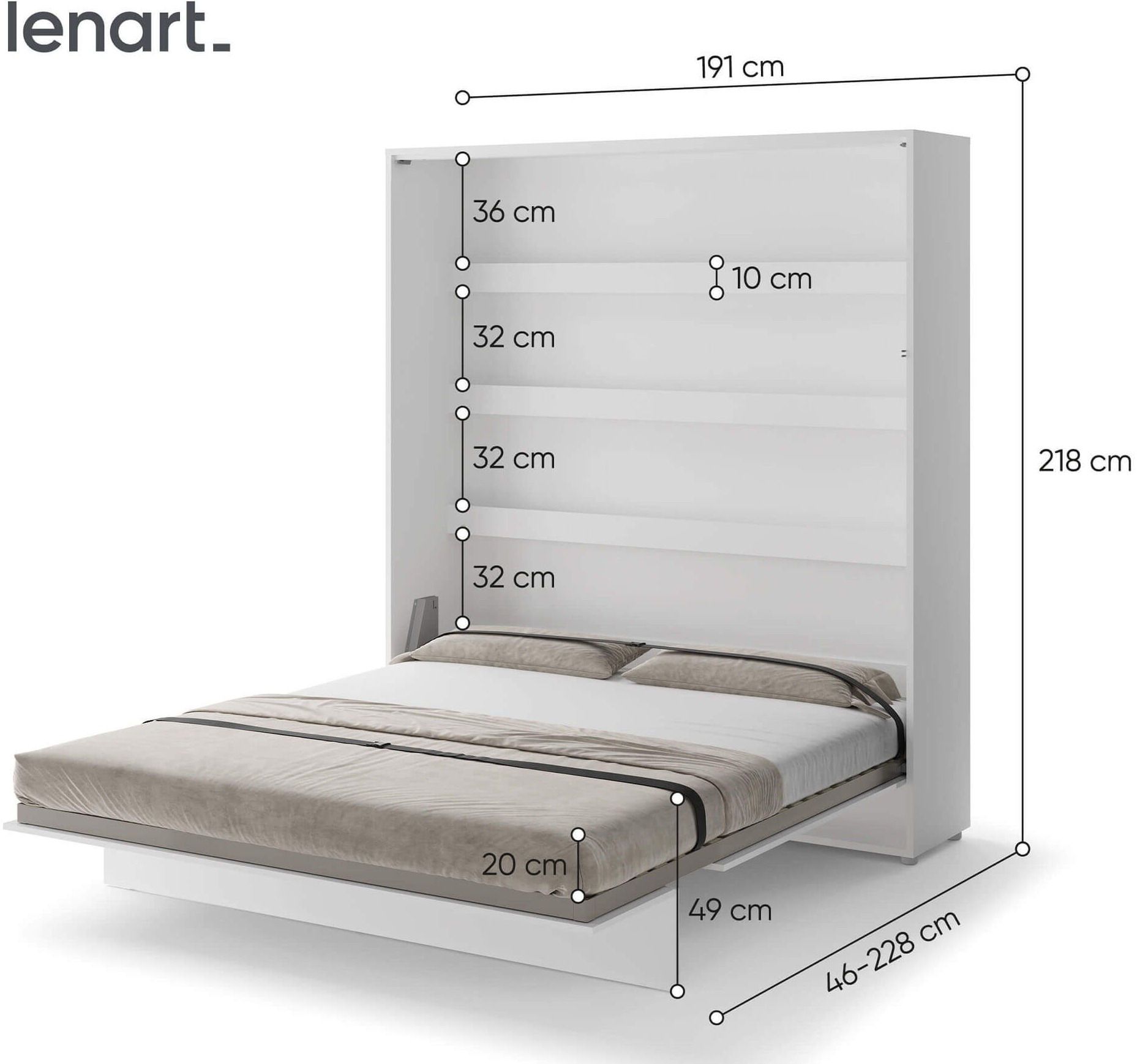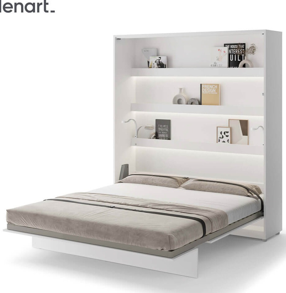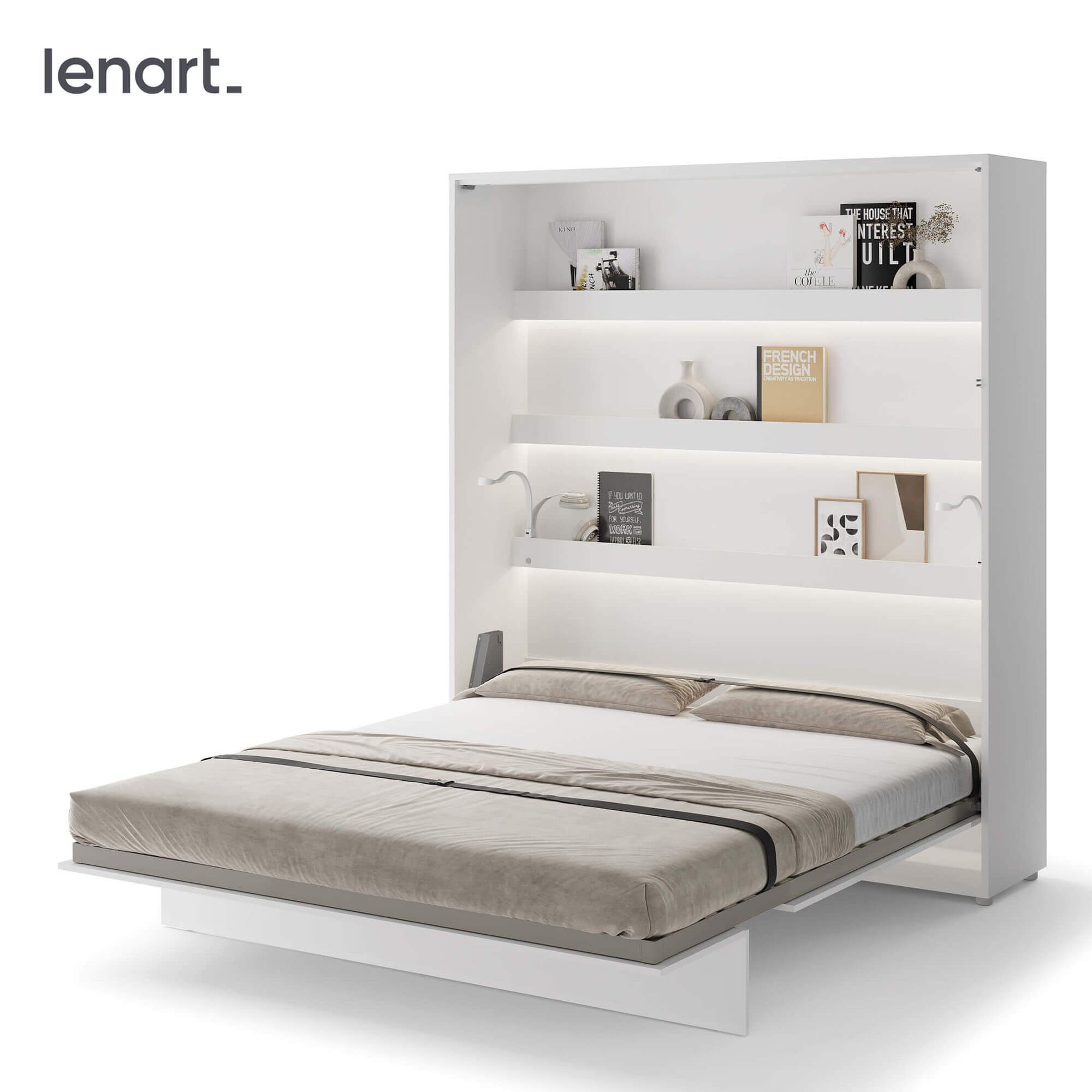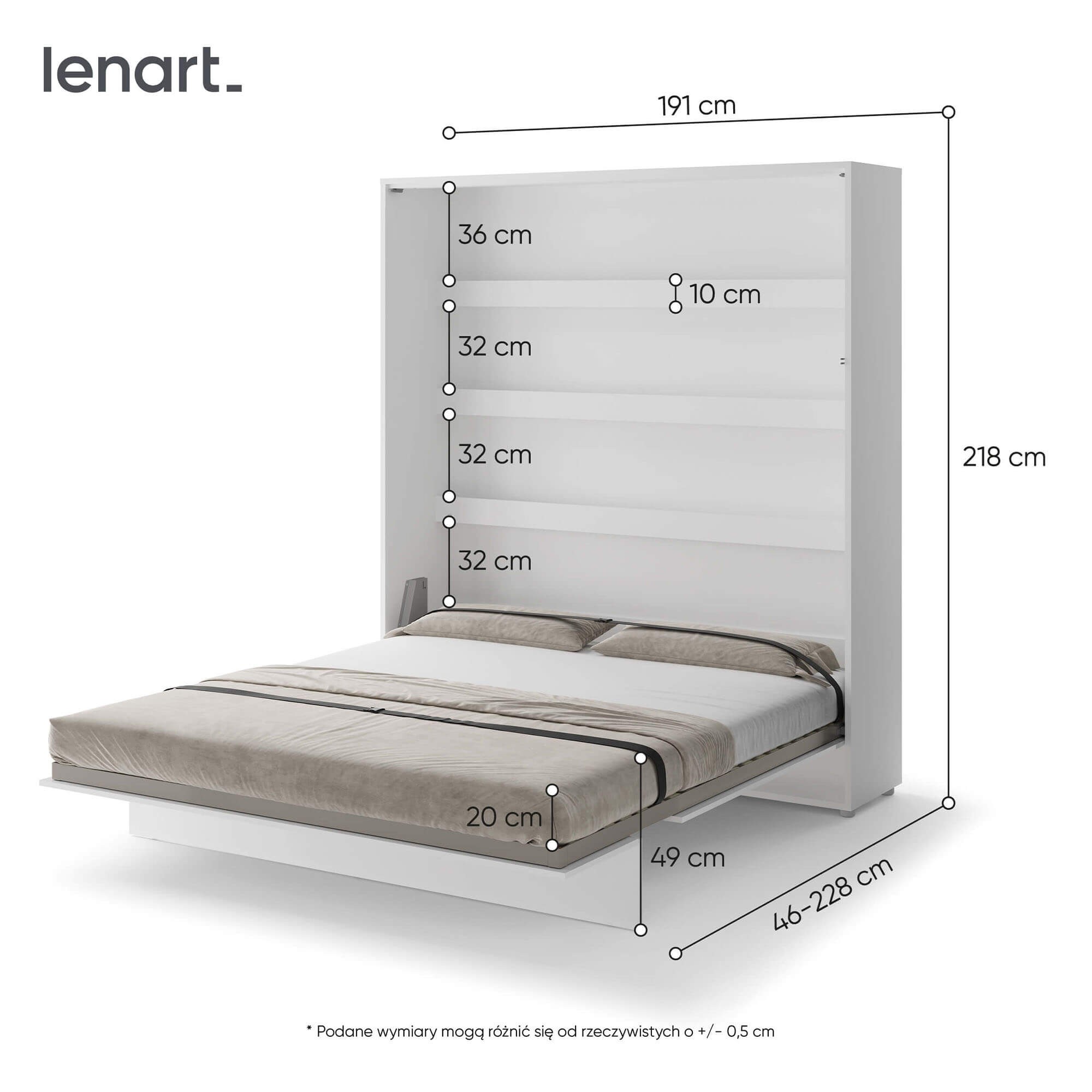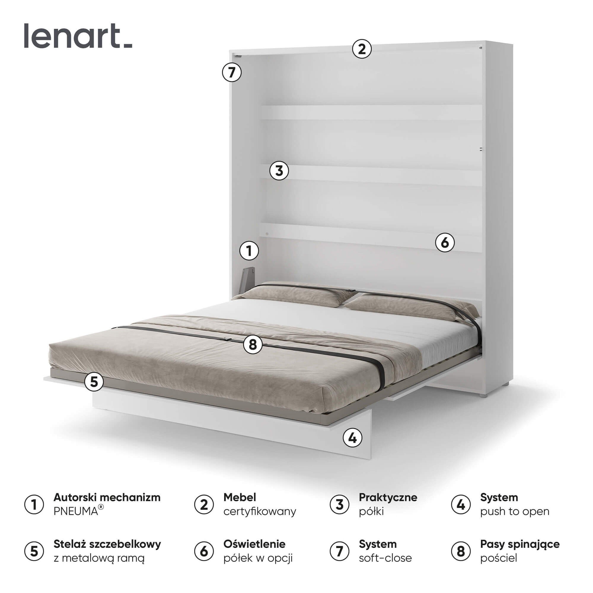 Lenart BED CONCEPT BC-13 to półkotapczan pionowy przeznaczony pod materac 180 cm. Marka Lenart zaprojektowała ten model tak, by połączyć wygodę codziennego snu z nowoczesnym designem i oszczędnością miejsca. W wersji w kolorze białym mebel doskonale rozjaśnia wnętrze i optycznie je powiększa, dzięki czemu sprawdzi się zarówno w małych mieszkaniach, jak i w przestronnych aranżacjach. Model BC-13 wyróżnia się praktycznym mechanizmem – otwieranie i zamykanie odbywa się lekko i bezpiecznie dzięki podnośnikom pneumatycznym. Stabilna metalowa rama, szczebelkowy stelaż oraz pasy spinające pościel sprawiają, że łóżko jest równie wygodne jak tradycyjny model, a przy tym pozwala w kilka chwil odzyskać przestrzeń w pomieszczeniu. Dodatkowym atutem są półki wewnętrzne, które mogą pełnić funkcję praktycznego miejsca na książki, telefon czy dekoracje. Półkotapczan BC-13 został nagrodzony Złotym Medalem 2019 Międzynarodowych Targów Poznańskich, co potwierdza jego wysoką jakość i innowacyjność. Mebel wykonano z płyty laminowanej i MDF, odpornych na uszkodzenia i wilgoć, a fronty i korpusy zabezpieczono obrzeżem ABS. Uchwyty ze skóry naturalnej podkreślają staranność wykończenia. Dodatkowo system soft close sprawia, że zamykanie jest niemal bezgłośne.