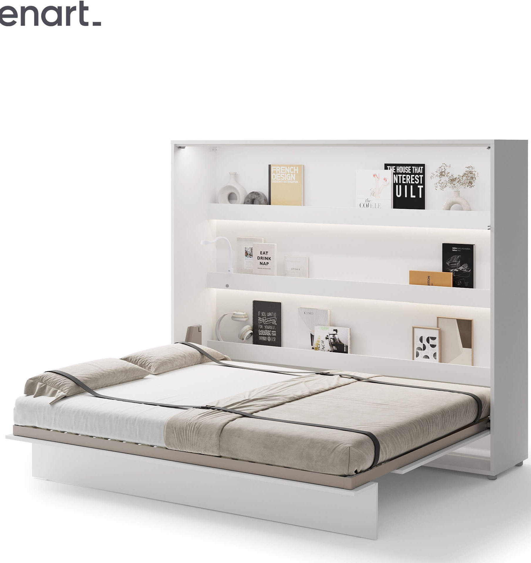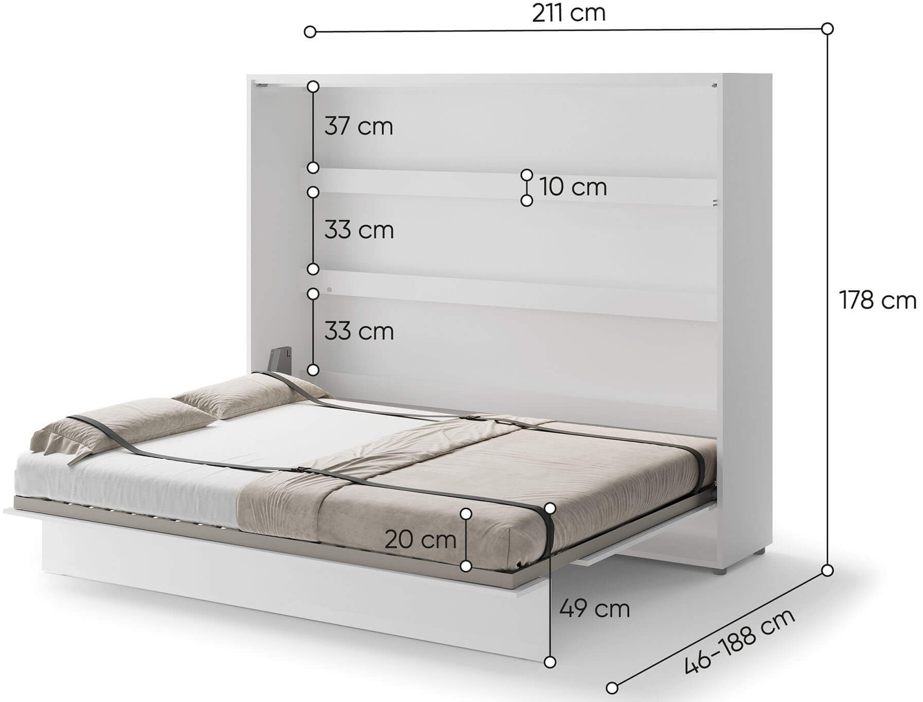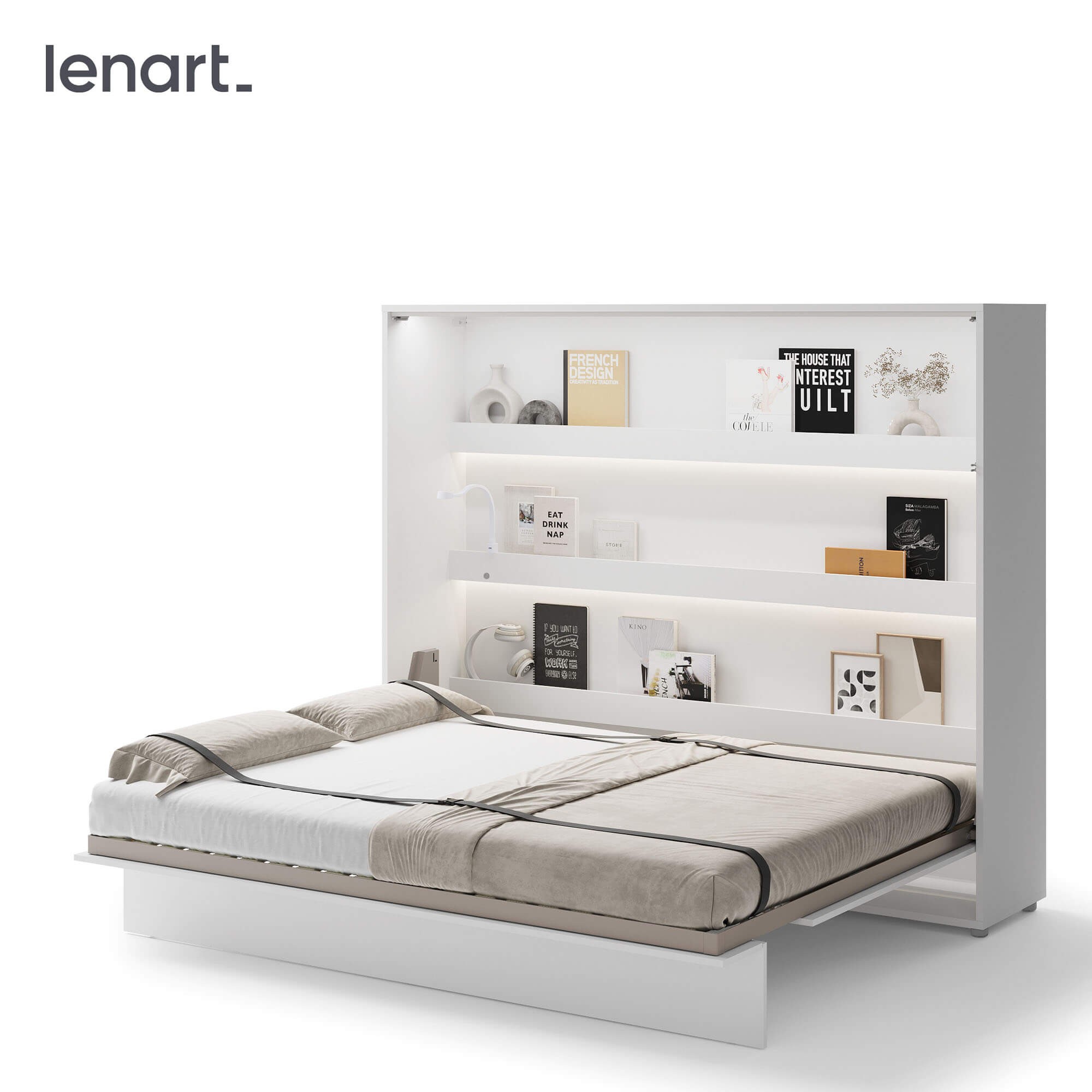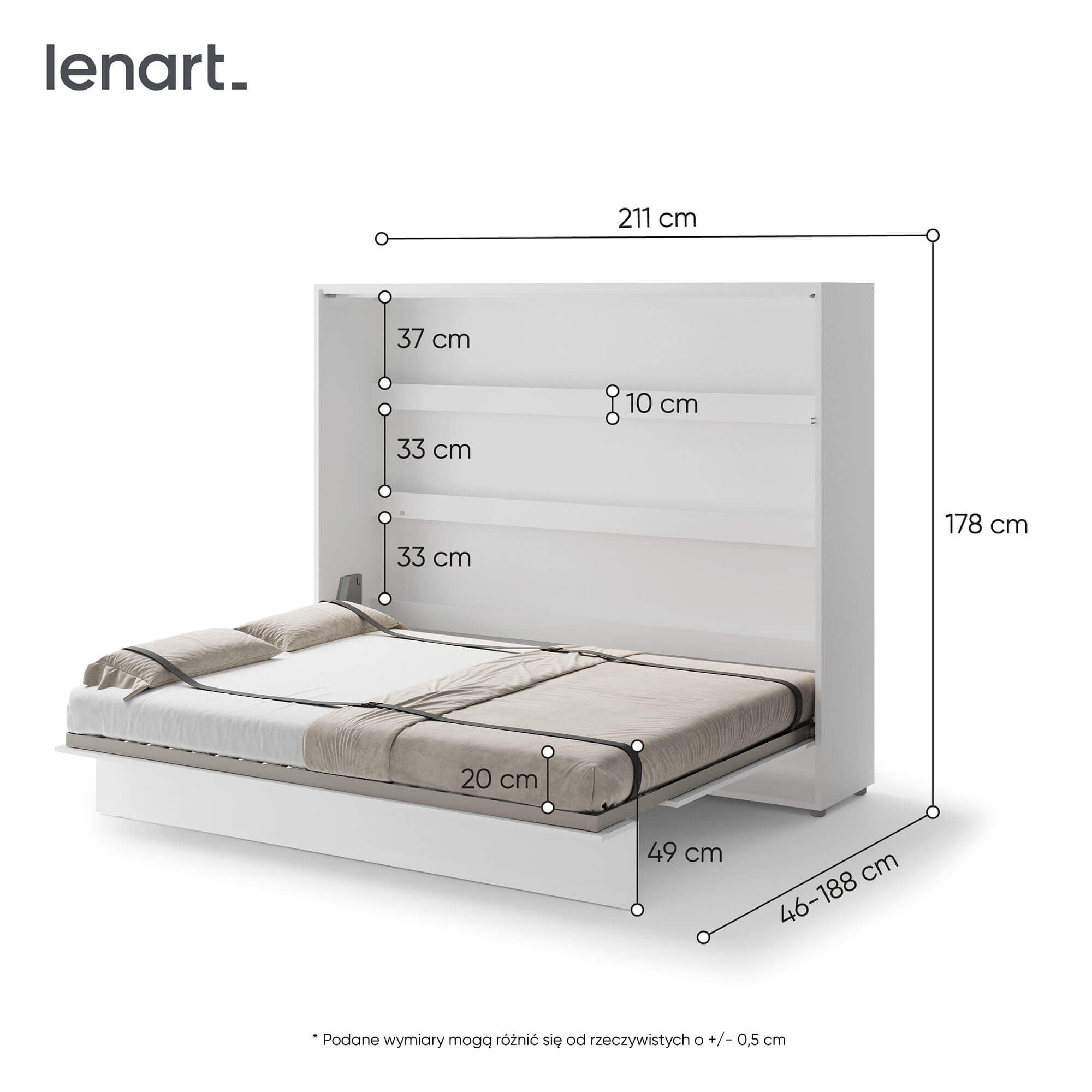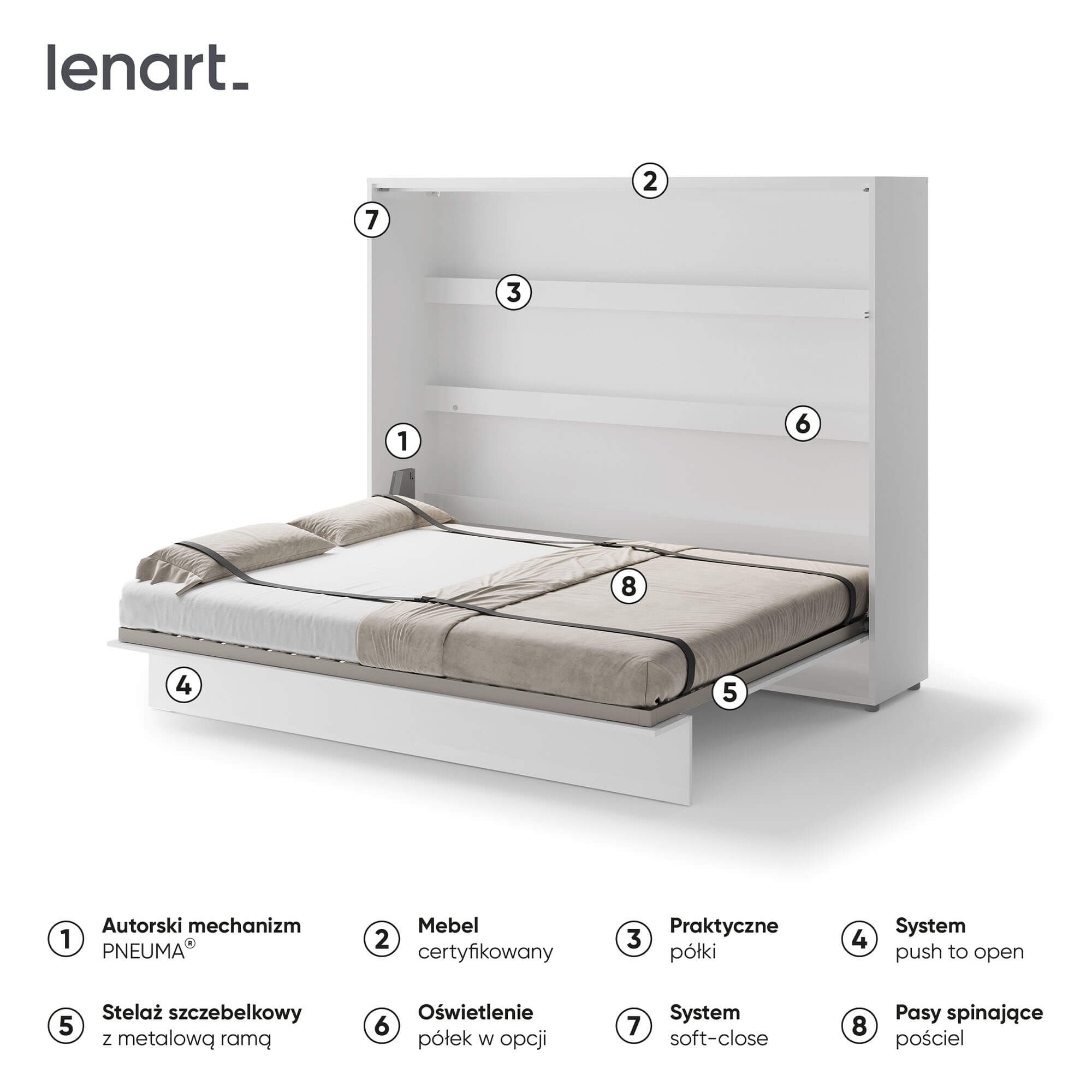 Lenart BED CONCEPT BC-14 to półkotapczan poziomy przeznaczony pod materac 160 cm. Marka Lenart zaprojektowała ten model tak, aby łączył wygodę codziennego użytkowania z oszczędnością miejsca i nowoczesnym stylem. Dzięki poziomej konstrukcji BC-14 świetnie sprawdzi się w mniejszych pomieszczeniach, pozwalając na komfortowy sen i szybkie odzyskanie przestrzeni w ciągu dnia. Łóżko wyposażono w praktyczne półki wewnętrzne, które są idealne do przechowywania książek, dekoracji czy codziennych drobiazgów, takich jak telefon czy budzik. Stabilna metalowa rama, szczebelkowy stelaż i pneumatyczne podnośniki sprawiają, że półkotapczan jest równie wygodny i trwały jak tradycyjne łóżko. System soft close zapewnia ciche i bezpieczne zamykanie, a pasy spinające pościel umożliwiają chowanie łóżka wraz z kołdrą i poduszkami, bez konieczności dodatkowego miejsca do przechowywania. Mebel wykonano z płyty laminowanej i MDF odpornych na zarysowania, wilgoć i wysoką temperaturę. Fronty i korpusy zabezpieczono obrzeżem ABS, a całość uzupełnia uchwyt ze skóry naturalnej. Istnieje możliwość doposażenia go w funkcjonalne nadstawki oraz oświetlenie LED.