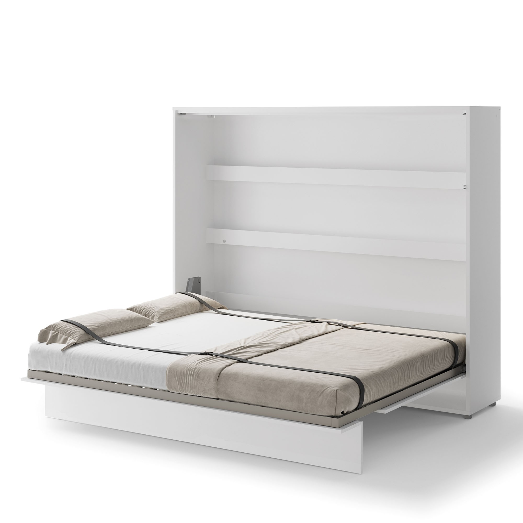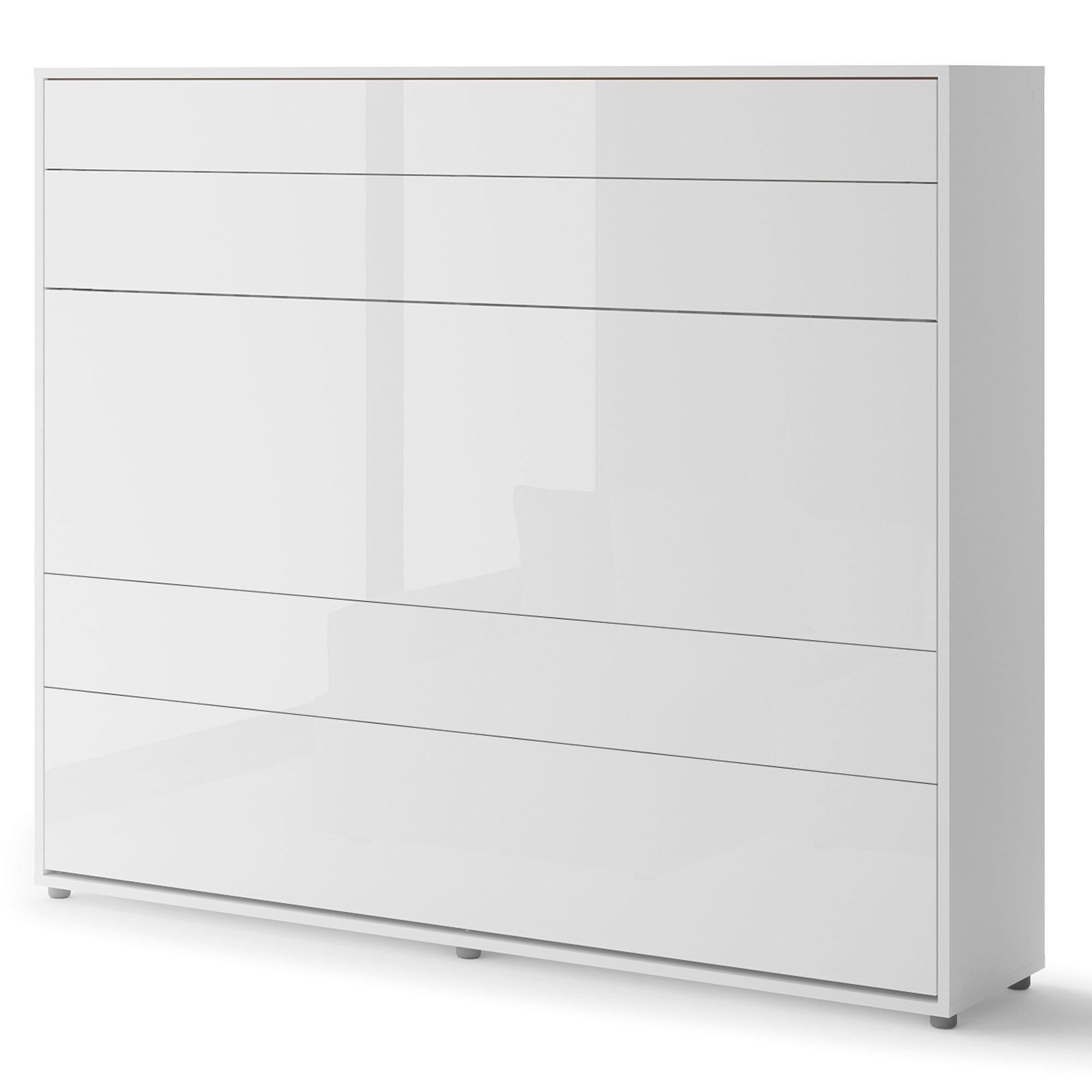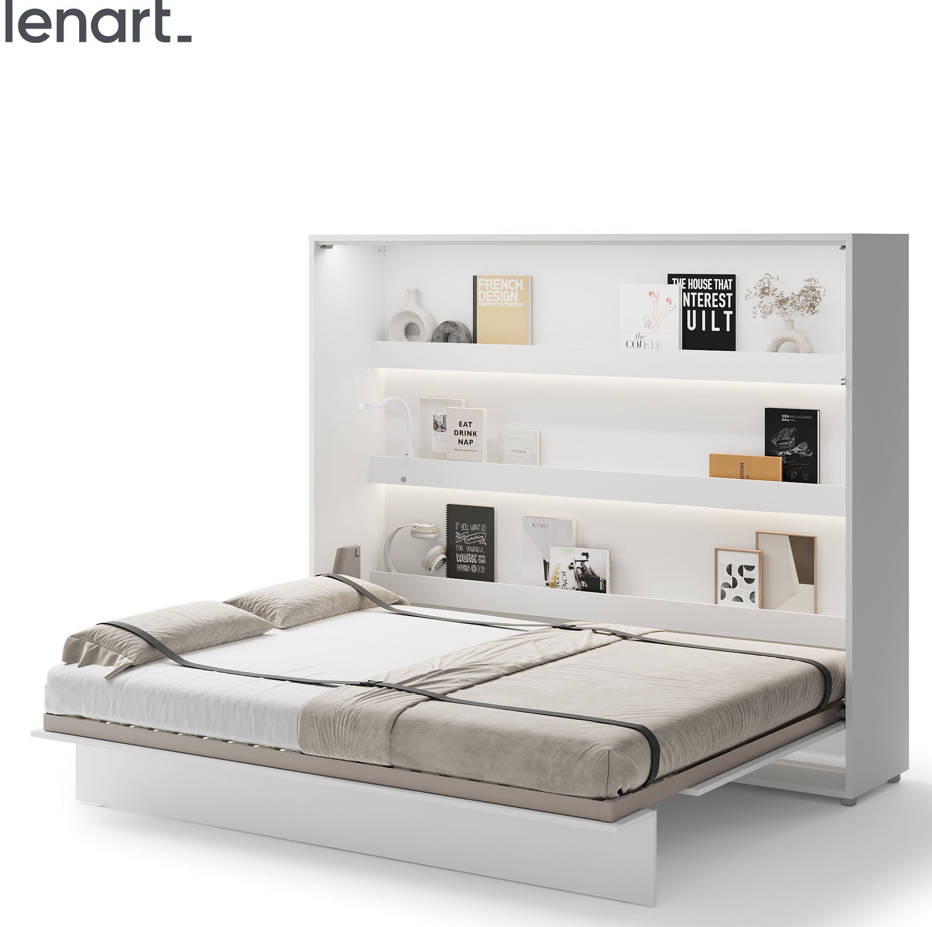 Lenart BED CONCEPT BC-14 to półkotapczan poziomy pod materac 160 cm, w eleganckim kolorze biały/biały połysk. Marka Lenart stworzyła mebel, który łączy komfort codziennego spania z nowoczesnym wyglądem i maksymalnym wykorzystaniem przestrzeni. Model BC-14 to idealne rozwiązanie do mieszkań, w których liczy się każdy metr, a jednocześnie zależy Ci na wygodzie i estetyce. Łóżko zostało wyposażone w półki wewnętrzne, dzięki którym możesz przechowywać książki, dekoracje lub codzienne drobiazgi, takie jak telefon czy okulary. Pneumatyczne podnośniki ułatwiają otwieranie i zamykanie, a całość działa płynnie i bezpiecznie. Metalowa rama, szczebelkowy stelaż oraz stabilizator materaca sprawiają, że półkotapczan jest równie wygodny jak tradycyjne łóżko, a system soft close zapewnia ciche i komfortowe użytkowanie. Fronty w połysku nie tylko nadają meblowi eleganckiego charakteru, ale też rozjaśniają wnętrze i dodają mu lekkości. Konstrukcja z płyty laminowanej i MDF zabezpieczona obrzeżem ABS gwarantuje odporność na uszkodzenia i długie użytkowanie. Półkotapczan BC-14 został nagrodzony Złotym Medalem 2019 Międzynarodowych Targów Poznańskich, co potwierdza jego wysoką jakość i funkcjonalność. Dodatkowo można go doposażyć w nadstawki oraz oświetlenie LED, takie jak LEDBC4.