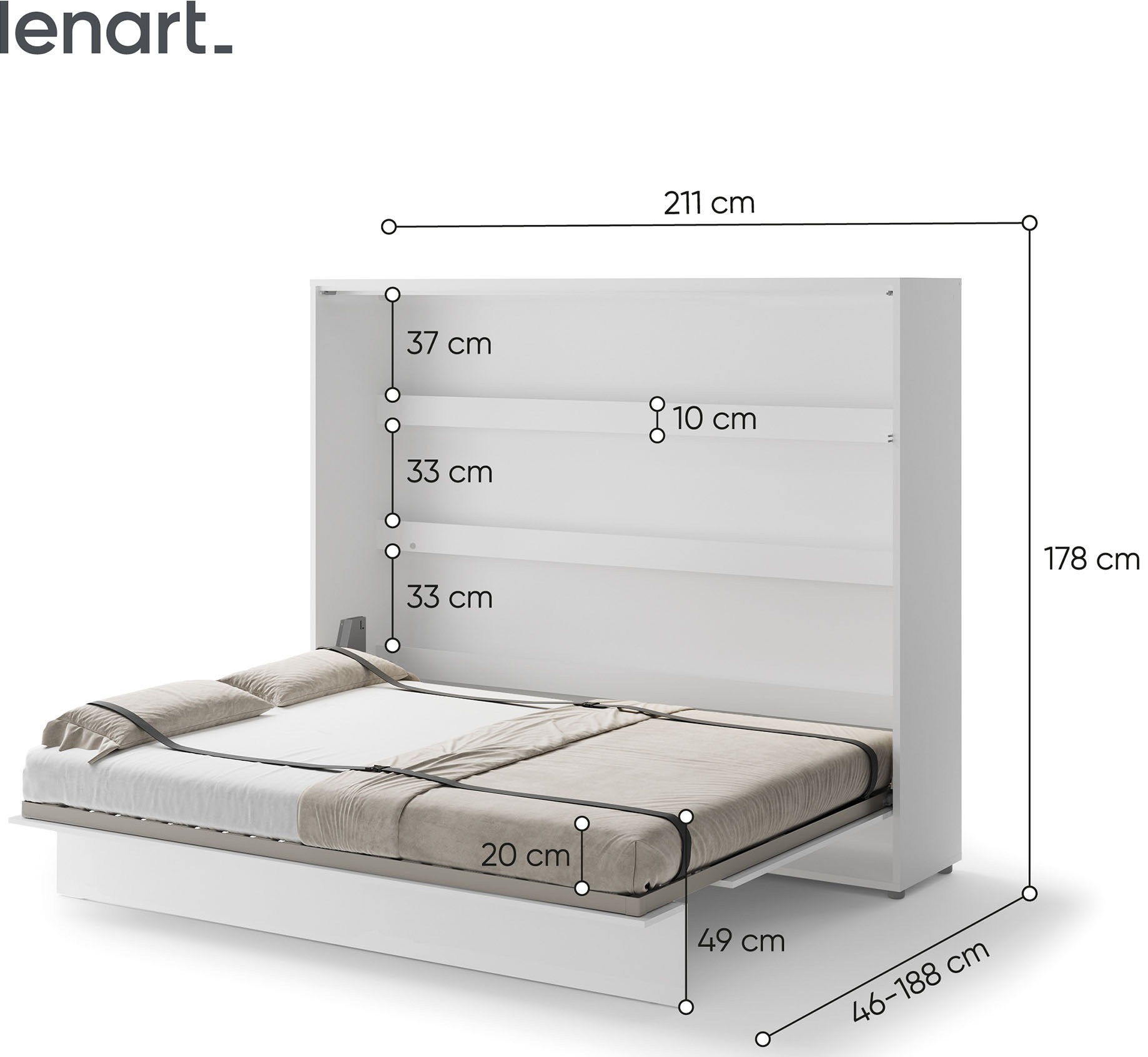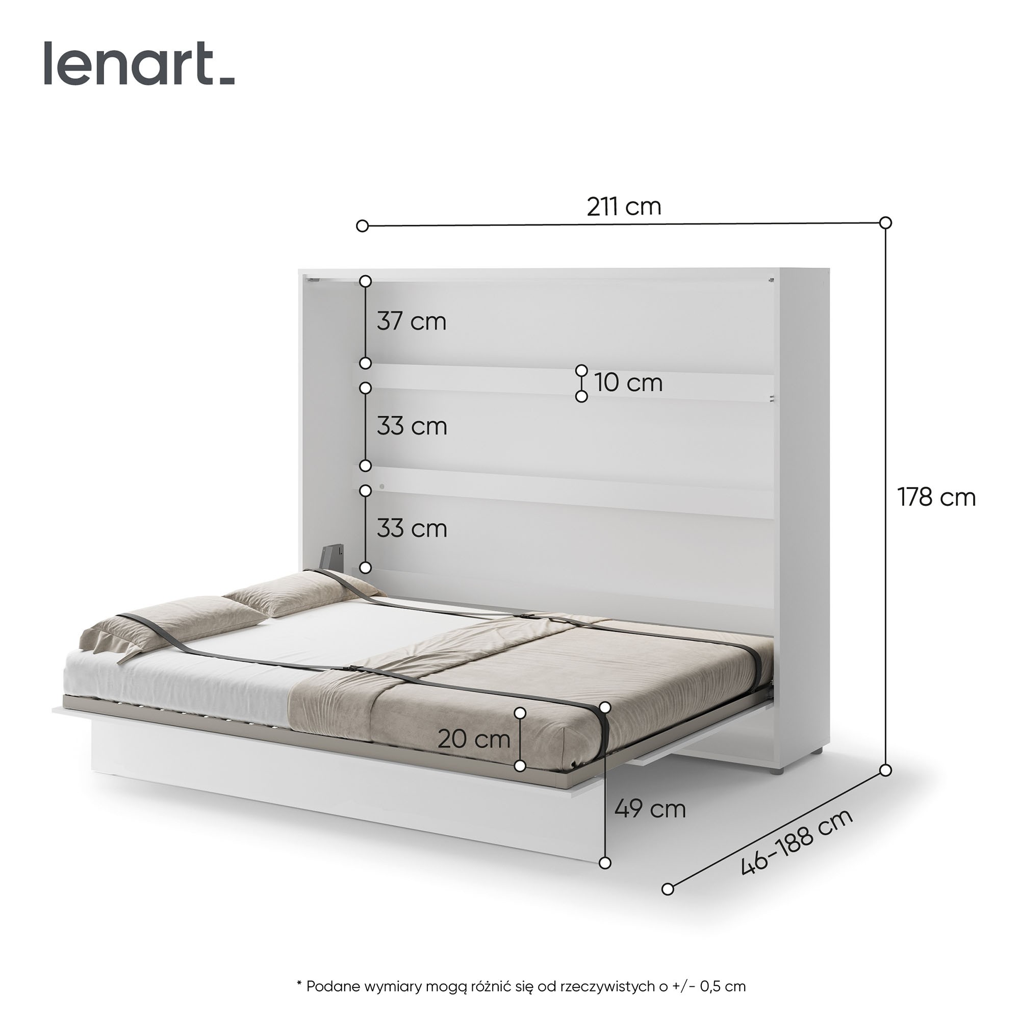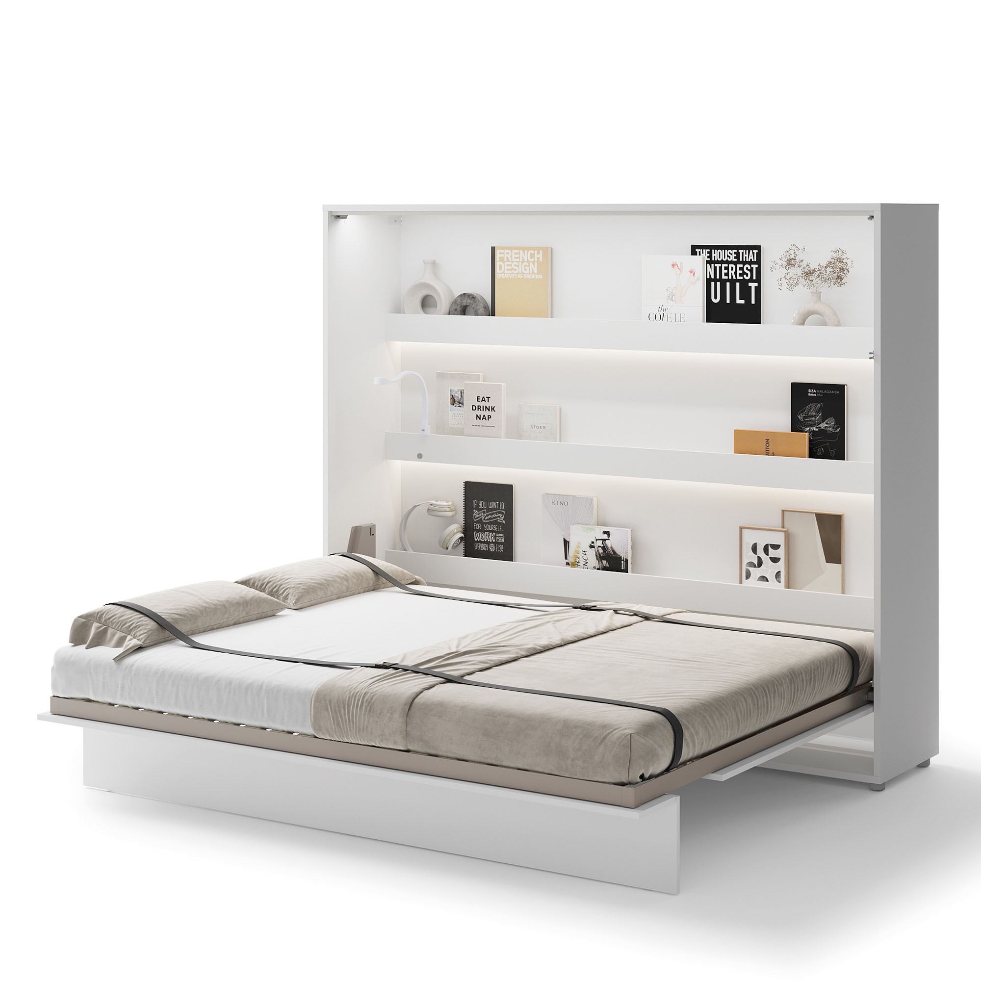 Lenart BED CONCEPT BC-14 to półkotapczan poziomy pod materac 160 cm, w eleganckim kolorze biały/biały połysk. Marka Lenart stworzyła mebel, który łączy komfort codziennego spania z nowoczesnym wyglądem i maksymalnym wykorzystaniem przestrzeni. Model BC-14 to idealne rozwiązanie do mieszkań, w których liczy się każdy metr, a jednocześnie zależy Ci na wygodzie i estetyce. Łóżko zostało wyposażone w półki wewnętrzne, dzięki którym możesz przechowywać książki, dekoracje lub codzienne drobiazgi, takie jak telefon czy okulary. Pneumatyczne podnośniki ułatwiają otwieranie i zamykanie, a całość działa płynnie i bezpiecznie. Metalowa rama, szczebelkowy stelaż oraz stabilizator materaca sprawiają, że półkotapczan jest równie wygodny jak tradycyjne łóżko, a system soft close zapewnia ciche i komfortowe użytkowanie. Fronty w połysku nie tylko nadają meblowi eleganckiego charakteru, ale też rozjaśniają wnętrze i dodają mu lekkości. Konstrukcja z płyty laminowanej i MDF zabezpieczona obrzeżem ABS gwarantuje odporność na uszkodzenia i długie użytkowanie. Półkotapczan BC-14 został nagrodzony Złotym Medalem 2019 Międzynarodowych Targów Poznańskich, co potwierdza jego wysoką jakość i funkcjonalność. Dodatkowo można go doposażyć w nadstawki oraz oświetlenie LED, takie jak LEDBC4.