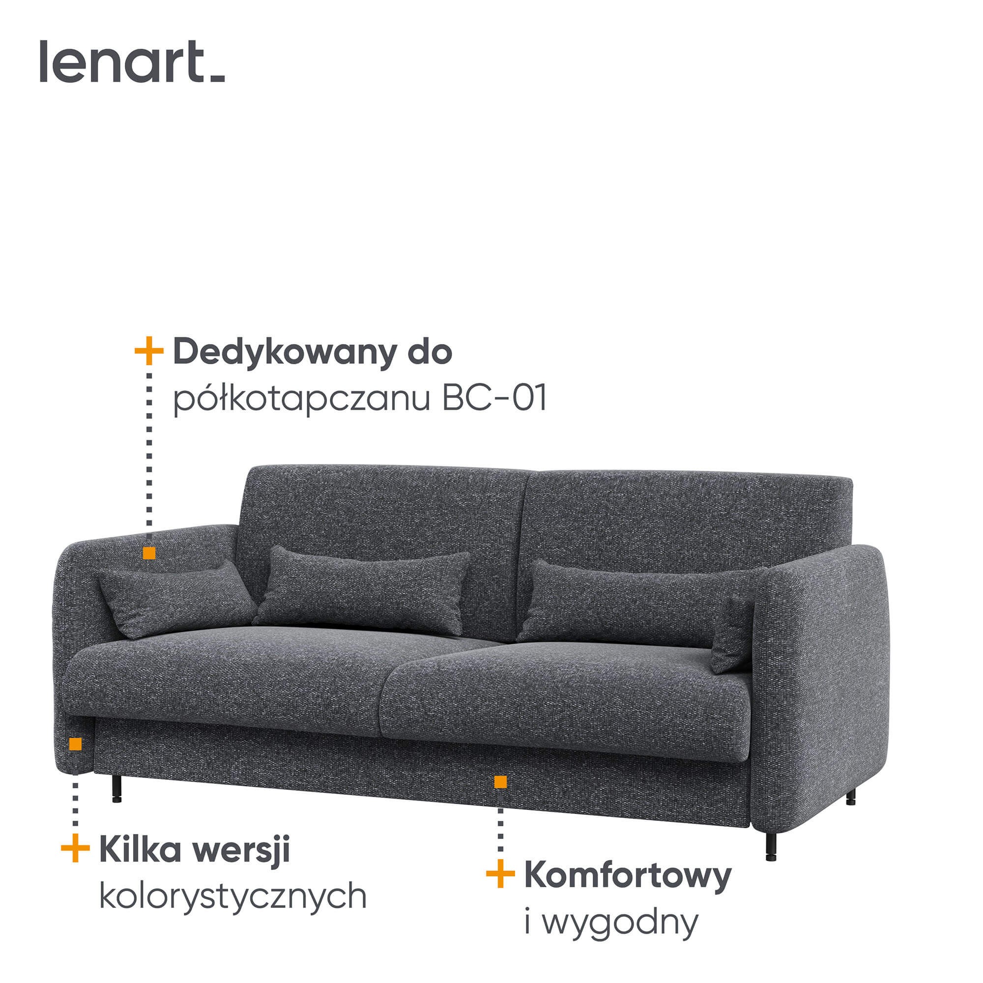 Lenart BED CONCEPT BC-18 to sofa dedykowana do półkotapczanu BC-01 pod materac o szerokości 140 cm. Marka Lenart przygotowała ten model z myślą o osobach, które chcą połączyć funkcjonalność z eleganckim stylem. Sofa BC-18 w tkaninie ART 82630 w kolorze grafitowym i z frontem w wybarwieniu dąb artisan to nowoczesne rozwiązanie, które dodaje wnętrzu przytulnego charakteru i naturalnego uroku. System BED CONCEPT umożliwia szybkie przekształcenie salonu w pełnowymiarową sypialnię. Sofa w ciągu dnia zapewnia wygodne miejsce do wypoczynku i spotkań, a wieczorem zmienia się w komfortowe łóżko. To idealne rozwiązanie do małych mieszkań, które pozwala optymalnie wykorzystać każdy centymetr przestrzeni, nie tracąc przy tym estetyki.