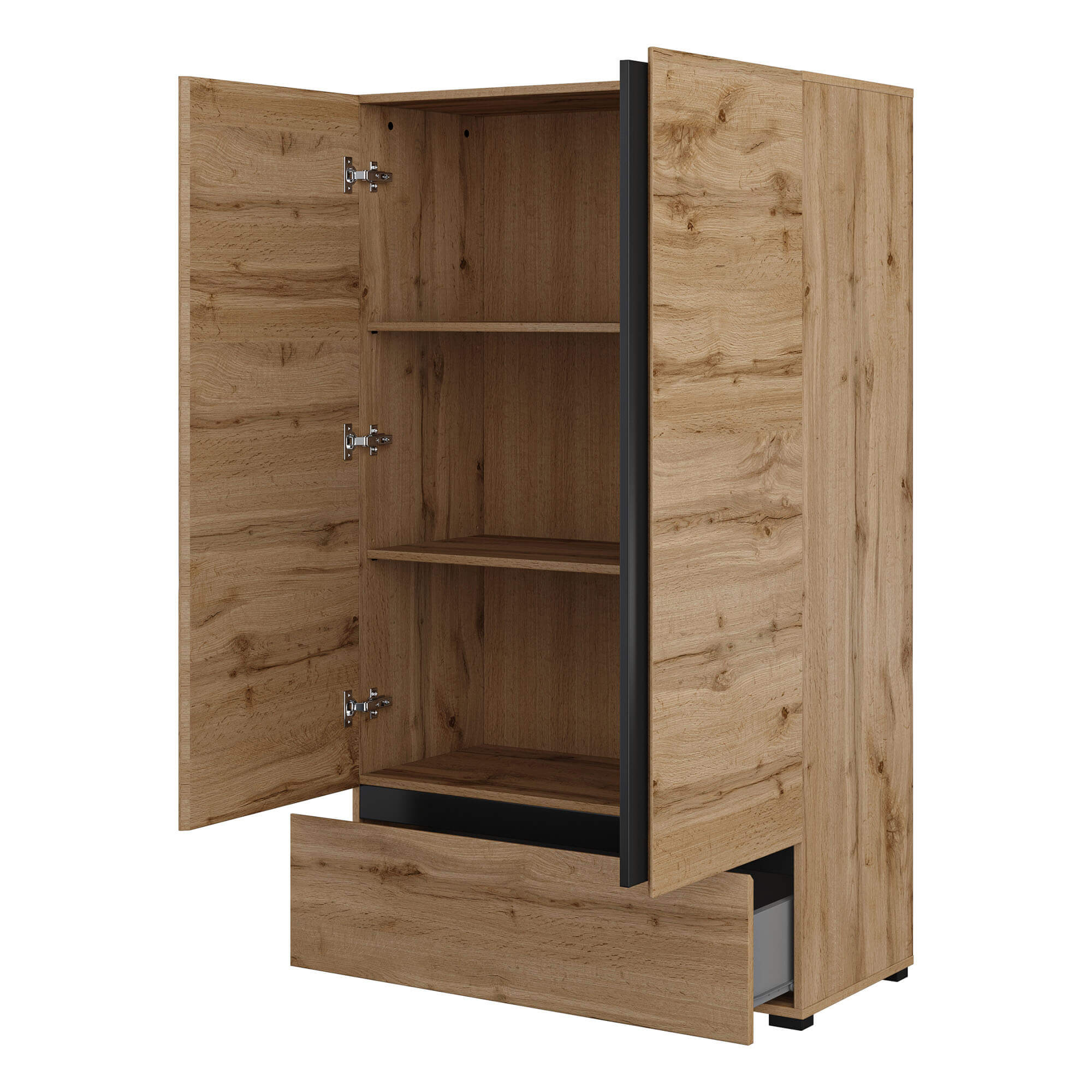 • Fronty w modnym wykończeniu dąb wotan nadającym meblowi lekkości i nowoczesnego charakteru.