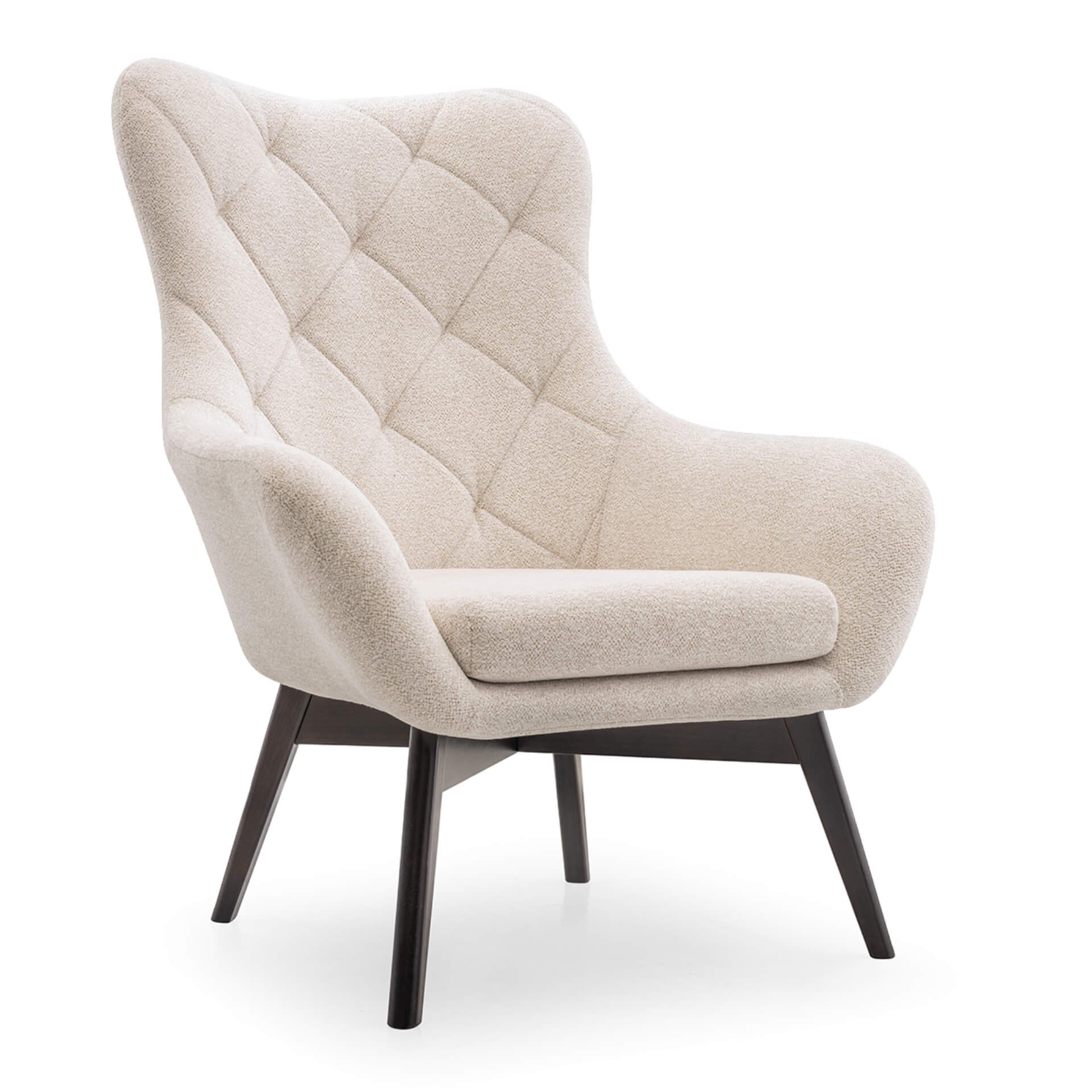 Prezentowany na zdjęciu fotel na nóżkach tapicerowany jest przytulną tkaniną typu boucle, która doskonale sprawdza się w nowoczesnych aranżacjach. Jednak model ten wykonujemy na indywidualnie zamówienie - oferujemy możliwość wyboru koloru oraz tkaniny, byś mogła/mógł idealnie dopasować mebel do własnego gustu i wystroju pokoju.