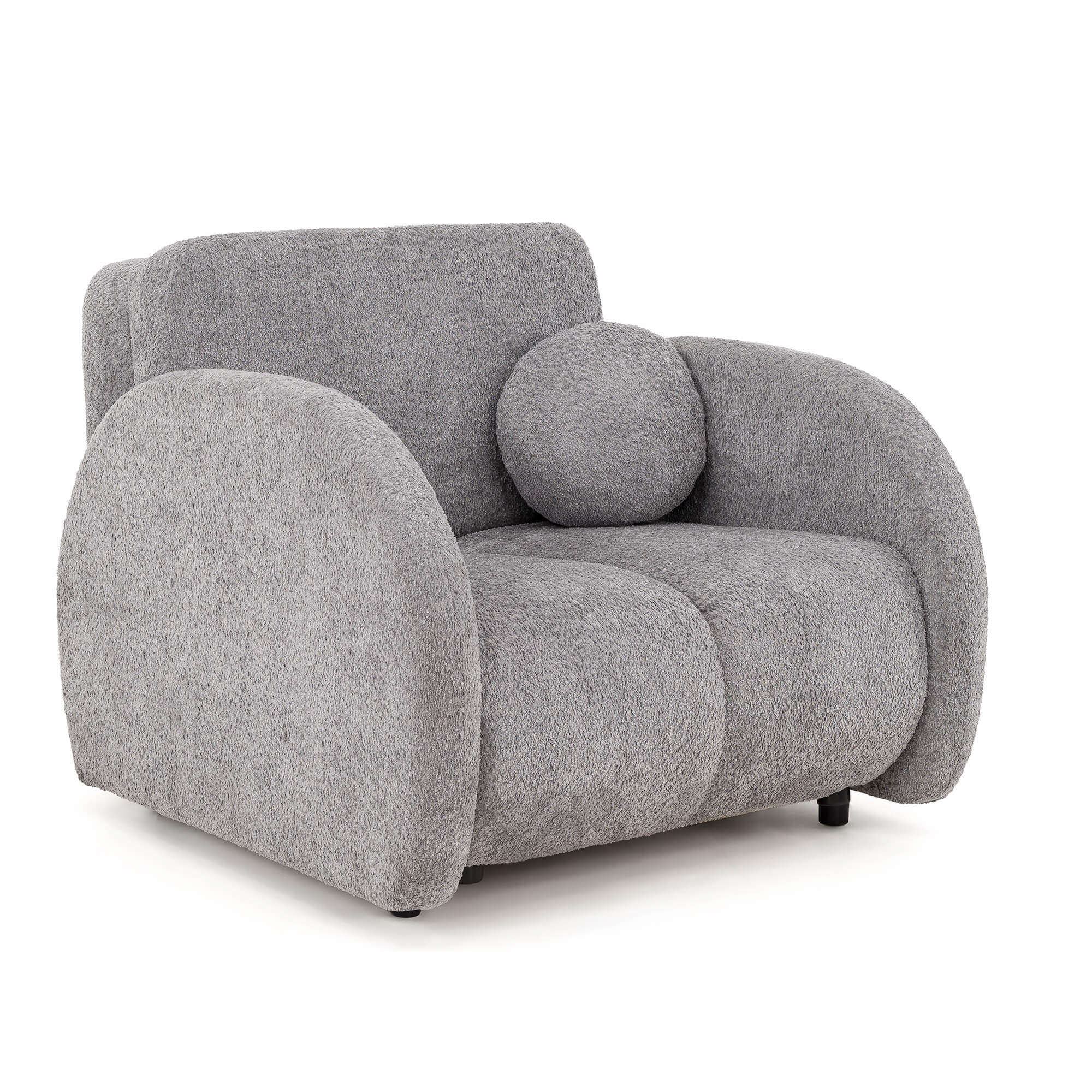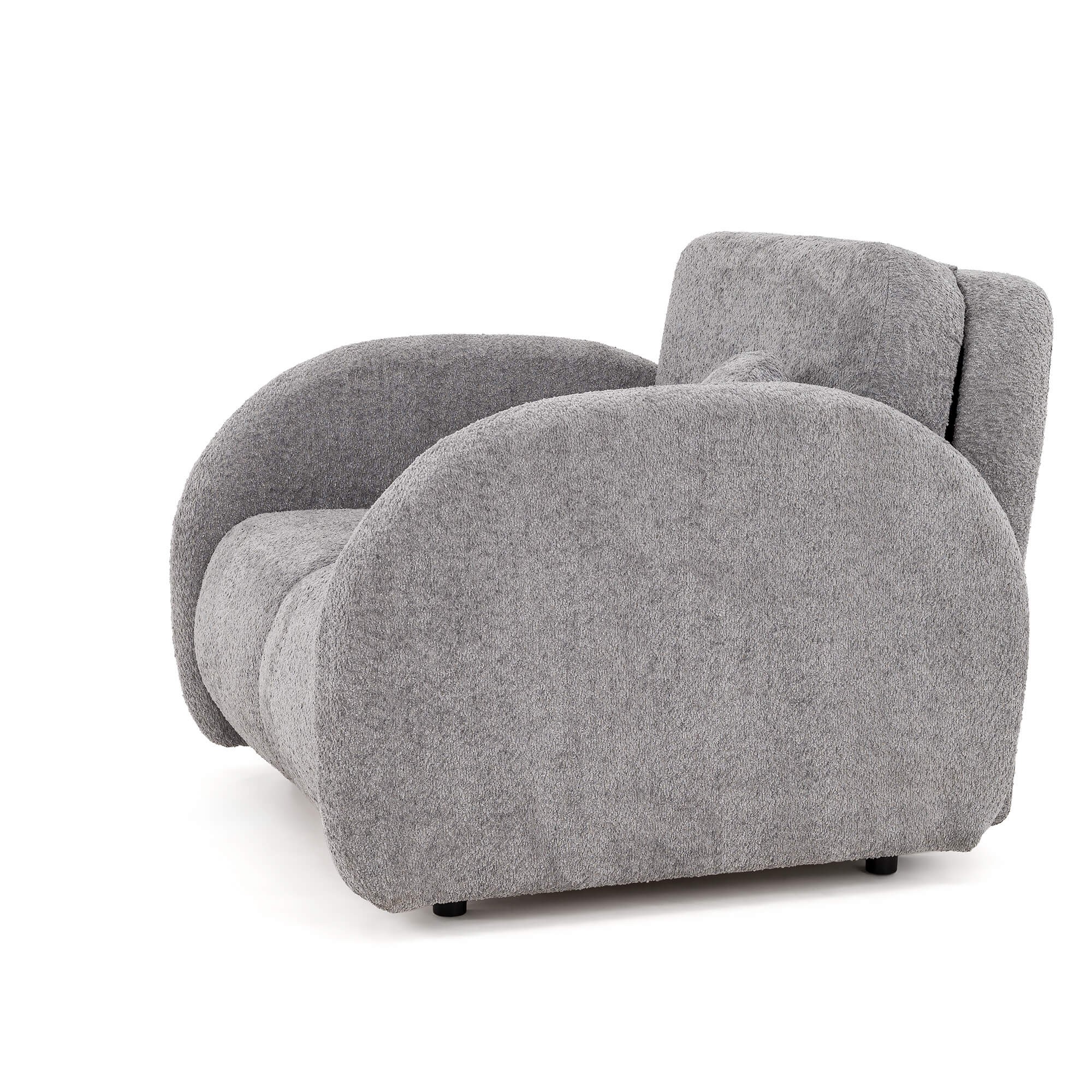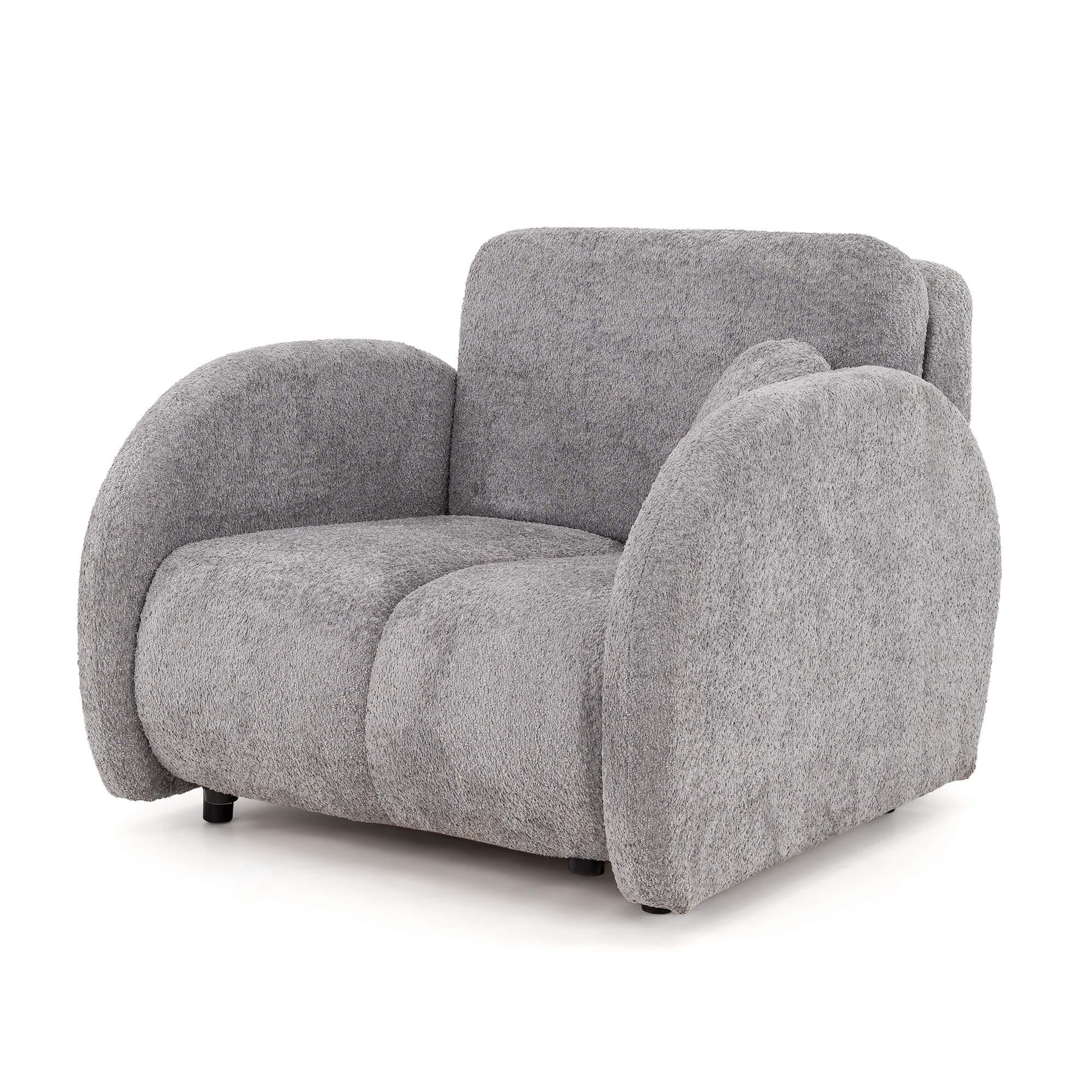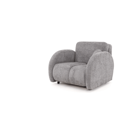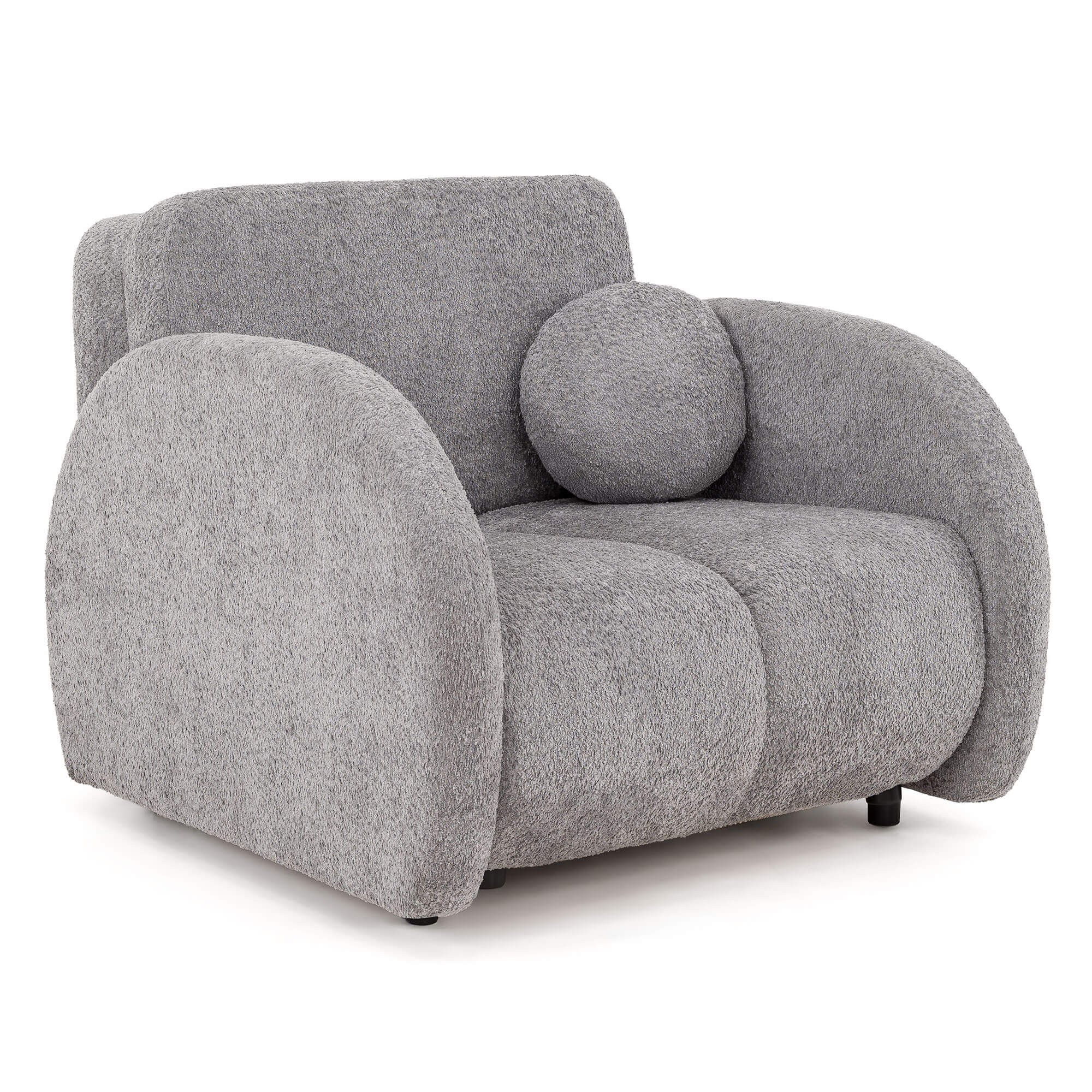 Kluczowym elementem modelu PUFI jest zastosowanie tkaniny typu bouclé, zwanej potocznie „barankiem”. Jej miękka, pętelkowa struktura sprawia, że fotel jest niezwykle przyjemny w dotyku i wprowadza do wnętrza ciepłą, domową atmosferę. Organiczny kształt mebla, pozbawiony ostrych krawędzi, oraz dołączona do zestawu okrągła poduszka, wpisują się w najnowsze trendy wnętrzarskie oparte na obłościach i naturalnych formach.