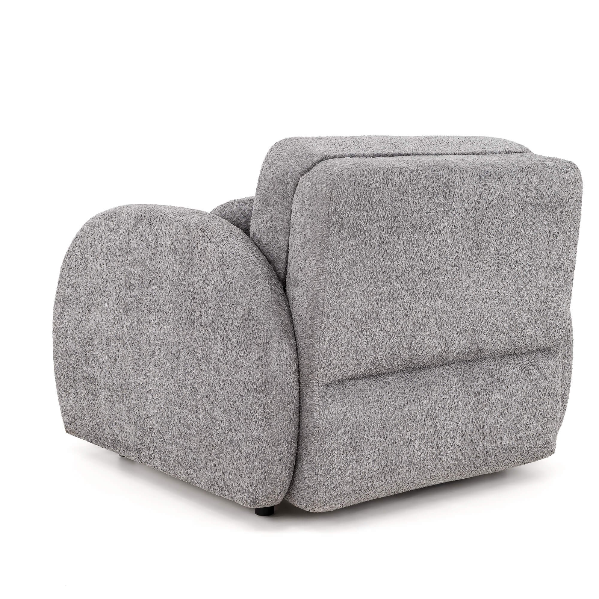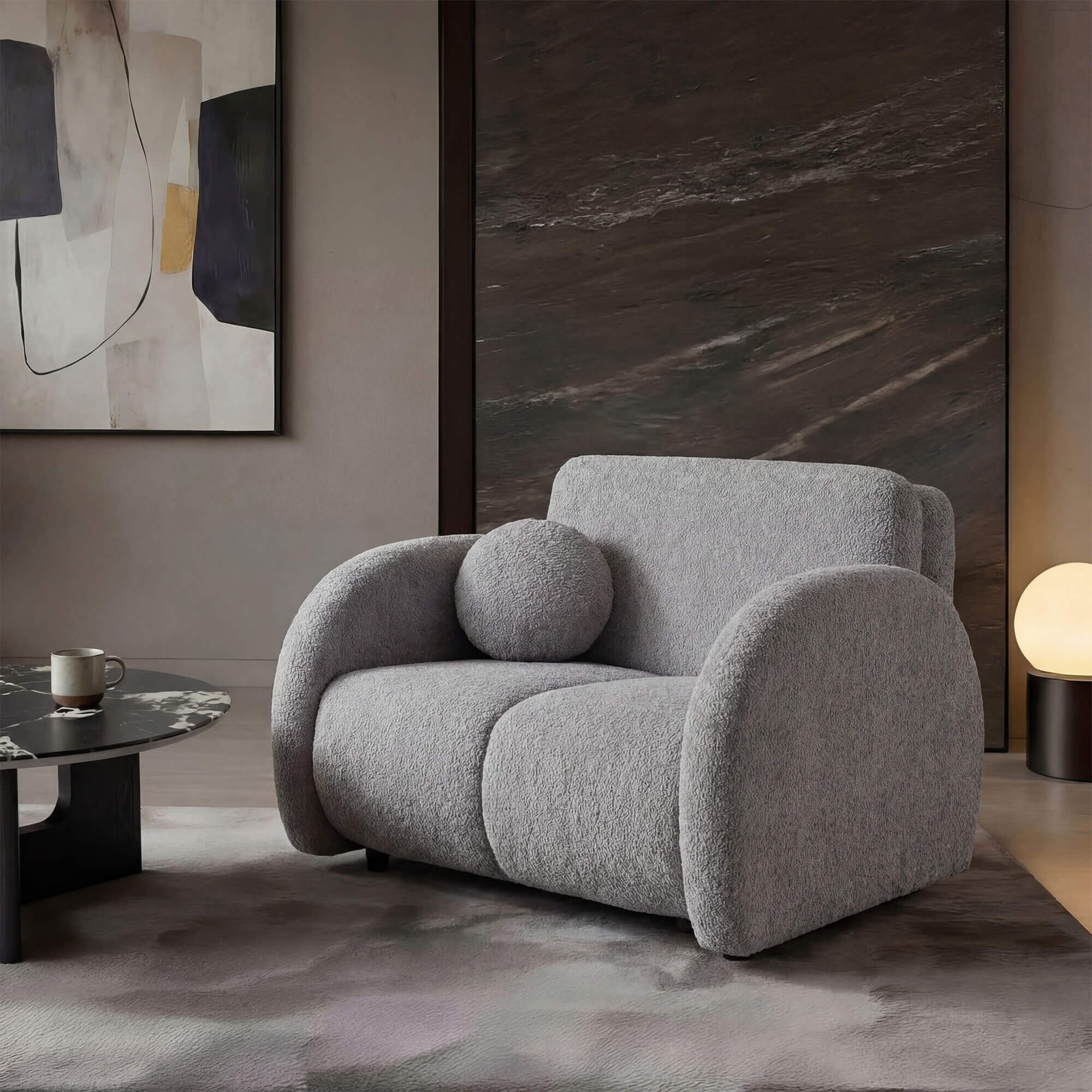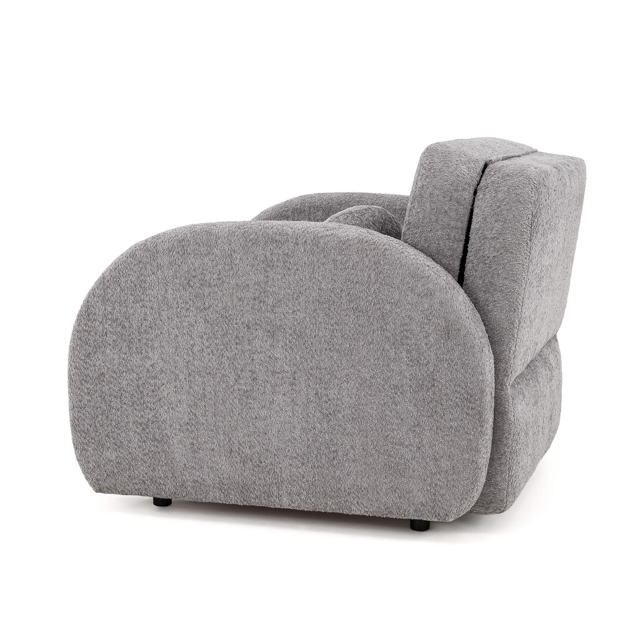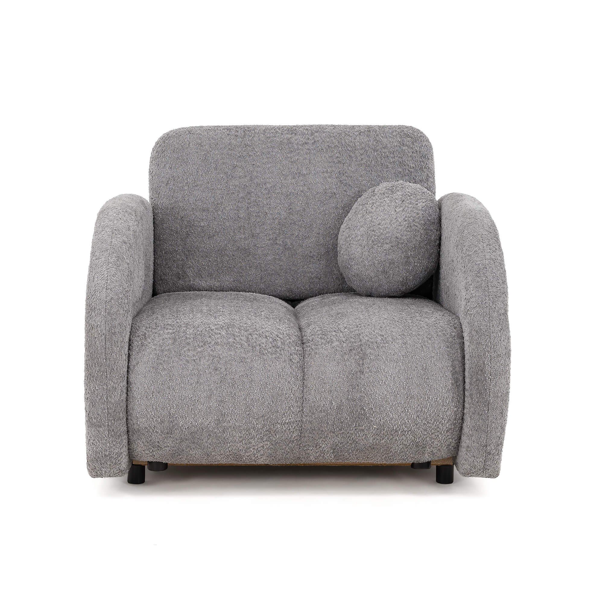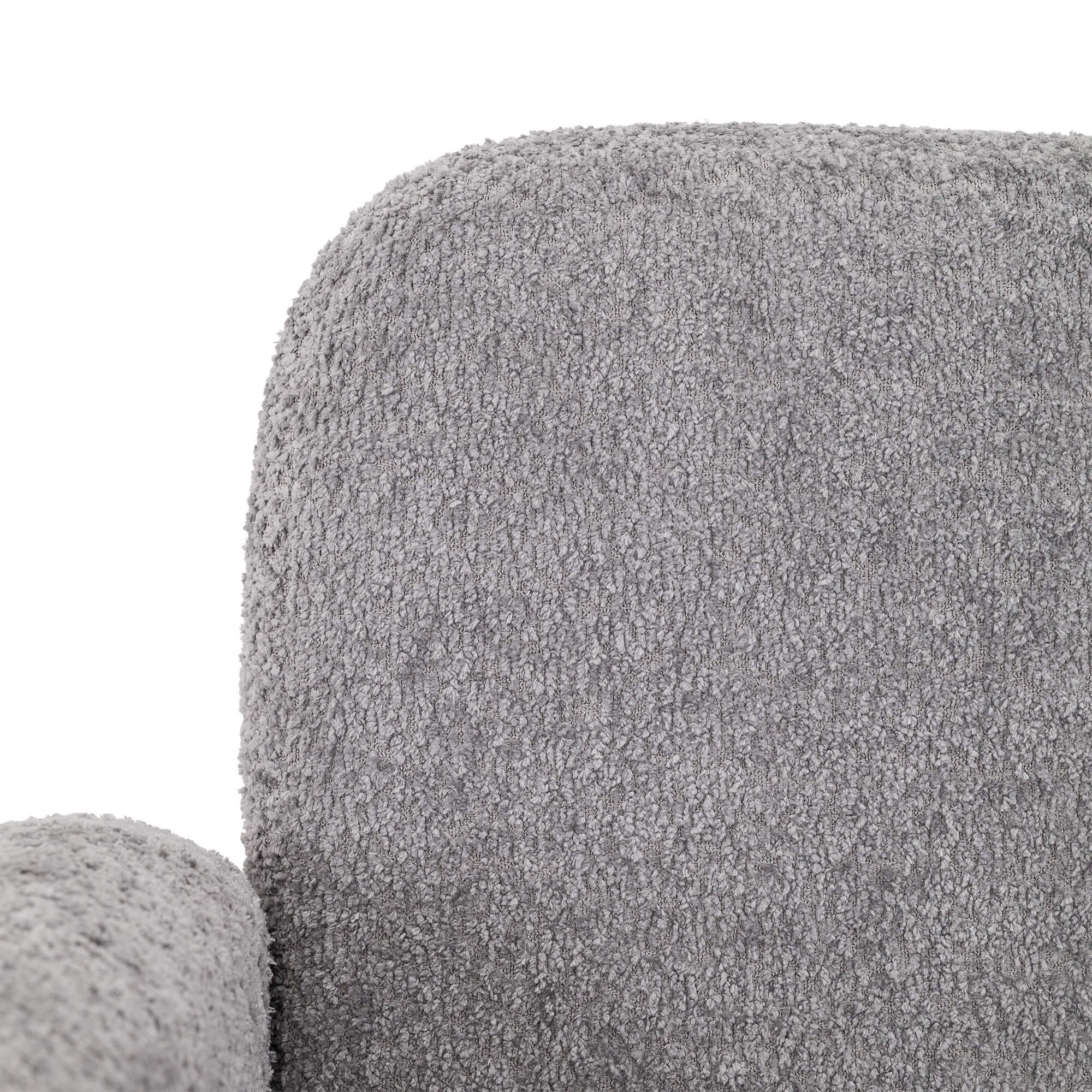 Kluczowym elementem modelu PUFI jest zastosowanie tkaniny typu bouclé, zwanej potocznie „barankiem”. Jej miękka, pętelkowa struktura sprawia, że fotel jest niezwykle przyjemny w dotyku i wprowadza do wnętrza ciepłą, domową atmosferę. Organiczny kształt mebla, pozbawiony ostrych krawędzi, oraz dołączona do zestawu okrągła poduszka, wpisują się w najnowsze trendy wnętrzarskie oparte na obłościach i naturalnych formach.