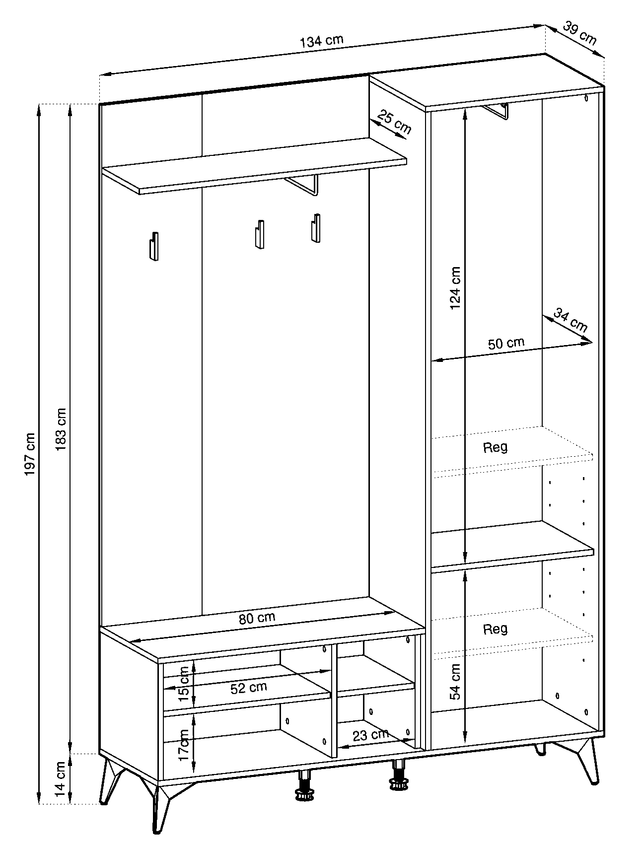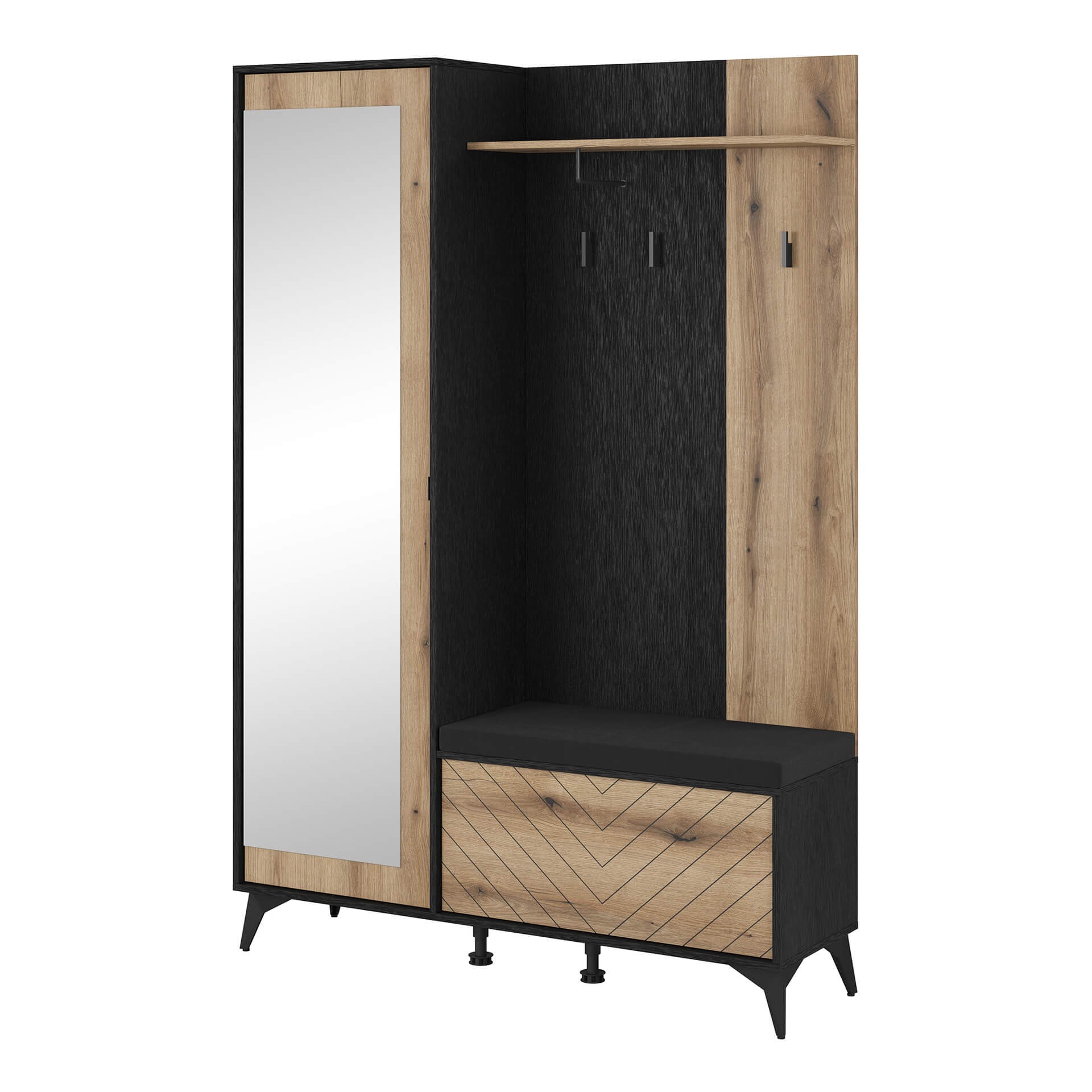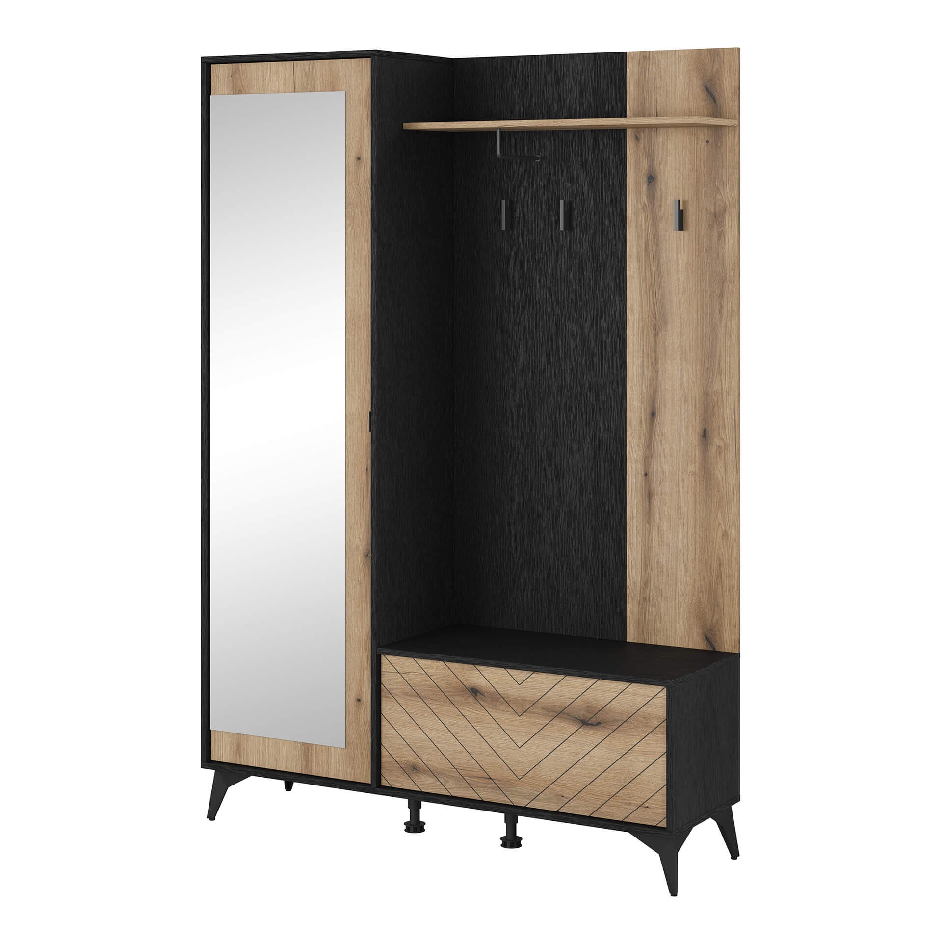 Niezwykle funkcjonalna garderoba to tak przydatny mebel w każdym przedpokoju! Nowoczesny fason sprawia, że mebel bez dwóch zdań odnajdzie się w każdej aranżacji, a połączenie najmodniejszych kolorów czarny i dąb evoke dodaje charakteru. Styl garderoby świetnie podkreśla także front w jodełkę oraz czarne wysokie nóżki.