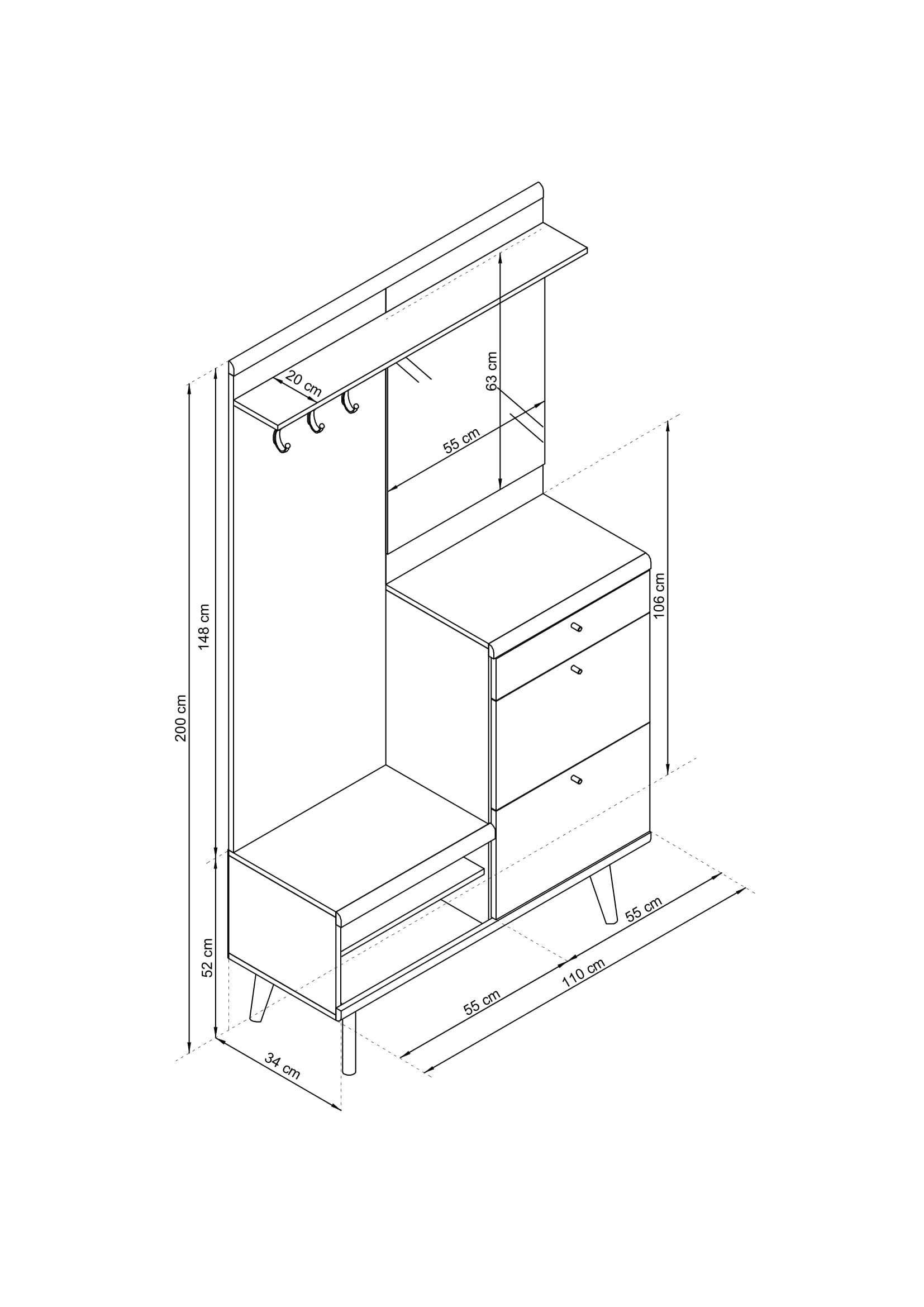 Garderoba w stylu skandynawskim wyposażona jest w wygodne uchwyty na odzież wierzchnią dla domowników i gości, szafkę na buty z dodatkowym blatem, który powoli wyeksponować dekoracje oraz półeczką, która świetnie zastąpi siedzisko. Garderoba posiada także półkę na okrycia głowy i torebki oraz praktyczne lustro, które pozwoli skontrolować swój wygląd przed wyjściem.