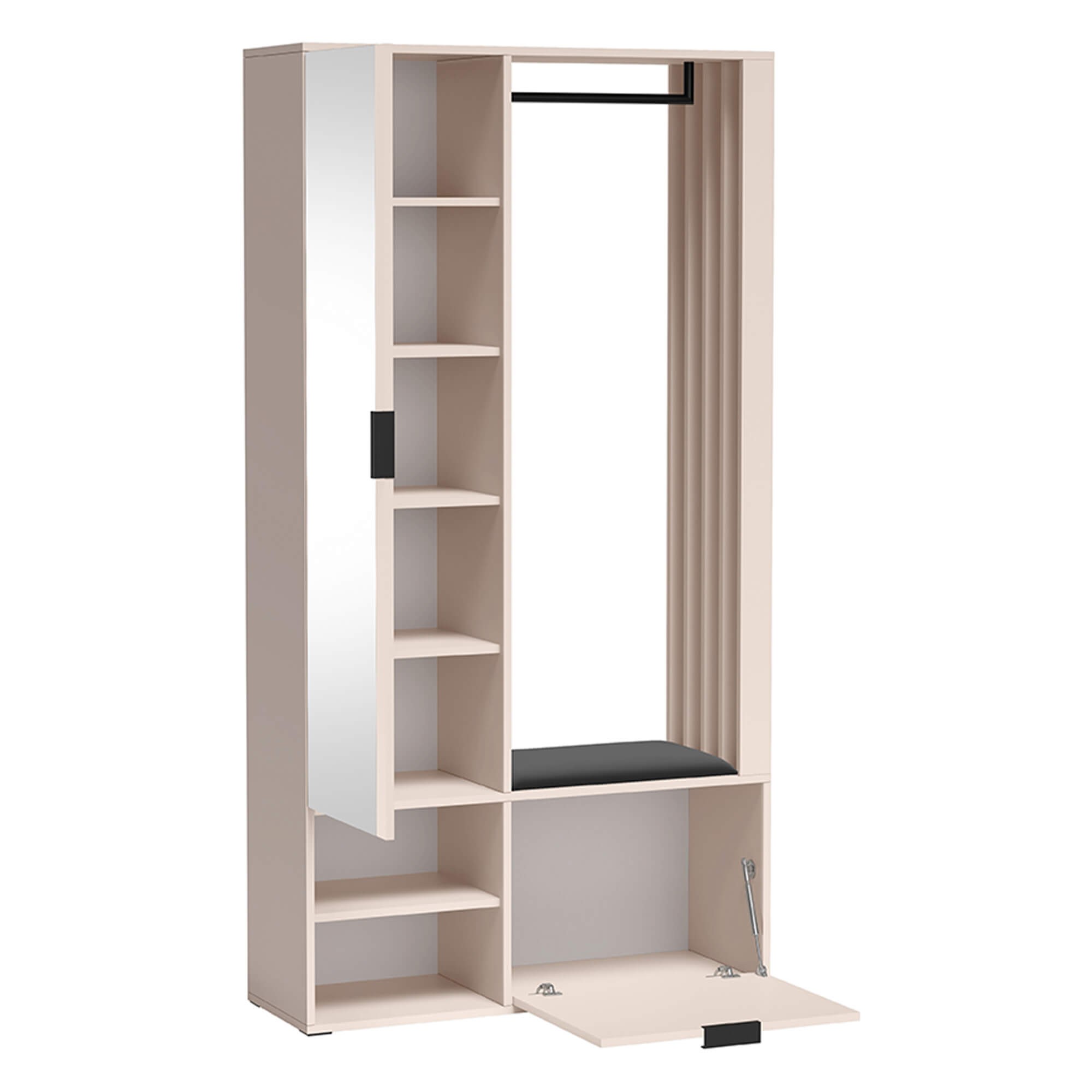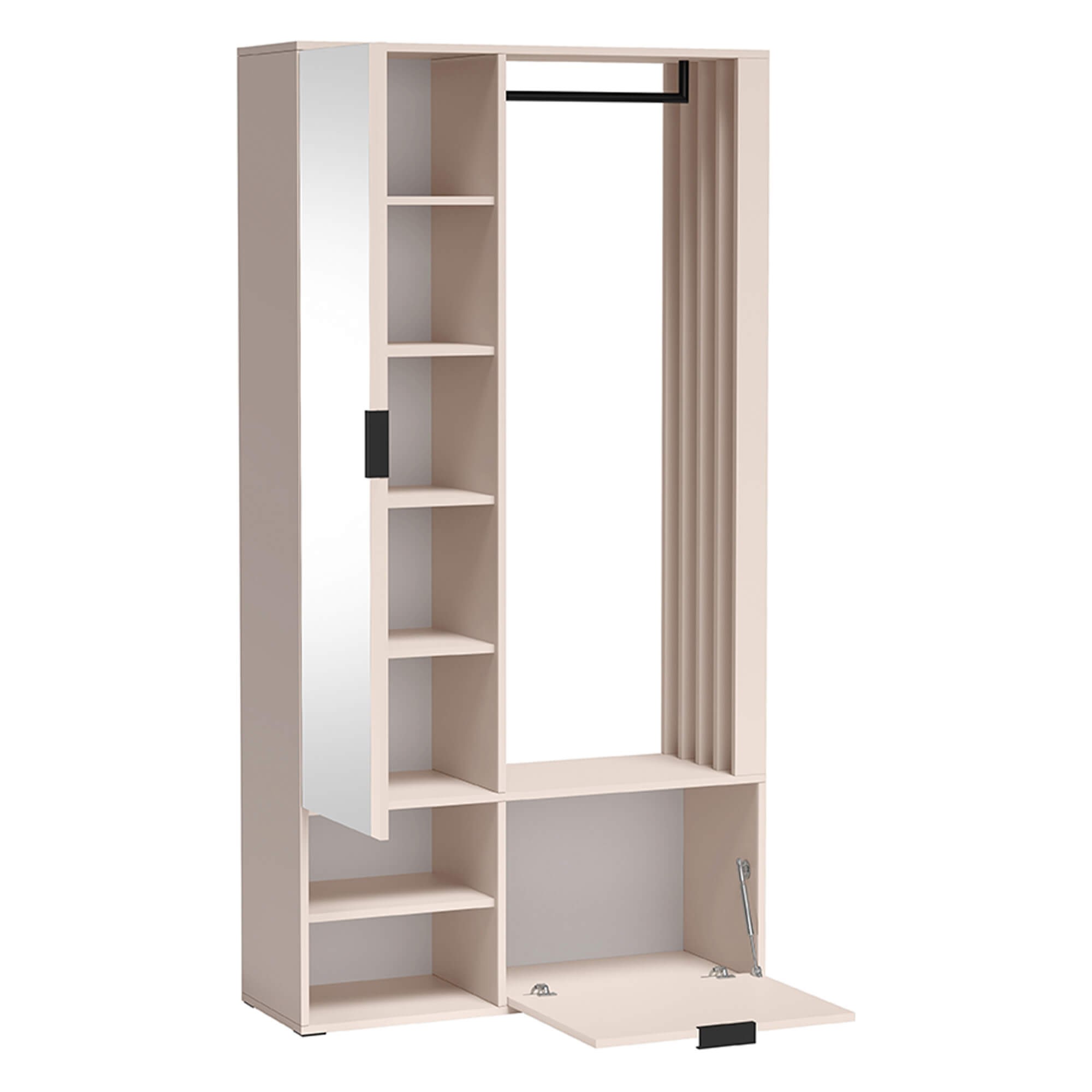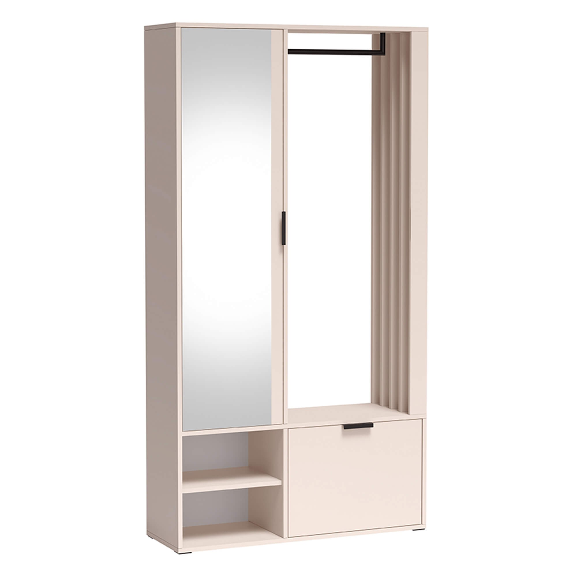 Garderoba z lustrem MILO UNI to mebel, który łączy w sobie najwyższą funkcjonalność z najnowszymi trendami wnętrzarskimi. Subtelny, niezwykle modny kolor kaszmiru nadaje pomieszczeniu przytulności i elegancji, sprawiając, że przedpokój staje się stylową wizytówką Twojego domu.