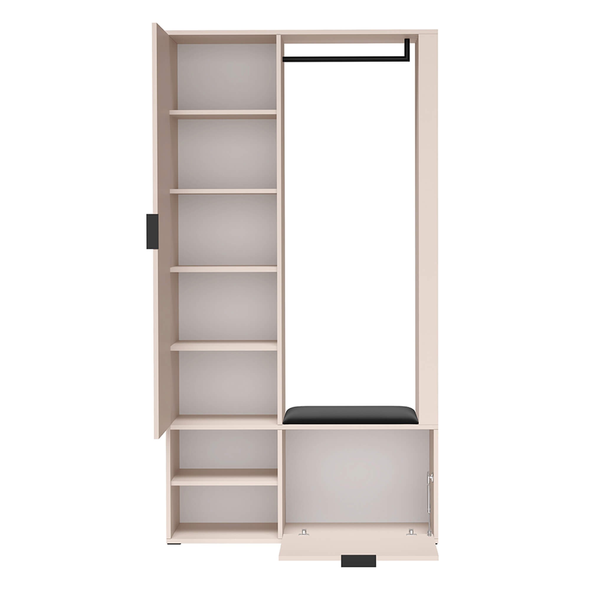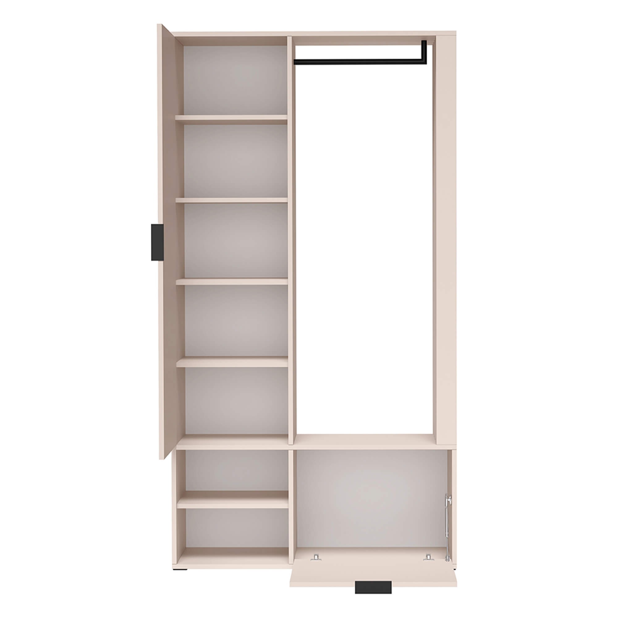Trwałość mebla gwarantują wysokiej jakości materiały: solidna płyta laminowana z obrzeżem PCV oraz metalowe komponenty. Czarne, metalowe uchwyty i wytrzymały wieszak nie tylko świetnie kontrastują z kolorem kaszmiru, ale zapewniają również niezawodność przez długie lata.