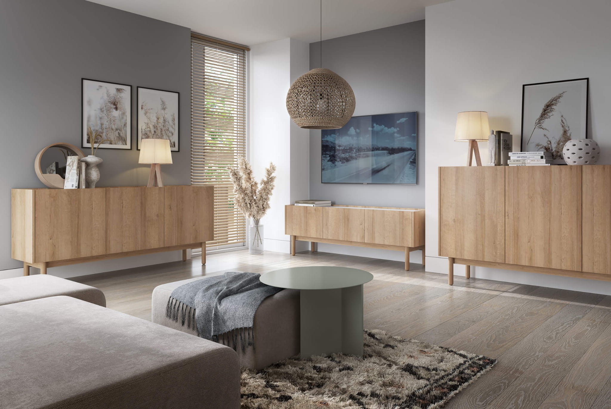 Komoda Boho posiada wysokie nóżki z litego drewna, co zapewnia jej stabilność i ułatwia sprzątanie pod nią. Jasny kolor szafki w połączeniu z wybarwieniem dąb riviera złoty tworzą spójną i elegancką całość.