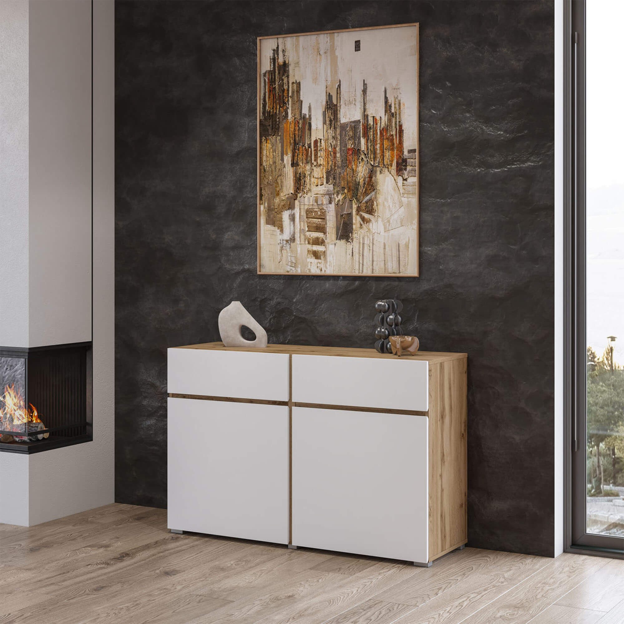 Komoda w nowoczesnym biały/wotan oak CROSS 119cm, 2 szafki i 2 szuflady