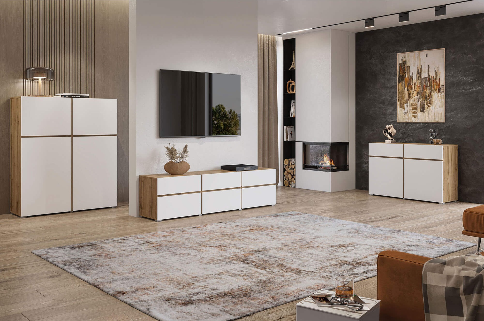 Kolekcja CROSS to połączenie ponadczasowego stylu, uniwersalności i praktycznych rozwiązań. Komoda w zestawieniu kolorystycznym biały/wotan oak zachwyca prostotą formy, subtelną elegancją oraz starannością wykonania, dzięki czemu z łatwością odnajdzie się zarówno w nowoczesnych, jak i klasycznych aranżacjach wnętrz. Jasna kolorystyka w połączeniu z naturalnym dekorem dębu wprowadza do pomieszczenia harmonię, świeżość i lekkość, tworząc przytulną atmosferę. To zestawienie sprawia, że mebel doskonale komponuje się z innymi barwami oraz dodatkami, podkreślając indywidualny charakter wnętrza. Komoda wykonana została z wysokiej jakości płyt laminowanych, co gwarantuje trwałość i odporność na codzienne użytkowanie przez wiele lat. Wyposażona w praktyczne szafki i pojemne szuflady, pozwala na wygodne przechowywanie wszystkich niezbędnych przedmiotów, dbając jednocześnie o porządek i estetykę. Blat można wykorzystać jako miejsce na dekoracje, rośliny, ramki ze zdjęciami czy książki, które dodatkowo ocieplą przestrzeń. Dzięki kompaktowym wymiarom komoda świetnie sprawdzi się zarówno w przestronnym salonie, jak i w mniejszym pokoju dziennym, gabinecie czy sypialni. To propozycja dla osób, które cenią funkcjonalność, wygodę oraz ponadczasowy design.