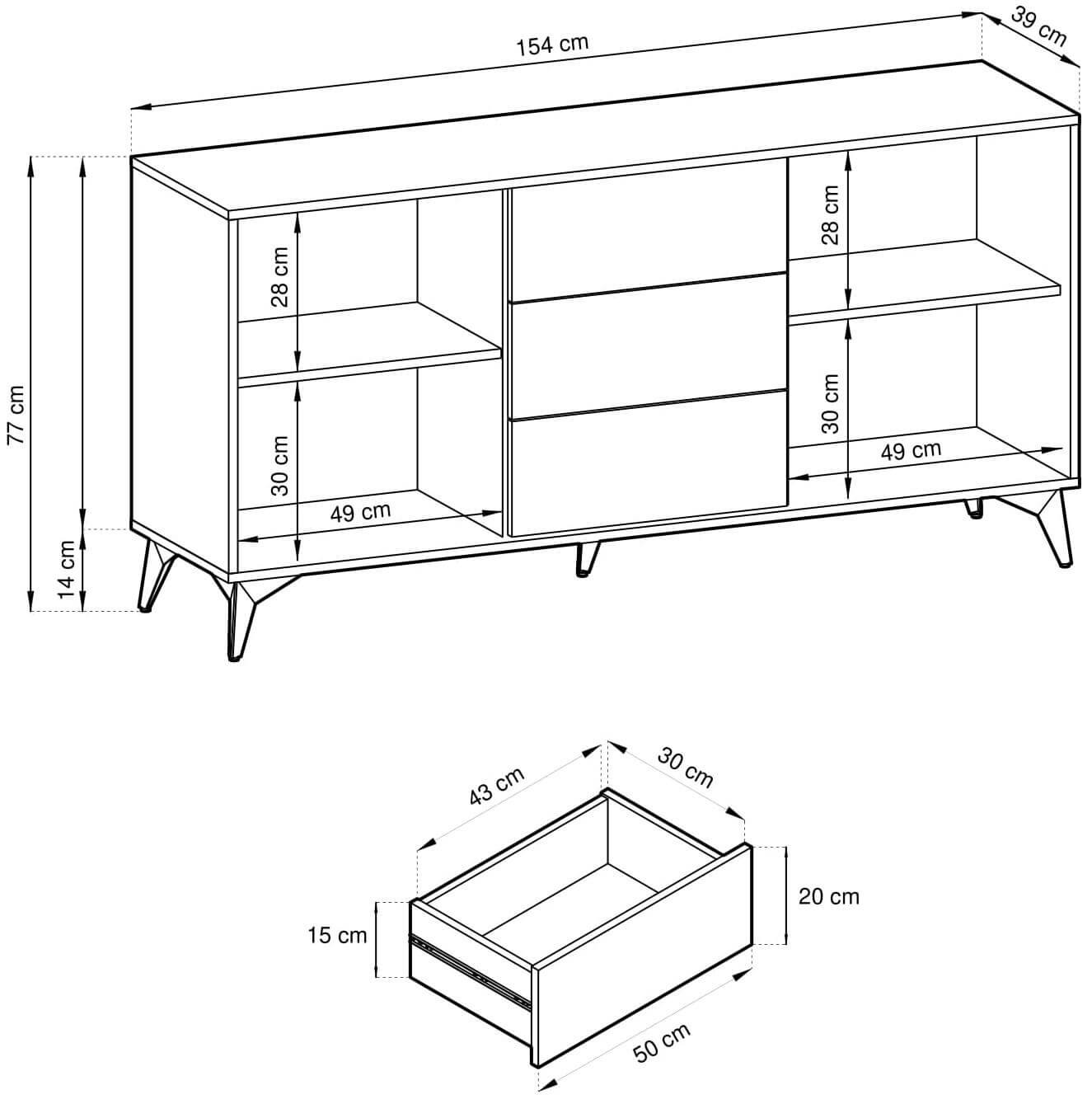 Stylowa komoda loftowa z szufladami to mebel, który zapewnia wiele opcji przechowywania dzięki wielu praktycznym szufladom i pakownym półkom. W każdej z nich można schować najpotrzebniejsze rzeczy, uporządkować dokumenty bądź ubrania. Gładki, przepiękny blat daje możliwość do wyeksponowania rzeczy kładąc na nim różne dekoracje i dodatki jak np. wazon z kwiatami, ramki ze zdjęciami czy też lampkę. Komoda loftowa z szufladami charakteryzuje się neutralną i bardzo charakterną kolorystyką, a tym samym szerokimi możliwościami aranżacyjnymi. Dąb evoke i klasyczna czerń to duet bardzo modny i ponadczasowy. Mebel wsparty jest także na czarnych, stabilnych nóżkach, dzięki czemu z łatwością będziesz mógł pod nim posprzątać czy przestawić w inne miejsce.