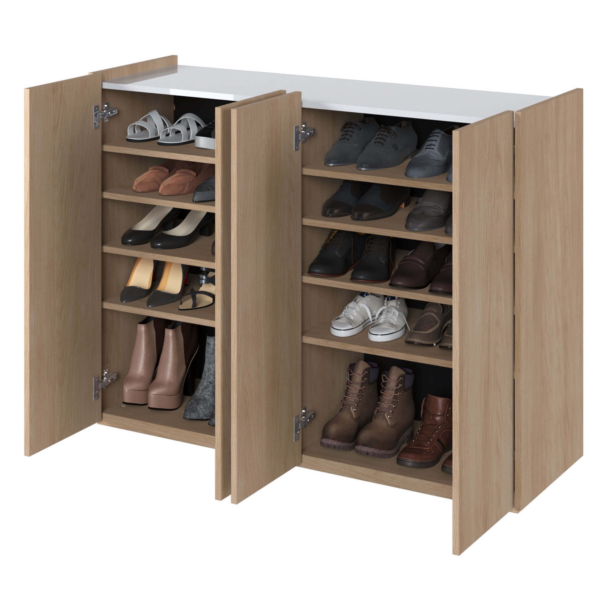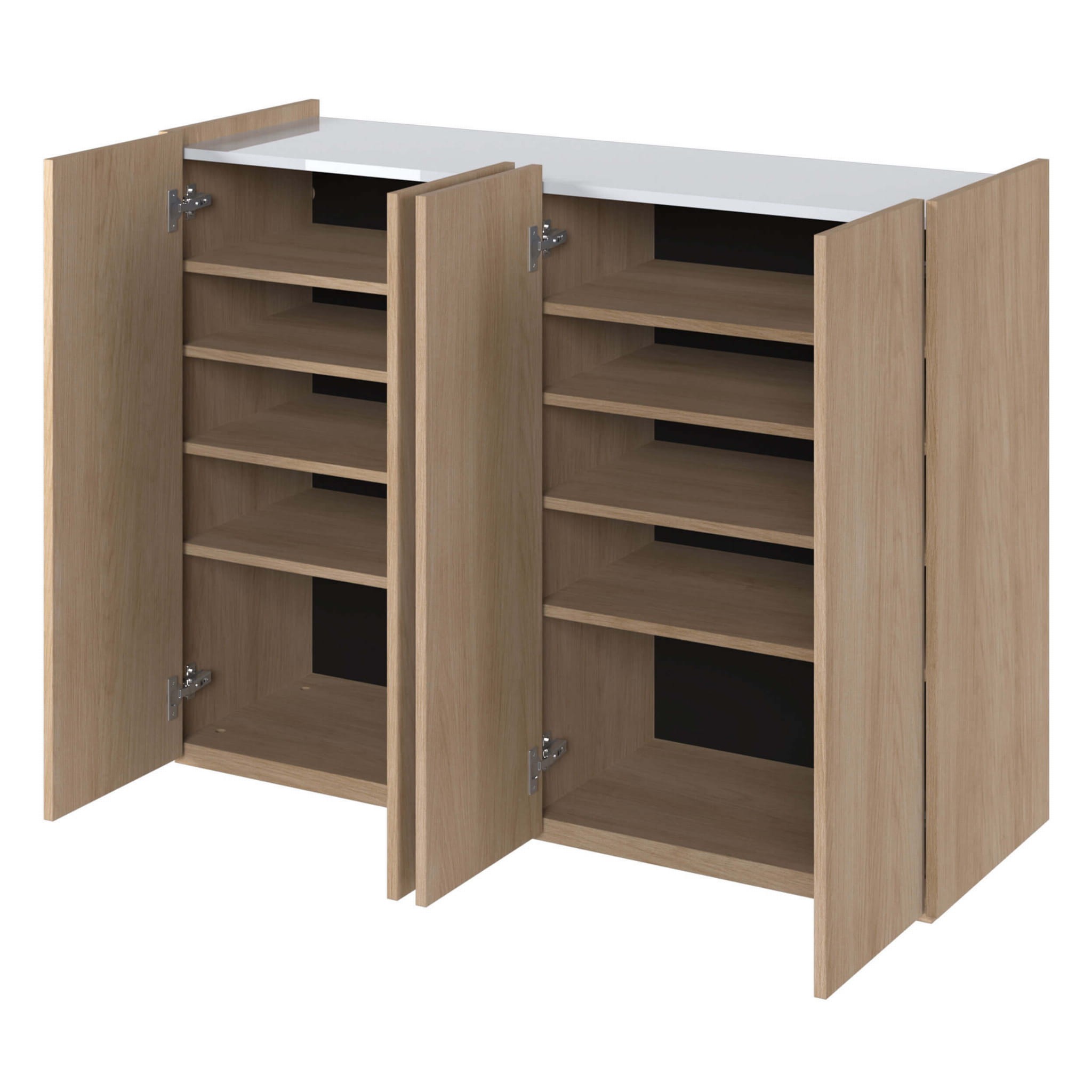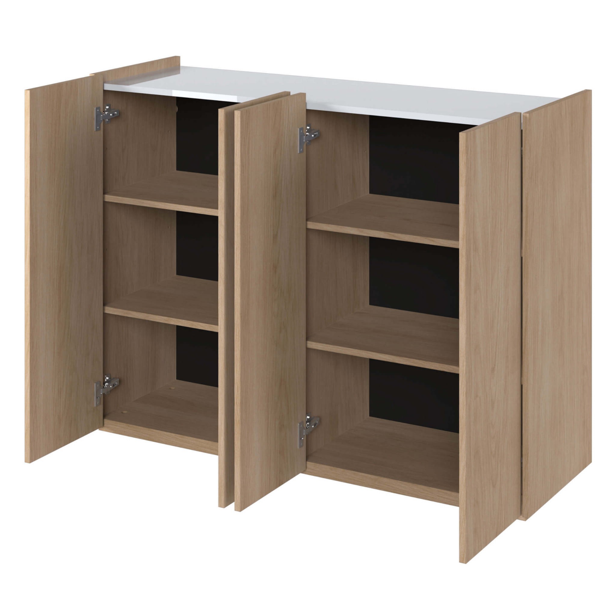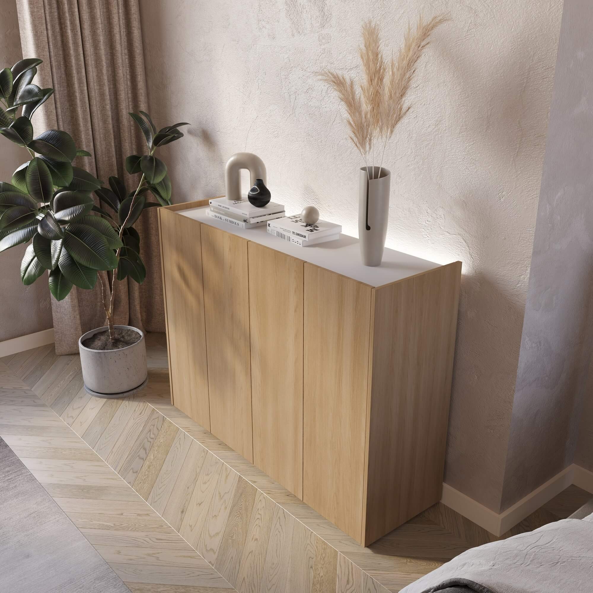 Komoda EA-02 jest niezwykle funkcjonalna, oferując mnóstwo miejsca do przechowywania. Wyposażona w cztery drzwi oraz sześć pojemnych półek, komoda EA-02 umożliwia przechowywanie różnych przedmiotów, takich jak klucze, rękawiczki, dokumenty, odzież czy akcesoria. Dzięki temu łatwiej jest utrzymać porządek w domu.