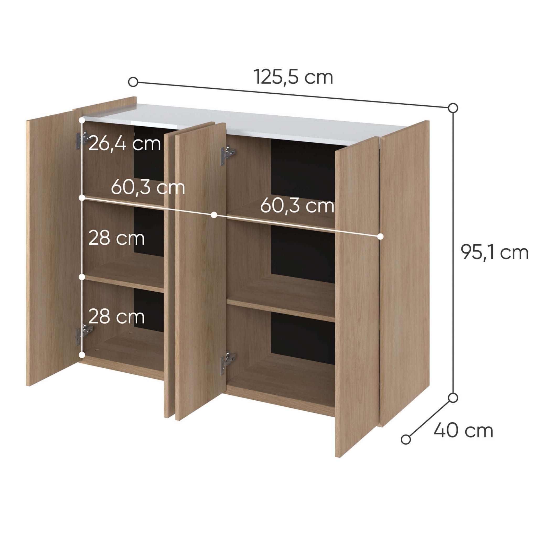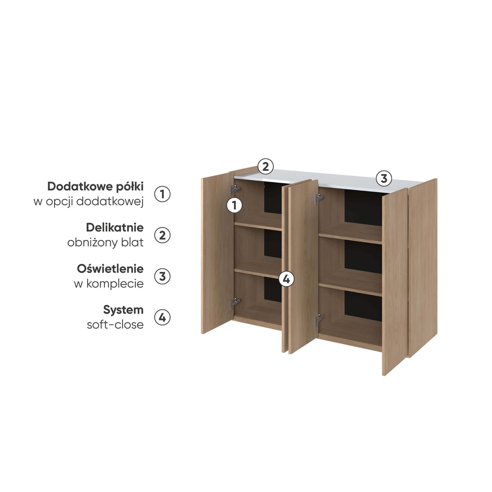 Komoda w kolorze dąb scandi to nie tylko elegancja, ale także praktyczność. Naturalny wygląd drewna dodaje wnętrzu ciepła i przytulności, stając się centralnym punktem każdej aranżacji. Biały połysk dodatkowo optycznie powiększa przestrzeń, wprowadzając do niej świeżość i lekkość. Dzięki temu komoda EA-02 pasuje do niemal każdego rodzaju wnętrza, od nowoczesnych po bardziej klasyczne.