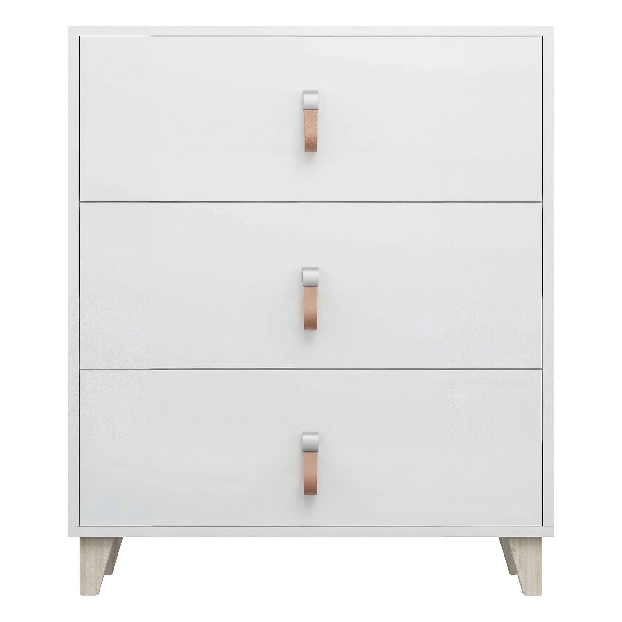 Komoda Figo łączy nowoczesny skandynawski styl z funkcjonalnością i wygodą codziennego użytkowania. Wyposażona w trzy obszerne szuflady, umożliwia uporządkowanie i organizację przestrzeni w pokoju dziecka. Skórzane uchwyty, choć dyskretne, dodają meblowi ciepła i naturalnego charakteru, podkreślając jego wyjątkowy wygląd.