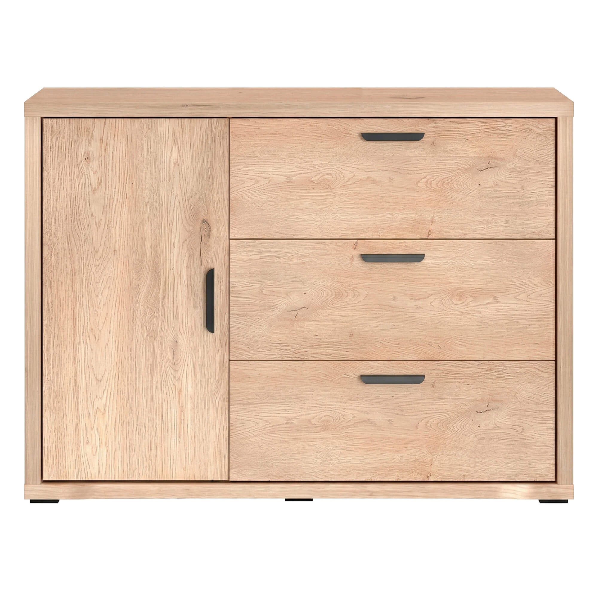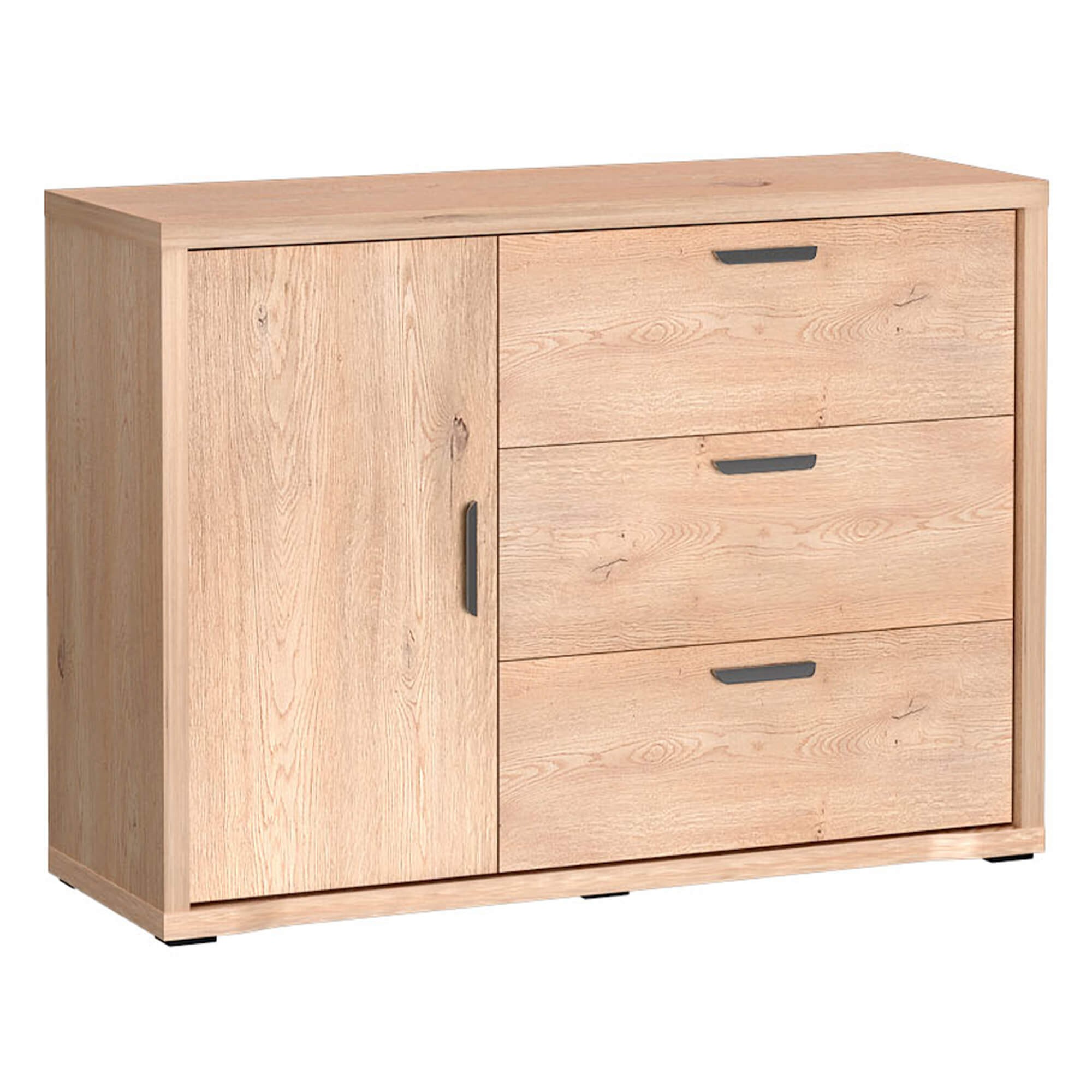 - Praktyczny układ: pojemna szafka z półką oraz trzy szerokie szuflady