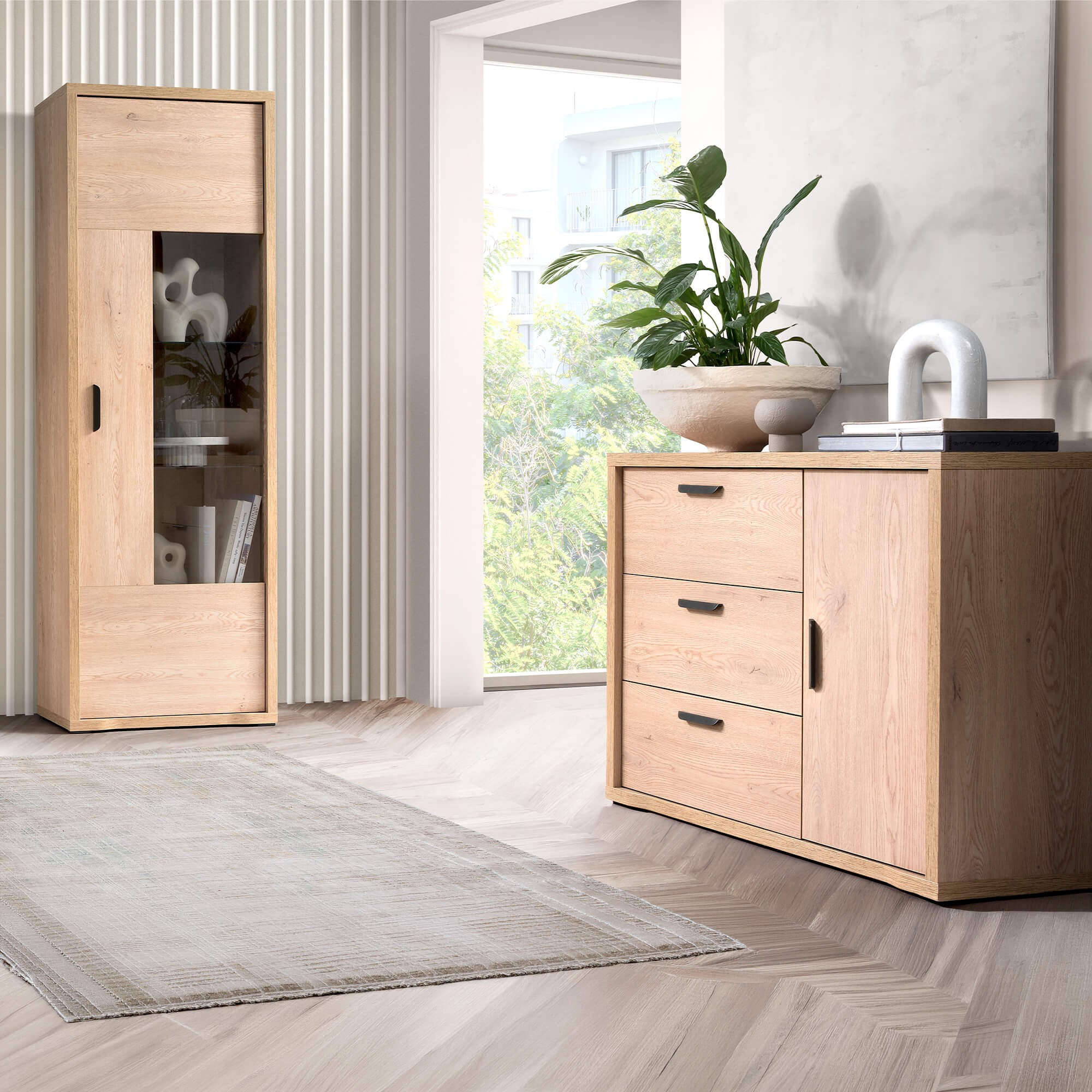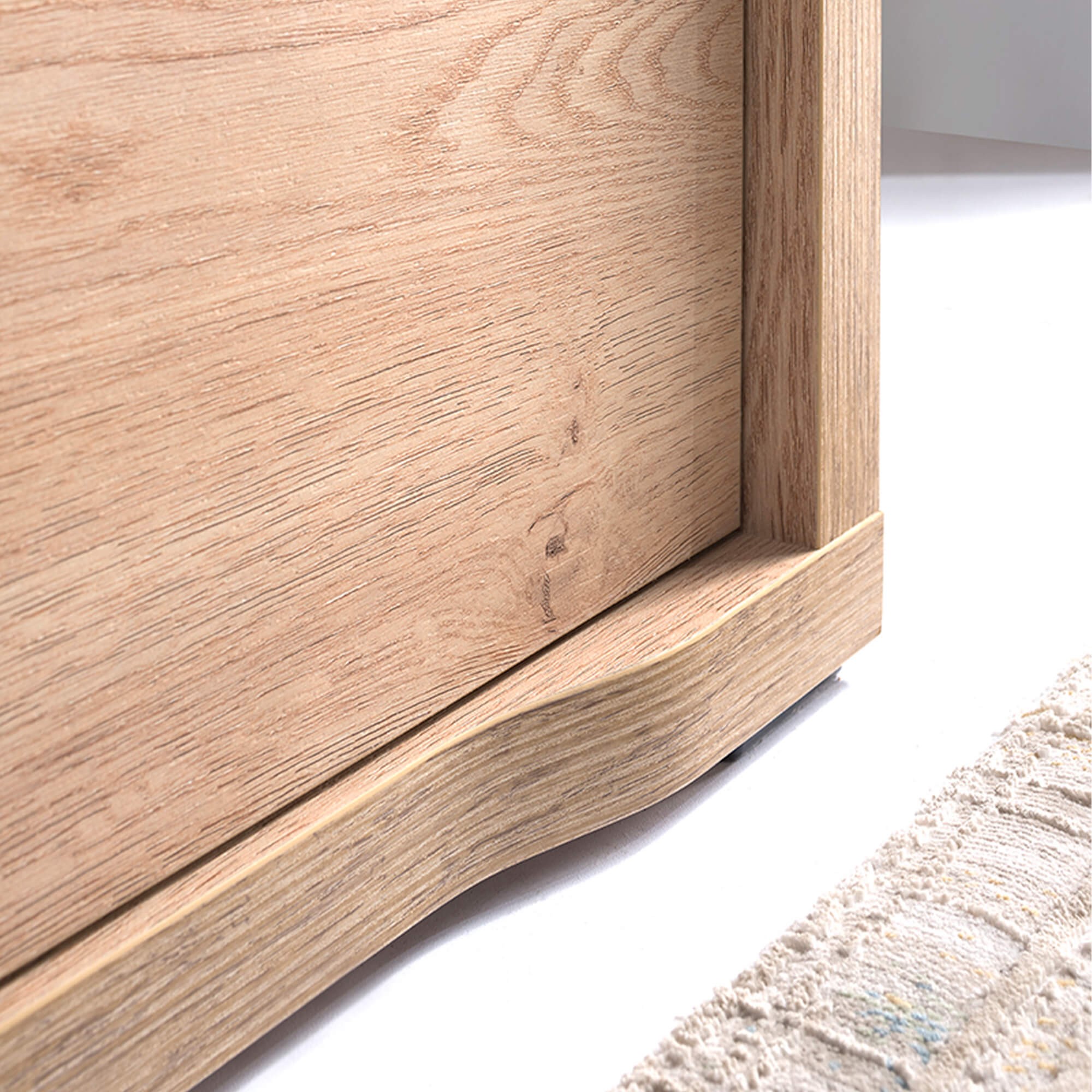 Solidność konstrukcji gwarantuje korpus z płyty o grubości 32 mm, a zaokrąglone krawędzie wykończone obrzeżem ABS dodają bryle subtelności i zapewniają bezpieczeństwo. Całość dopełniają subtelne, metalowe uchwyty, które stanowią elegancki akcent, nie odciągając uwagi od piękna struktury drewna. Komoda GRANDE – 1 to niezastąpiony element wnętrza na lata.