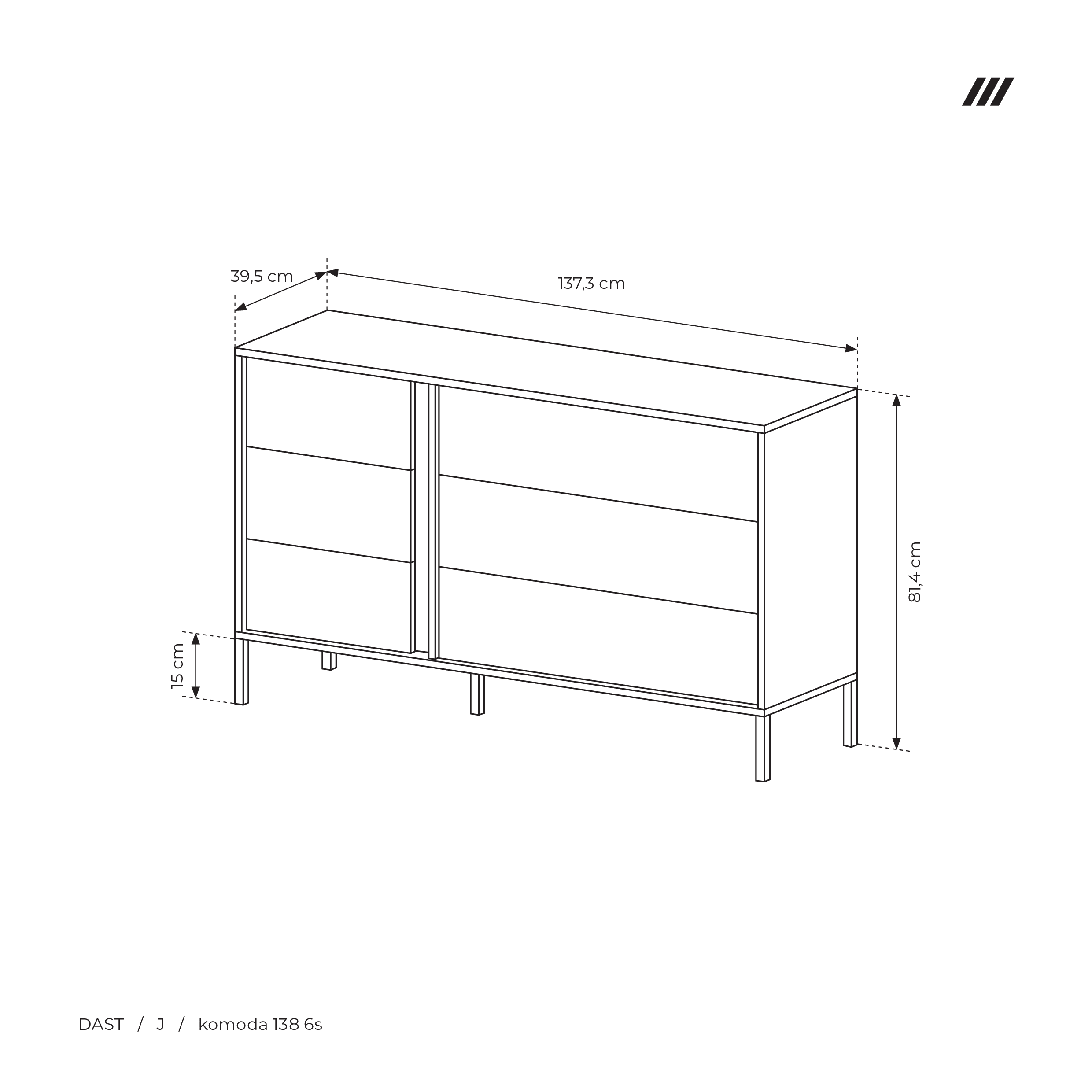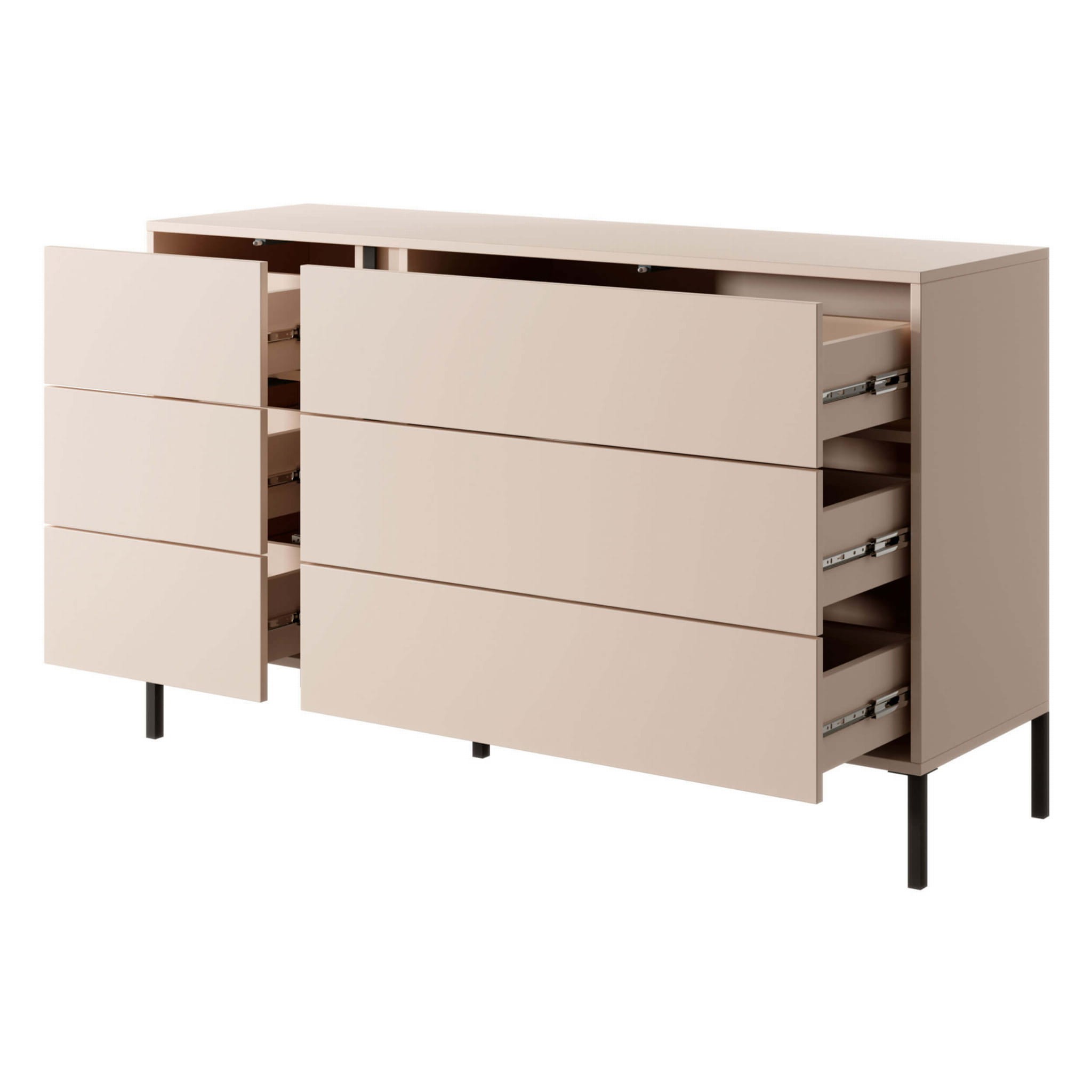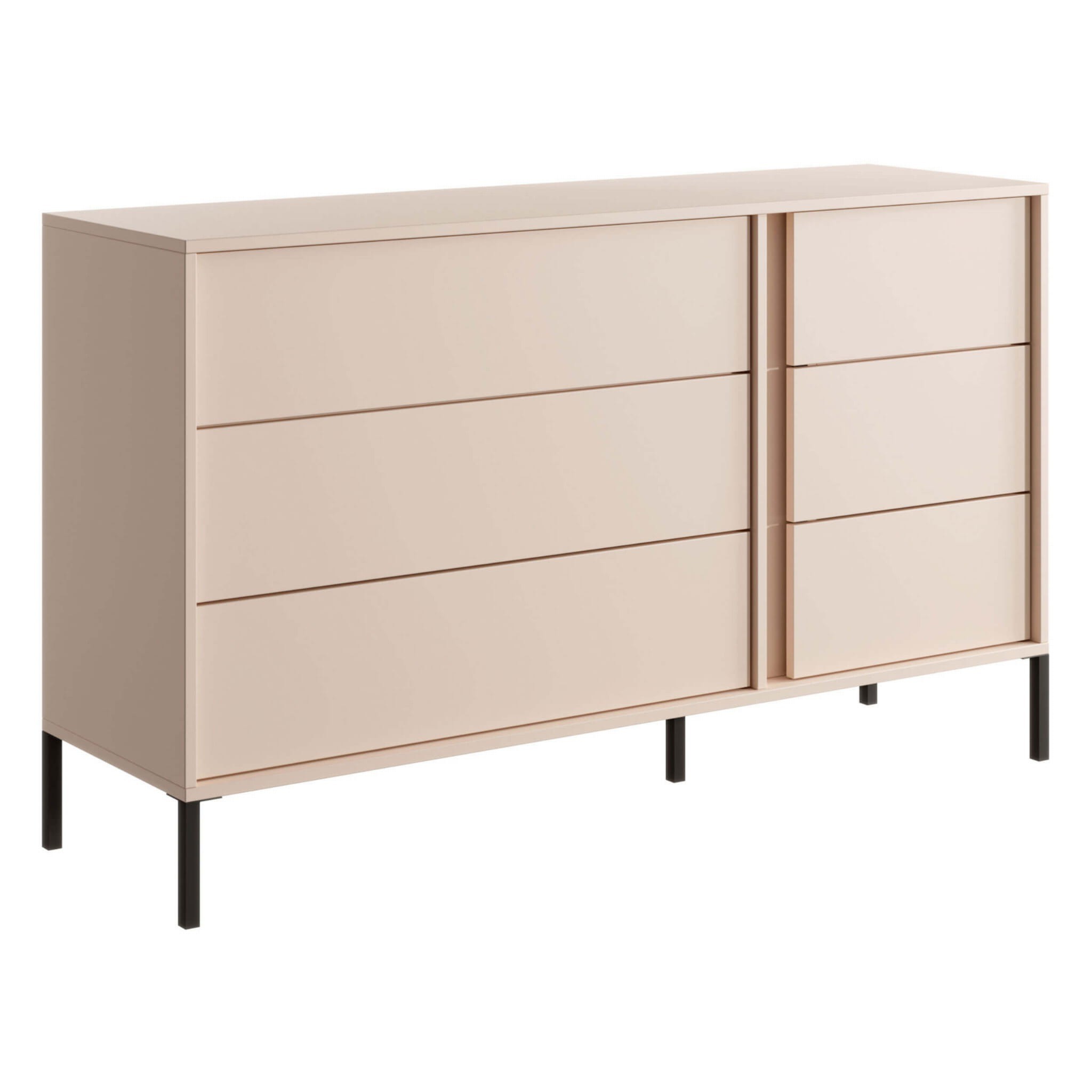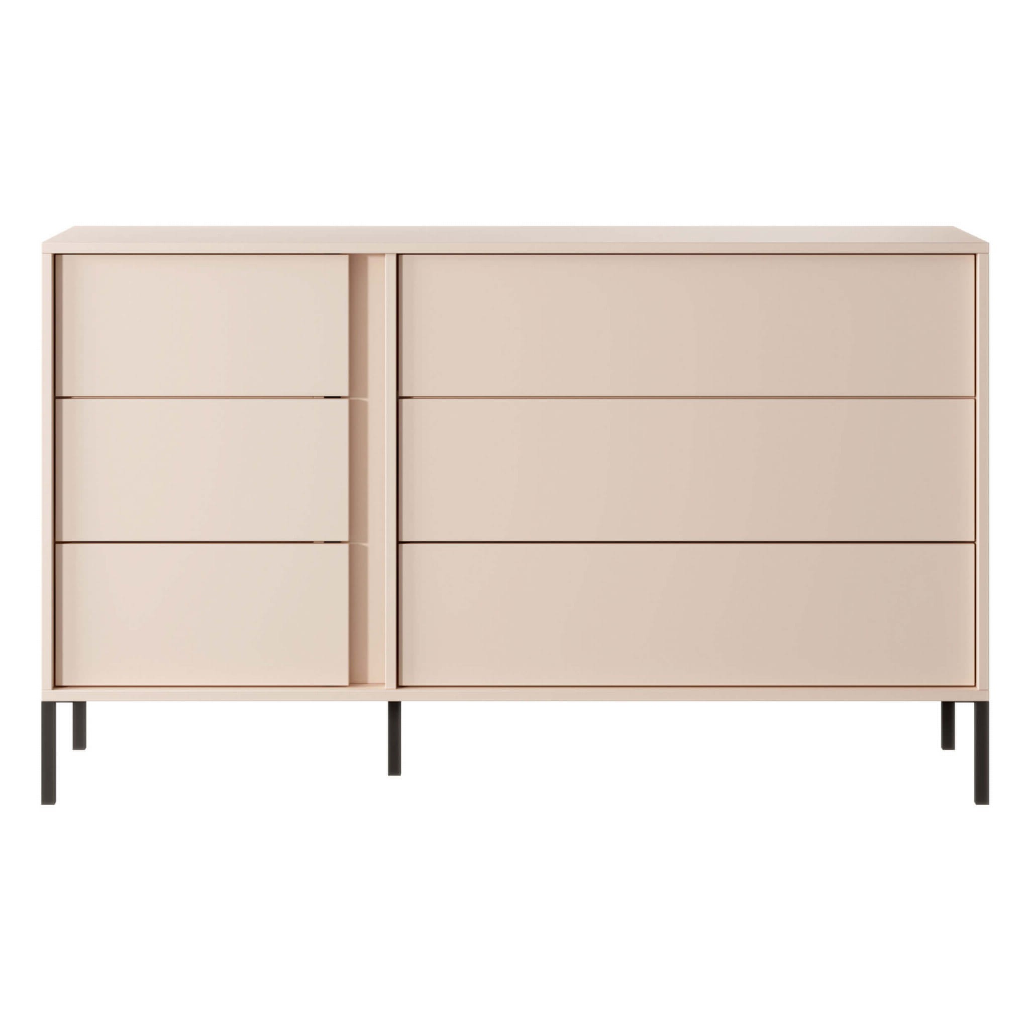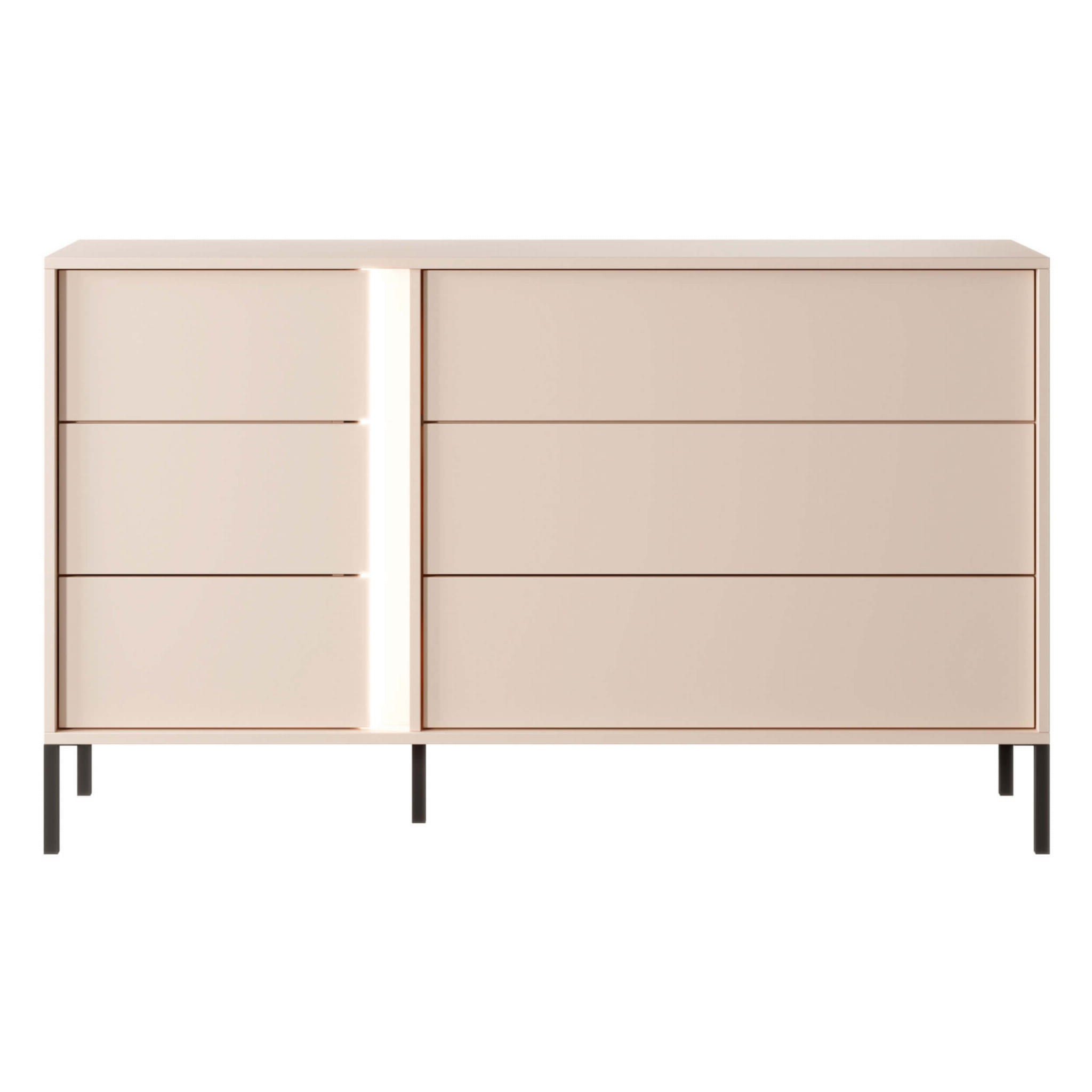 Prześliczna, funkcjonalna komoda beżowa z kolekcji DAST. Gładka struktura, wykonanie z płyt laminowanych i obrzeży ABS sprawia, że nie ma sobie równych. Jest niezwykle trwała i stabilna, a brak uchwytów i smukłe czarne nóżki podkreślają minimalistyczny i lekki wygląd mebla. Otwieranie szuflad odbywa się za pomocą funkcjo push to open, która zapobiega hałasowaniu czy uszkodzeniom. W opcjach dostępne jest również oświetlenie LED, które ułatwi korzystanie z komody i doda blasku sypialni.