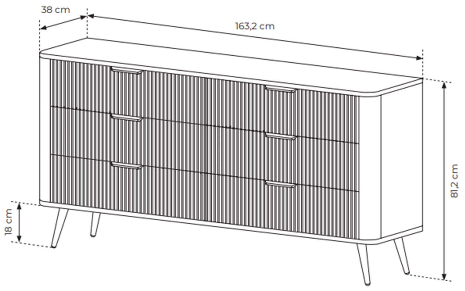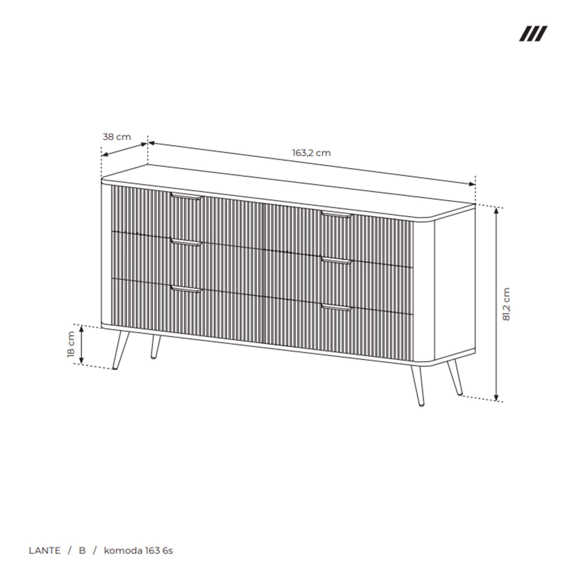 Komoda 163 6S Lante w głębokim odcieniu czerni to kwintesencja nowoczesnego designu i funkcjonalności, która doda elegancji każdemu salonowi czy sypialni. Fronty z frezowanego MDF-u pokryte matowym lakierem w kolorze czarnym tworzą subtelną, pionową fakturę, podkreślającą minimalistyczny charakter mebla, a korpus z najwyższej jakości płyty laminowanej gwarantuje odporność na zarysowania i wilgoć, dzięki czemu komoda zachowuje nienaganny wygląd mimo intensywnego użytkowania. Sześć pojemnych szuflad osadzonych na metalowych prowadnicach z pełnym wysuwem umożliwia wygodny dostęp do przechowywanych przedmiotów, zaś wpuszczane uchwyty w matowej czerni idealnie komponują się z frontami, nie zakłócając harmonii bryły. Smukłe, stożkowe nóżki podnoszą konstrukcję o 18 cm, wprowadzając lekkość i subtelną przestrzeń pod meblem, a zaokrąglone krawędzie dodają bezpieczeństwa i nowoczesnego wyrazu. Dzięki stabilnej, wzmocnionej konstrukcji oraz łatwemu montażowi Komoda 163 6S Lante to produkt nowy, fabrycznie zapakowany i objęty dwuletnią gwarancją, który spełni oczekiwania najbardziej wymagających miłośników stylowych wnętrz.