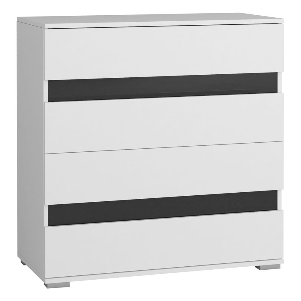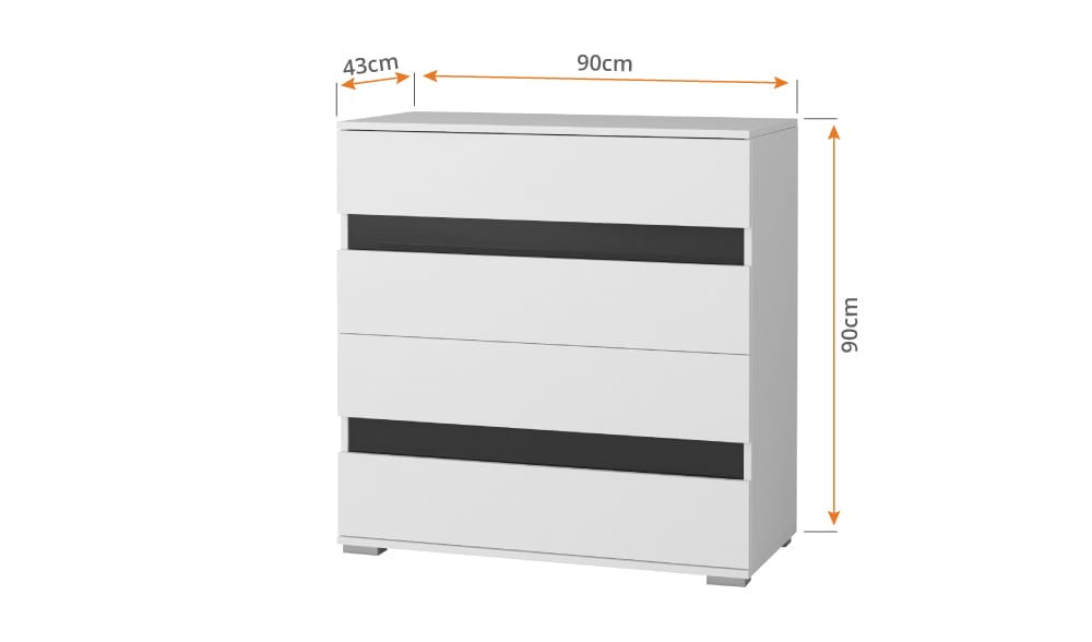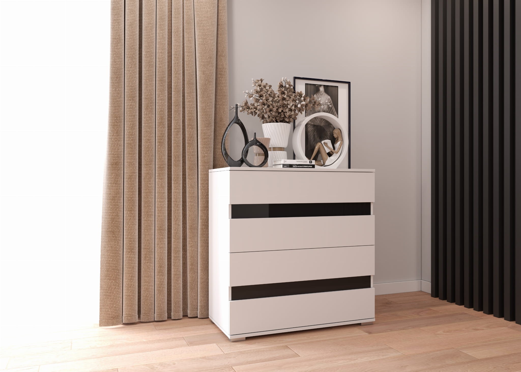 Komoda Lucca, ozdobiona modnymi wstawkami z lakierowanej płyty, to efektowny mebel o nowoczesnym i stylowym wyglądzie, idealnie wpisującym się w aktualne trendy. Wyposażona w cztery pojemne szuflady, komoda łączy czarny półpołysk z białym matem, co nadaje jej elegancki i wyrafinowany charakter.