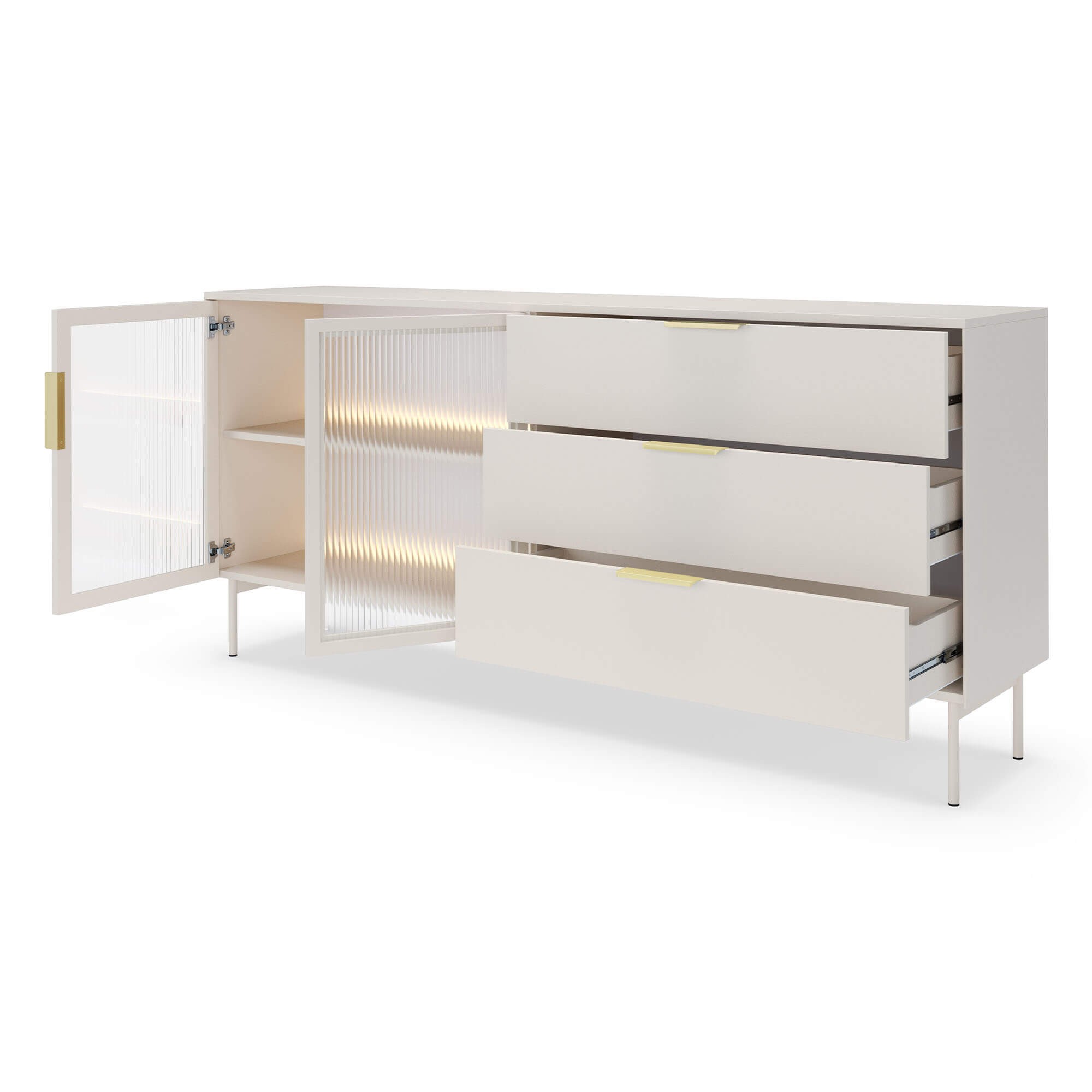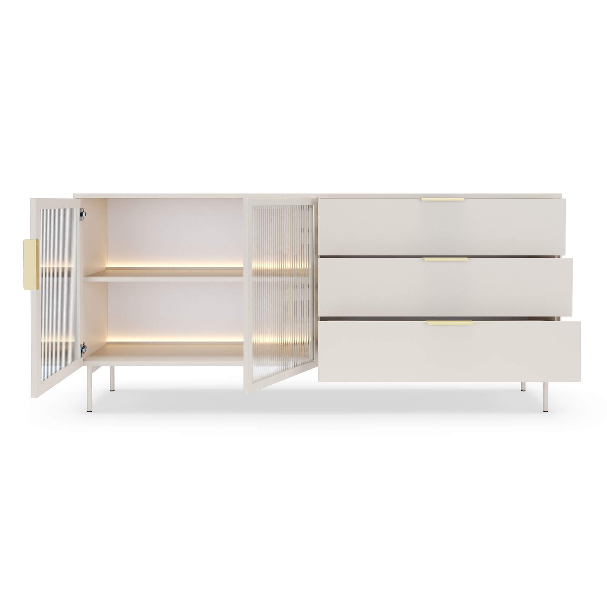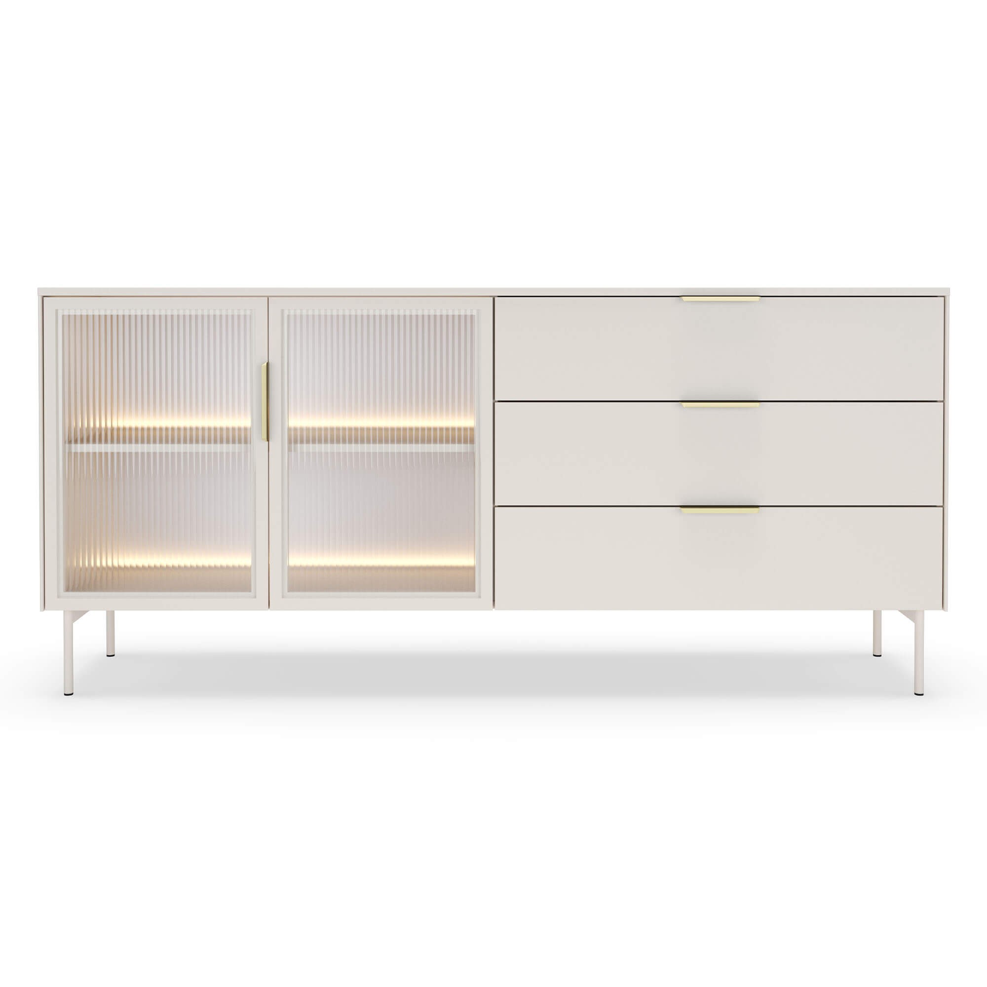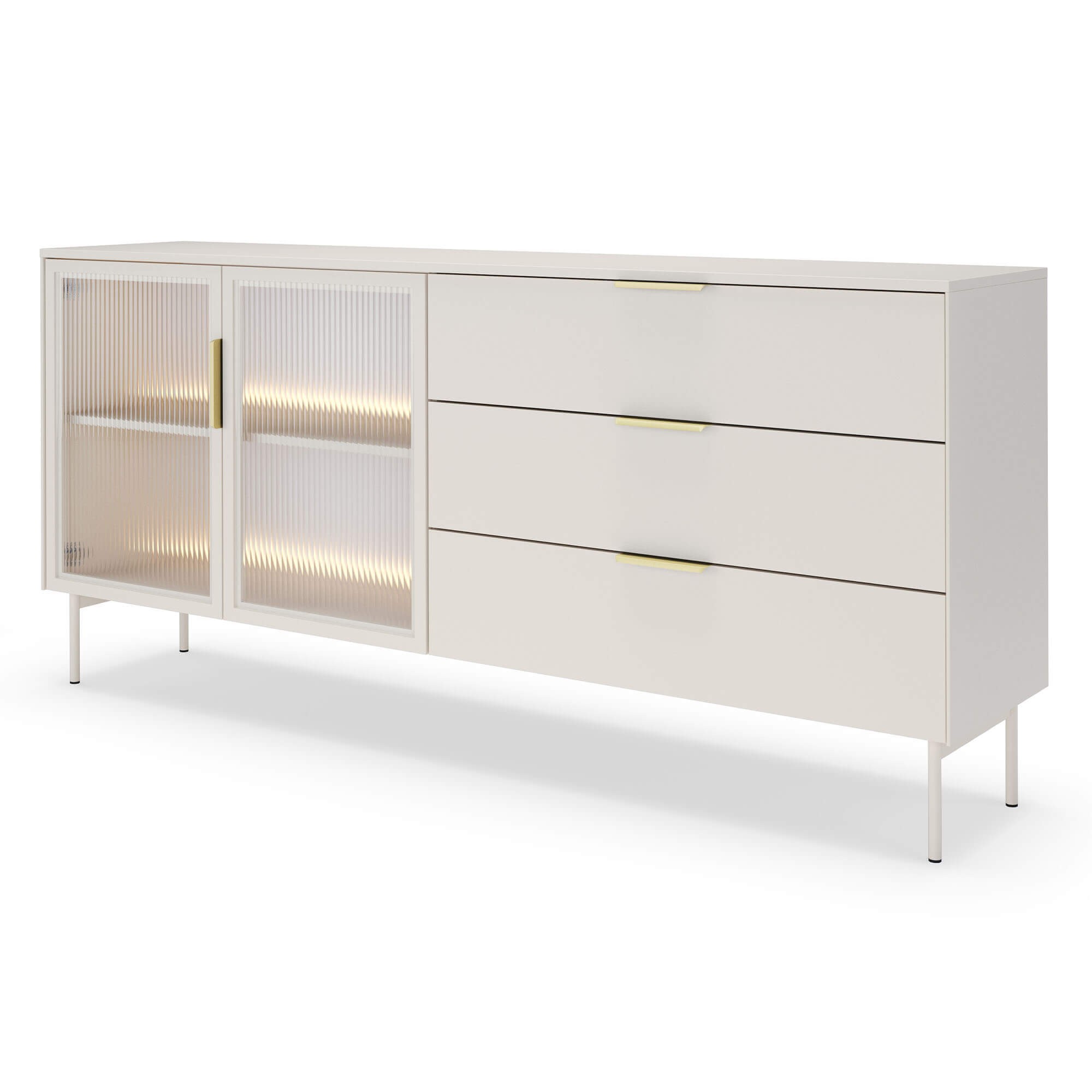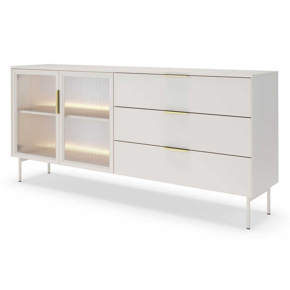 Komoda LUMI 181 2D3S z oświetleniem LED w kolorze kaszmir to elegancki i funkcjonalny mebel, który wprowadzi do Twojego wnętrza wyjątkowy styl i przytulną atmosferę. Jej nowoczesny charakter podkreślają fronty wykonane ze szkła ryflowanego, które dodają całości lekkości i sprawiają, że mebel staje się subtelną ozdobą pomieszczenia. Delikatnie rozpraszające światło szkło pięknie współgra z wbudowanym oświetleniem LED, tworząc nastrojowy klimat i eksponując zawartość półek w wyjątkowy sposób. Stabilna konstrukcja komody została oparta na smukłych, metalowych nóżkach, dzięki czemu całość prezentuje się lekko i nowocześnie, a jednocześnie zachowuje pełną trwałość i wytrzymałość. Praktyczne połączenie trzech pojemnych szuflad oraz dwóch przestronnych szafek pozwala na wygodne przechowywanie zarówno codziennych drobiazgów, jak i większych przedmiotów, utrzymując w domu harmonię i porządek. Wygodne uchwyty w eleganckim wykończeniu ułatwiają korzystanie z mebla i podkreślają jego dopracowany design. Komoda LUMI doskonale łączy funkcję przechowywania i ekspozycji, dzięki czemu sprawdzi się zarówno w salonie, jadalni, jak i w nowoczesnym biurze. Starannie dopracowane krawędzie i detale nadają jej minimalistycznego charakteru, a uniwersalny design w kolorze kaszmir sprawia, że bez trudu wpisze się w aranżacje nowoczesne, skandynawskie czy eleganckie. To mebel, który nie tylko zachwyca wyglądem, ale również podnosi komfort codziennego użytkowania, stając się stylowym dopełnieniem Twojej przestrzeni.
