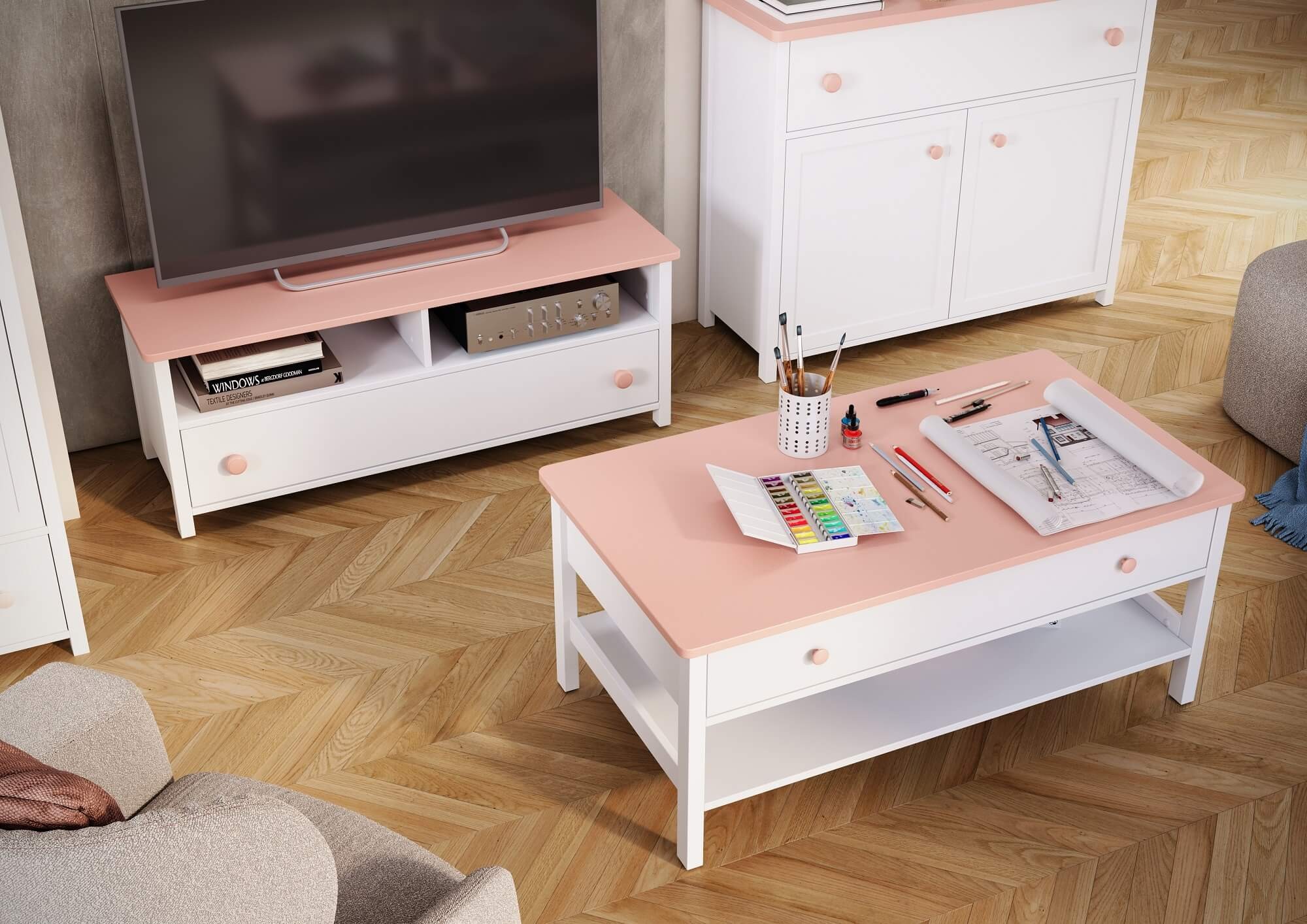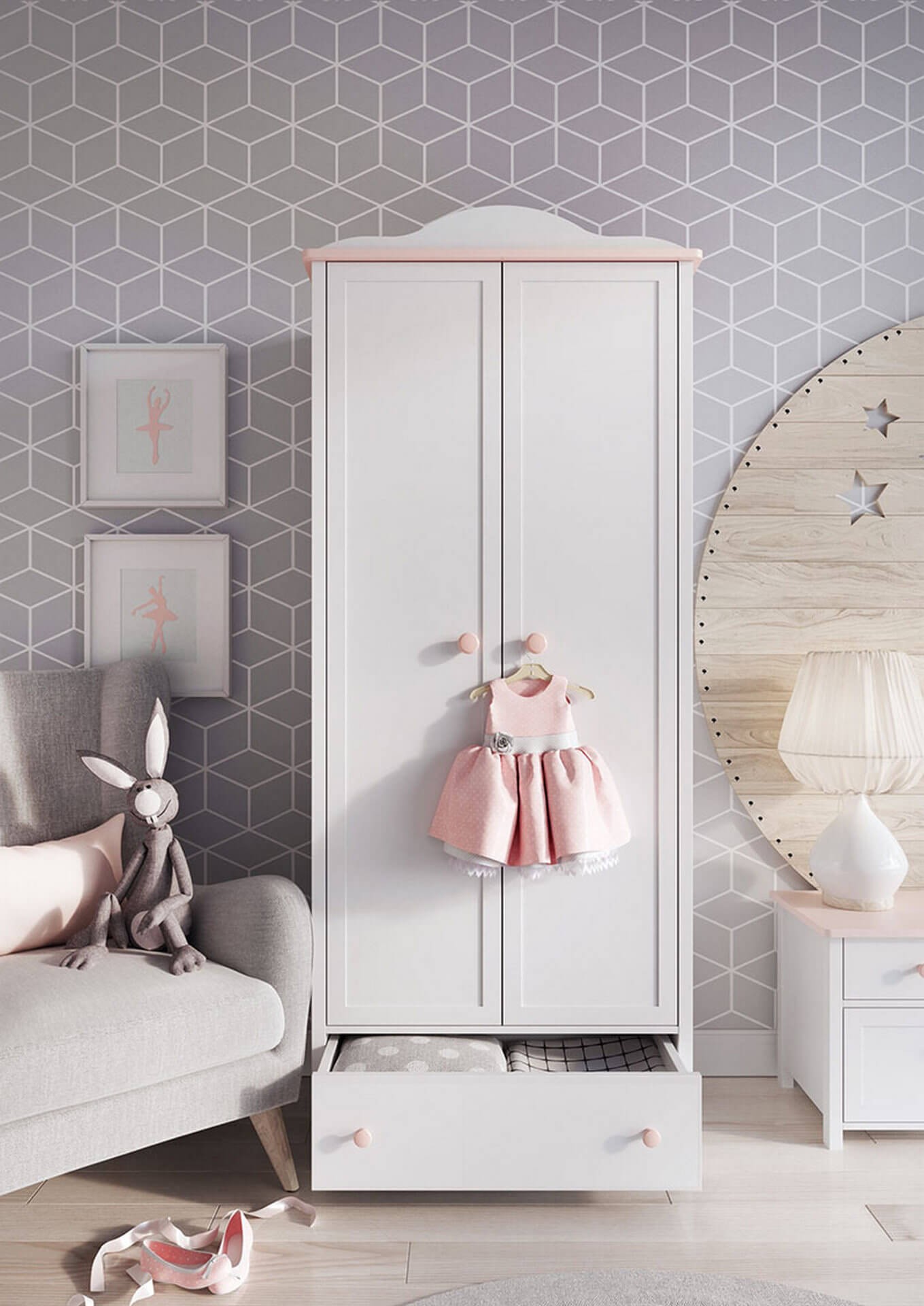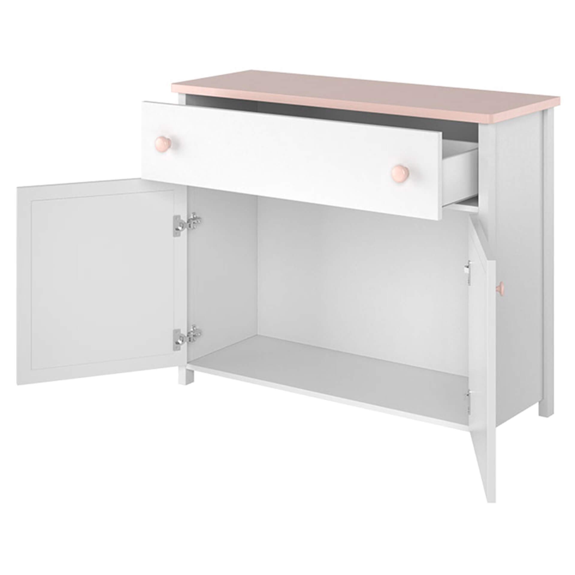 Proste, subtelne linie i śnieżnobiały front w połączeniu z różowymi wstawkami i uchwytami w formie gałki wyróżniają się magicznym urokiem, co sprawia, że kolekcja LUNA jest najlepszym wyborem do pokoju małej księżniczki. Jedną z popularnych brył jest komoda wyposażona w głęboką szufladę i pojemną szafkę do przechowywania. Bez względu na to, czy młoda kobieta potrzebuje miejsca na ubrania, kolekcje książek, podręczniki, sprzęt elektroniczny, zabawki, czy może inne drobiazgi - różne systemy do przechowywania pozwolą na wiele możliwości. Blat z powodzeniem można wykorzystać do wyeksponowania książek, ramek, roślin doniczkowych, dekoracji i zabawek. Mebel wykonany jest z trwałej i odpornej płyty laminowanej, której krawędzie dodatkowo wykończone są obrzeżem ABS, co pozwala uniknąć ewentualnych zadrapań, uszkodzeń i zarysowań.