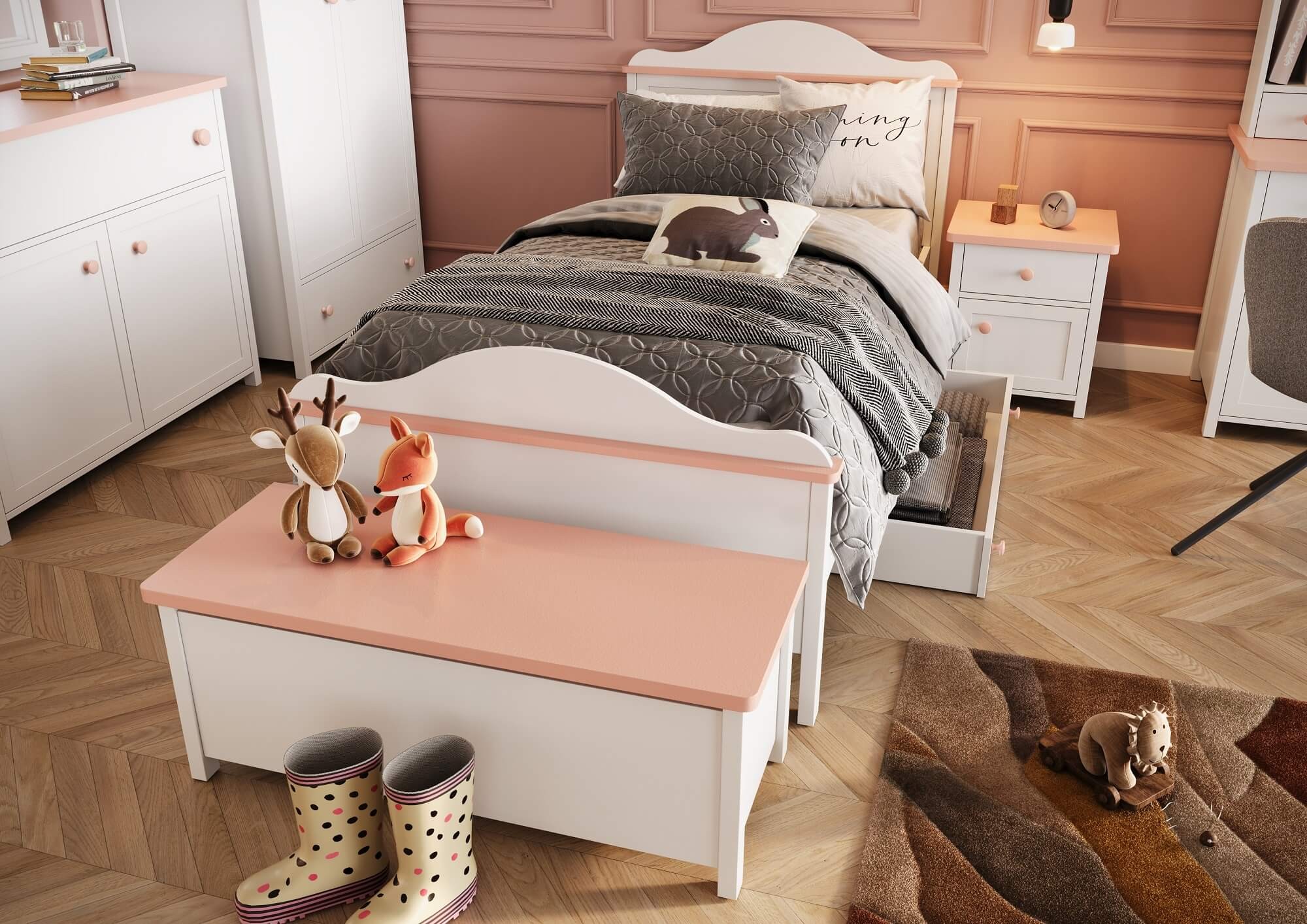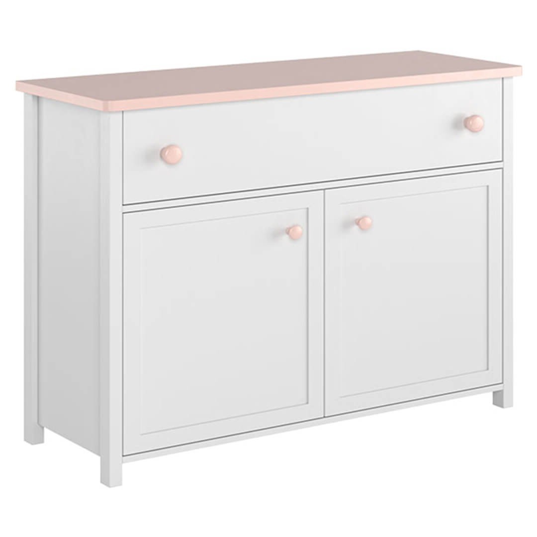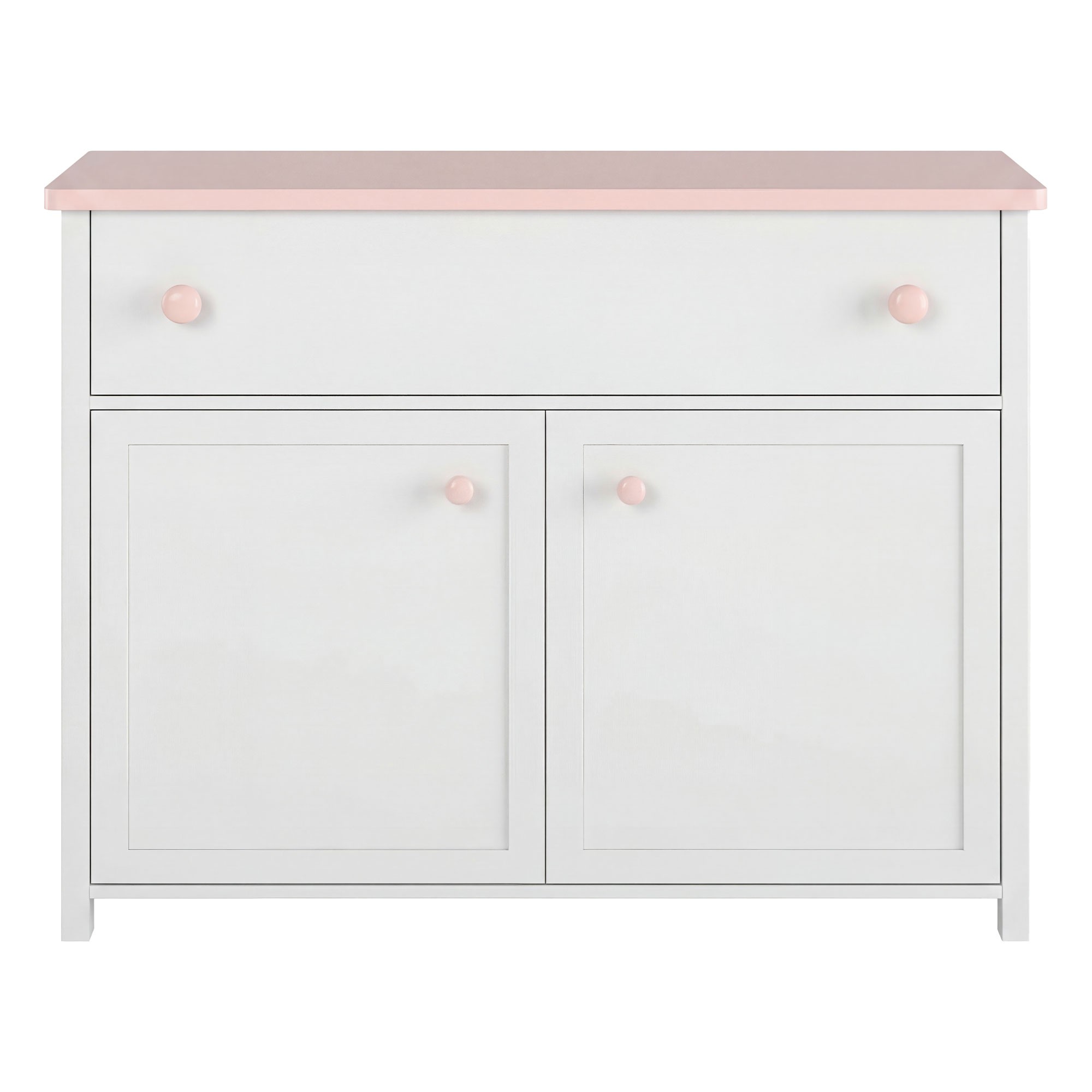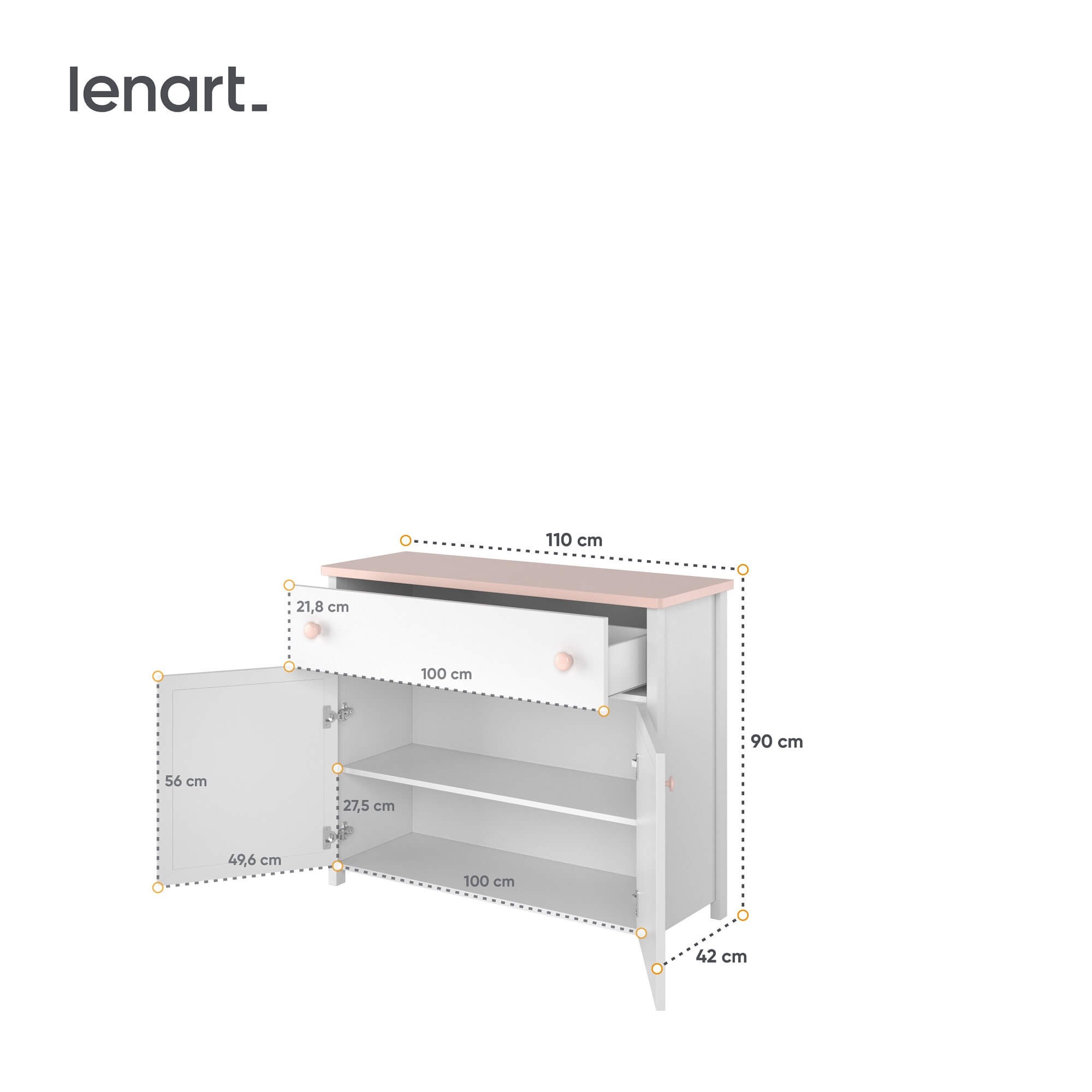 Proste, subtelne linie i śnieżnobiały front w połączeniu z różowymi wstawkami i uchwytami w formie gałki wyróżniają się magicznym urokiem, co sprawia, że kolekcja LUNA jest najlepszym wyborem do pokoju małej księżniczki. Jedną z popularnych brył jest komoda wyposażona w głęboką szufladę i pojemną szafkę do przechowywania. Bez względu na to, czy młoda kobieta potrzebuje miejsca na ubrania, kolekcje książek, podręczniki, sprzęt elektroniczny, zabawki, czy może inne drobiazgi - różne systemy do przechowywania pozwolą na wiele możliwości. Blat z powodzeniem można wykorzystać do wyeksponowania książek, ramek, roślin doniczkowych, dekoracji i zabawek. Mebel wykonany jest z trwałej i odpornej płyty laminowanej, której krawędzie dodatkowo wykończone są obrzeżem ABS, co pozwala uniknąć ewentualnych zadrapań, uszkodzeń i zarysowań.