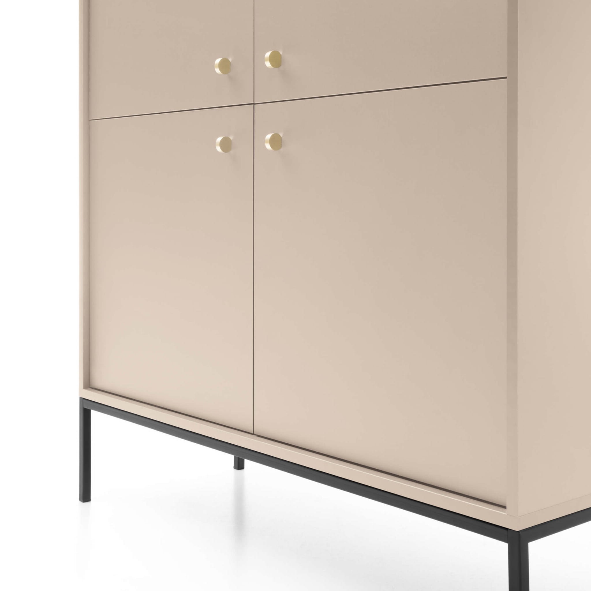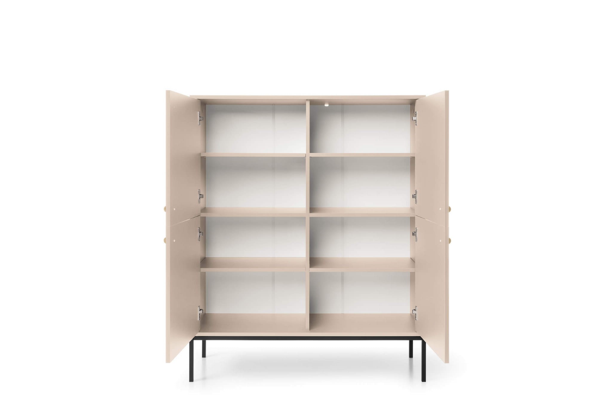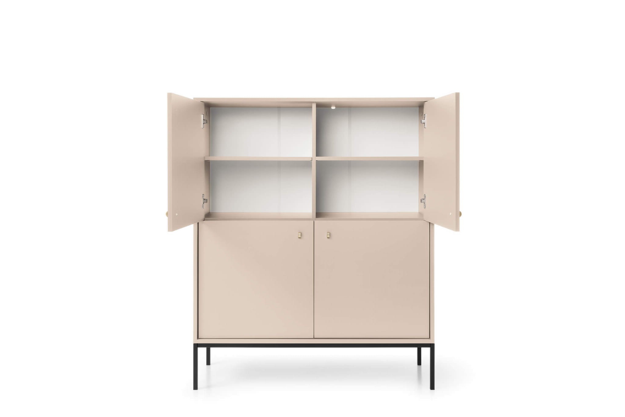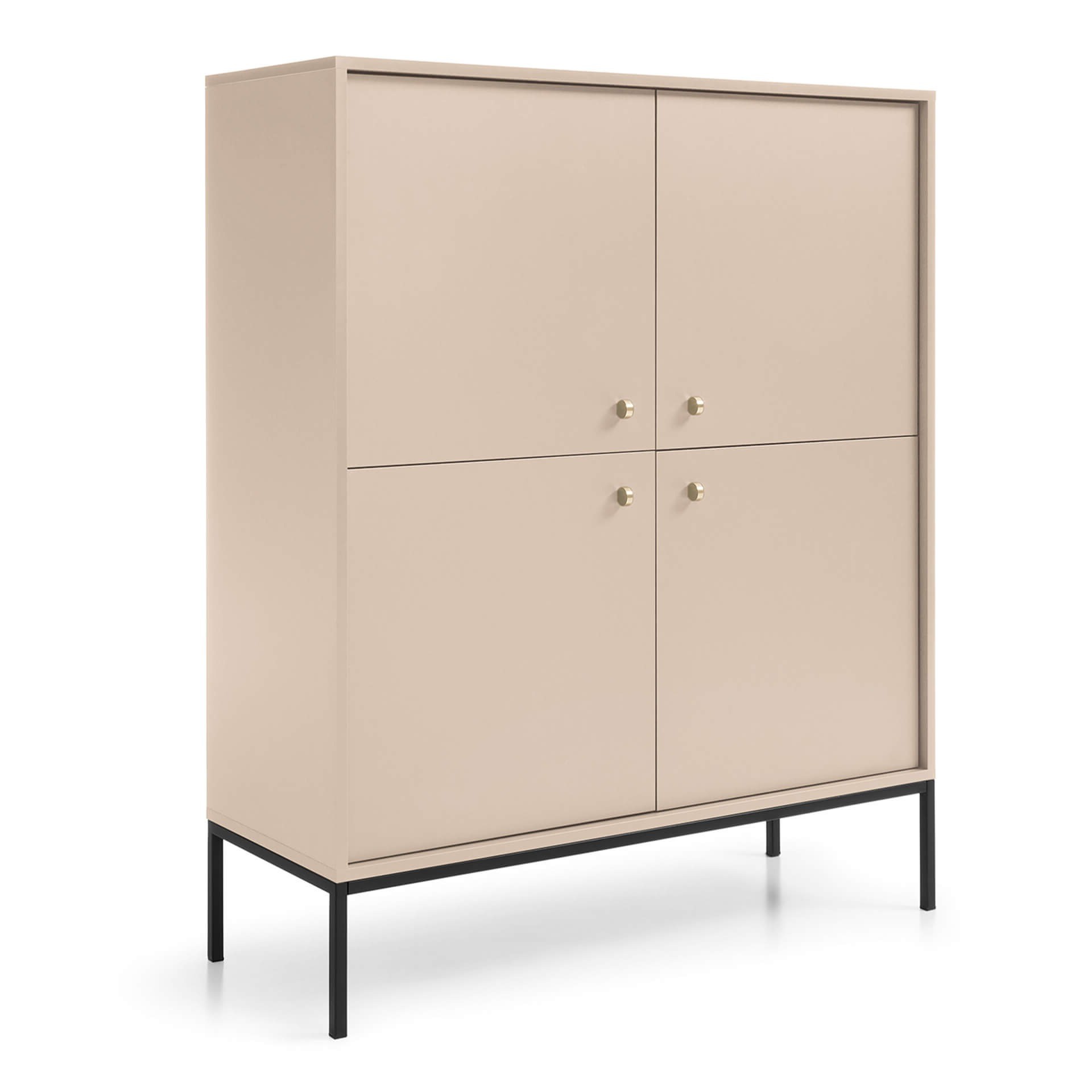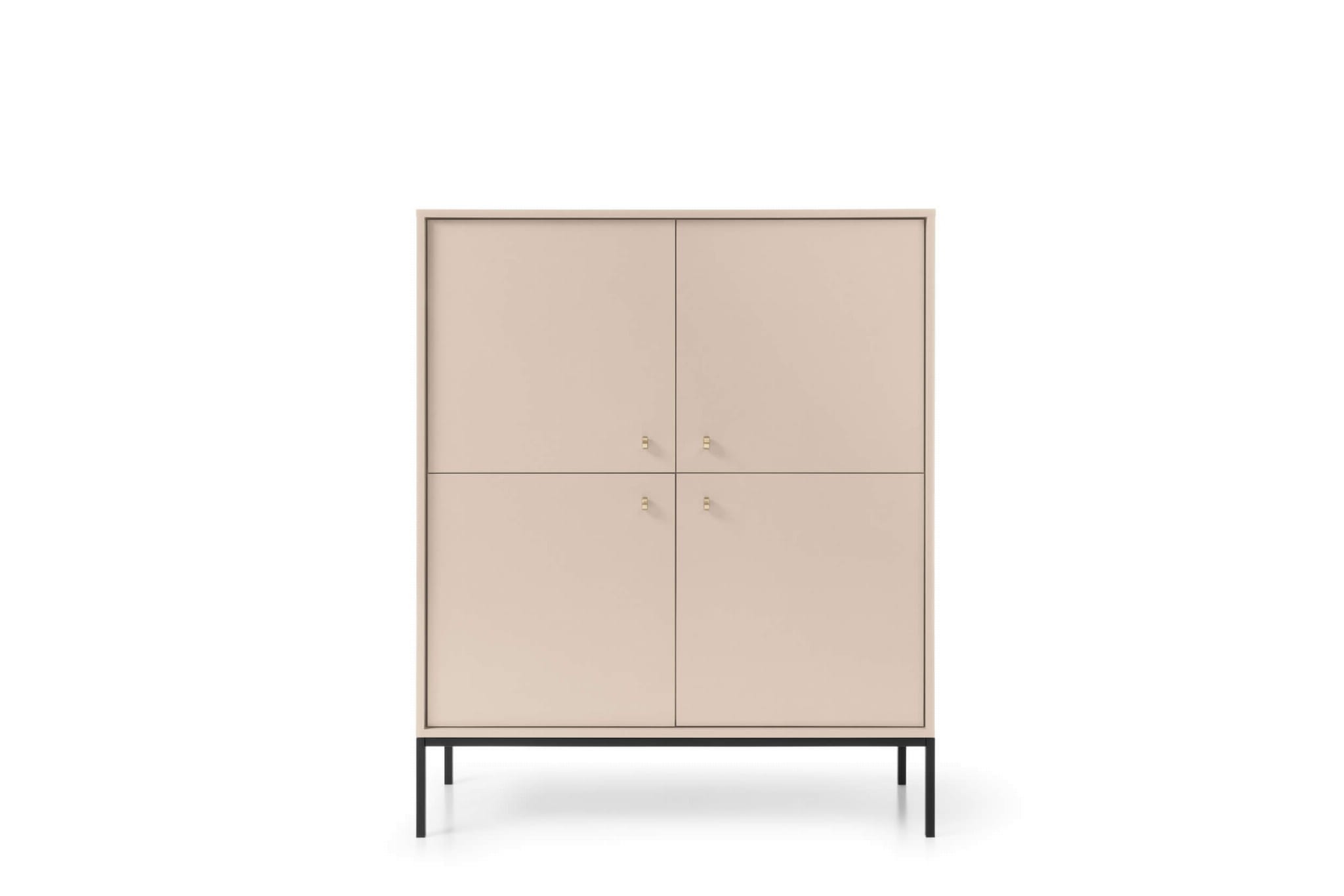 Wysoka, stylowa komoda beżowa na nóżkach prezentuje się wyjątkowo pięknie, czego zasługą jest zastosowanie tak nieoczywistego koloru. Beżowy front w lekkim połysku odświeży każdą aranżacją, dodaje jej przytulności i klasy. Złote, subtelne uchwyty podkreślają elegancki akcent komody, a wysokie, czarne nogi to świetny kontrast z całością. Wysokie nóżki malowane na czarno dodają lekkości i dzięki temu mebel nie przytłoczy mniejszych przestrzeni. Wysoka konstrukcja ułatwia także zachowanie porządku pod komodą czy wjazd robota sprzątającego. Komoda wyposażona jest w przestronną przestrzeń do przechowywania przedzieloną półeczkami i ukrytą za drzwiczkami. Tak pojemna wnęka z całą pewnością pomieści niezbędne akcesoria, przedmioty i drobiazgi w zależności od tego, jaki kącik chcesz zaaranżować.