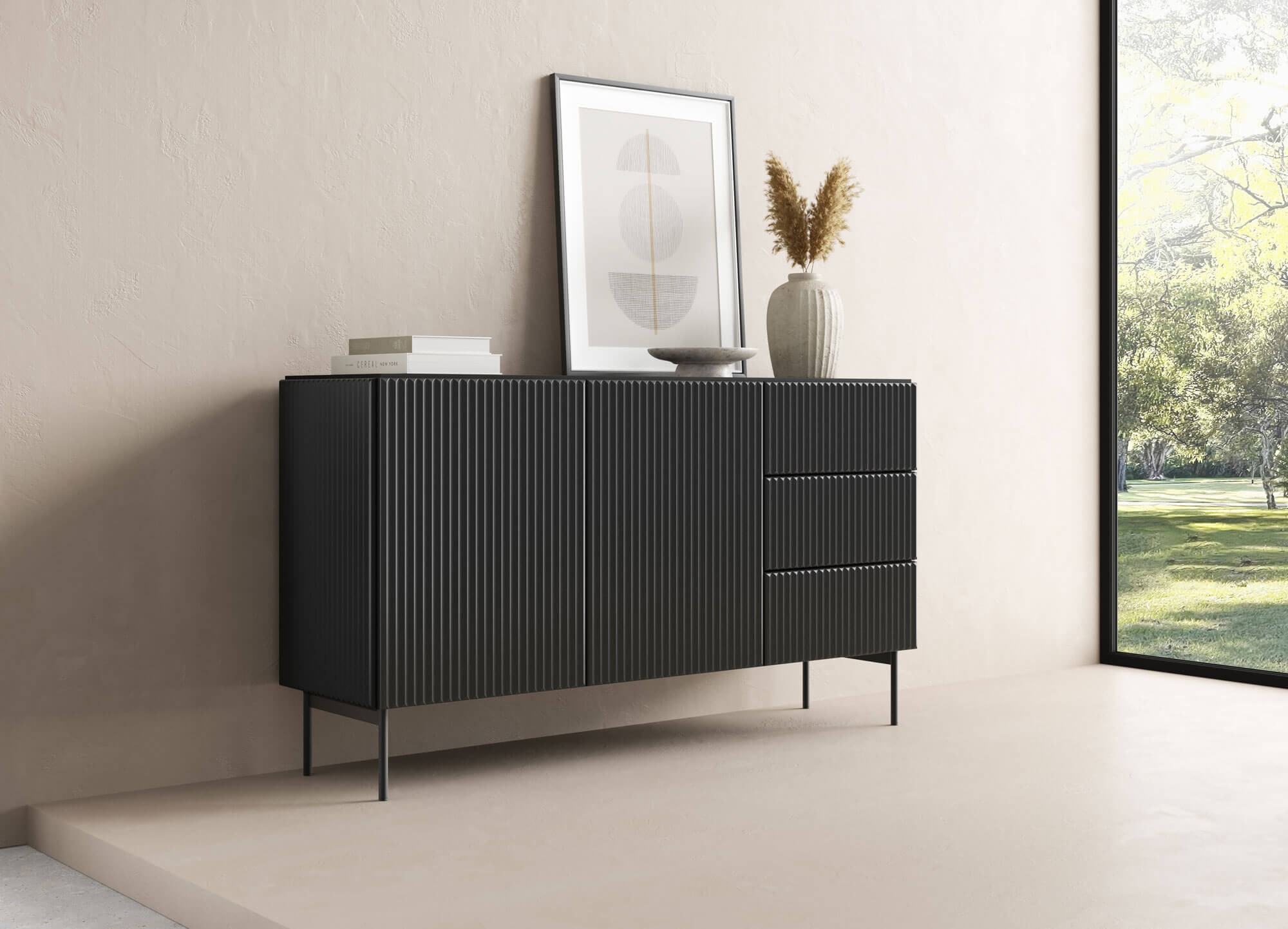Komoda 147 2D3S MUTI czarny to stylowy i funkcjonalny mebel, który idealnie łączy elegancję z praktycznym zastosowaniem. Jej stabilna konstrukcja osadzona na metalowych nogach zapewnia trwałość i solidność, a wysokiej jakości płyta meblowa użyta do wykonania korpusu i frontów gwarantuje długowieczność oraz odporność na codzienne użytkowanie. Wyjątkowego charakteru dodają jej fronty zdobione nowoczesnym frezowaniem w formie pionowych lameli, które przyciągają wzrok i wprowadzają do wnętrza odrobinę luksusu. Czarna komoda MUTI to mebel, który doskonale wpisuje się w klimat nowoczesnych aranżacji, a jej minimalistyczny design podkreśla elegancję i ponadczasowy charakter wnętrza. Funkcjonalny układ sprawia, że jest niezwykle praktyczna – trzy pojemne szuflady z pełnym wysuwem pozwalają uporządkować drobne akcesoria i codzienne przedmioty, a dwie zamykane szafki z półkami ułatwiają przechowywanie większych elementów, zapewniając ład i harmonię w domu. Dzięki swojej uniwersalności komoda MUTI świetnie odnajdzie się zarówno w salonie, jadalni, jak i sypialni, oferując nie tylko przestrzeń do przechowywania, ale także designerski akcent, który podniesie estetykę całego wnętrza. Gładka i łatwa w pielęgnacji powierzchnia sprawia, że mebel na długo zachowuje swój elegancki wygląd, a wysokie nóżki nadają mu lekkości i sprawiają, że całość prezentuje się wyjątkowo nowocześnie. Decydując się na komodę 147 2D3S MUTI czarny, wybierasz mebel, który łączy w sobie funkcjonalność, trwałość i wyjątkowy styl, stając się nie tylko praktycznym miejscem do przechowywania, ale również efektowną ozdobą wnętrza, która zachwyci domowników i gości.